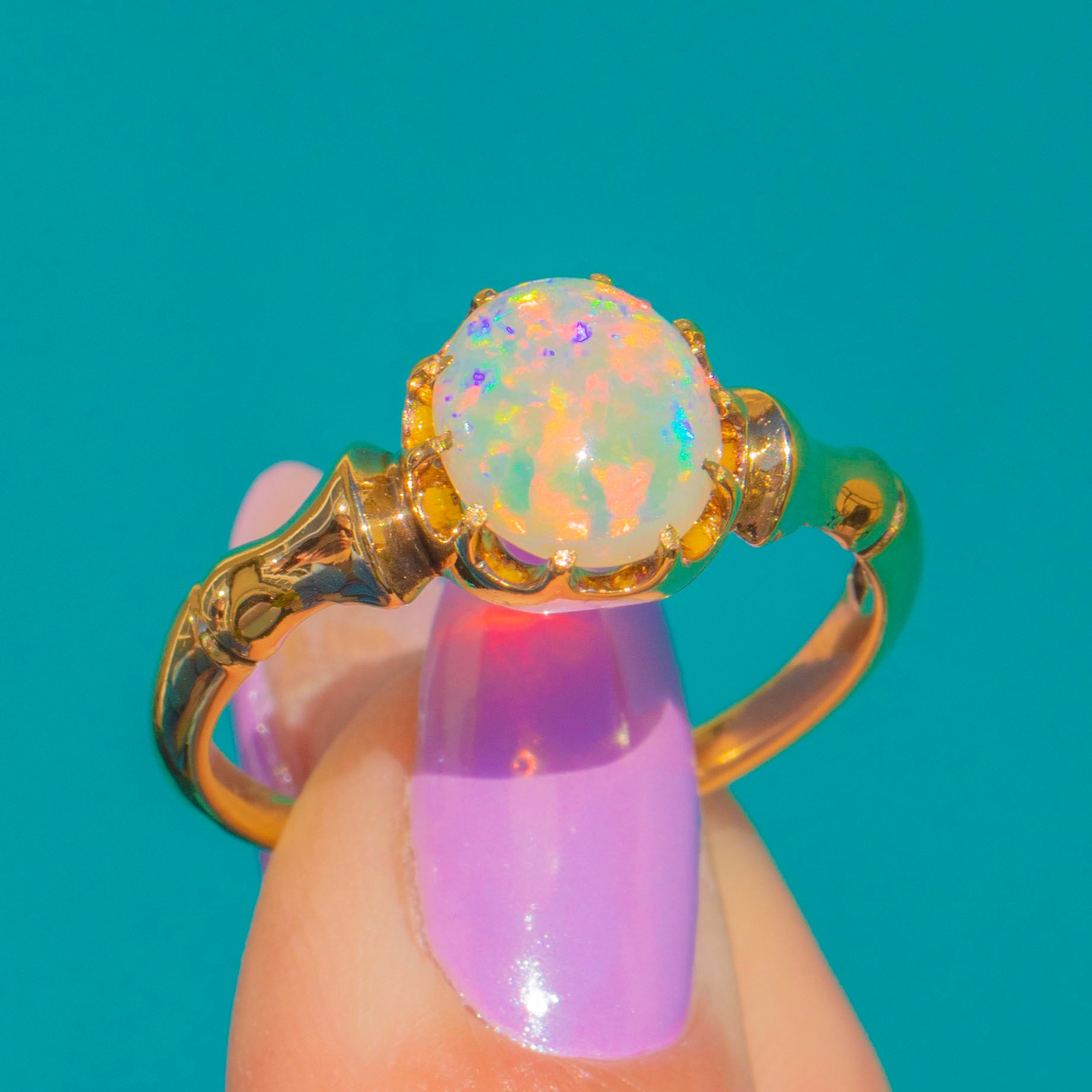 EXCELLENT: The Opal displays magnificent play of colour and sits securely within its crown setting, with no chips, abrasions, or visible wear. The 18ct Gold retains a bright, saturated polish throughout with no notable nicks or scuffs, and the shank remains true and well-shaped. A beautifully preserved antique, ready to be enjoyed for many years to come.