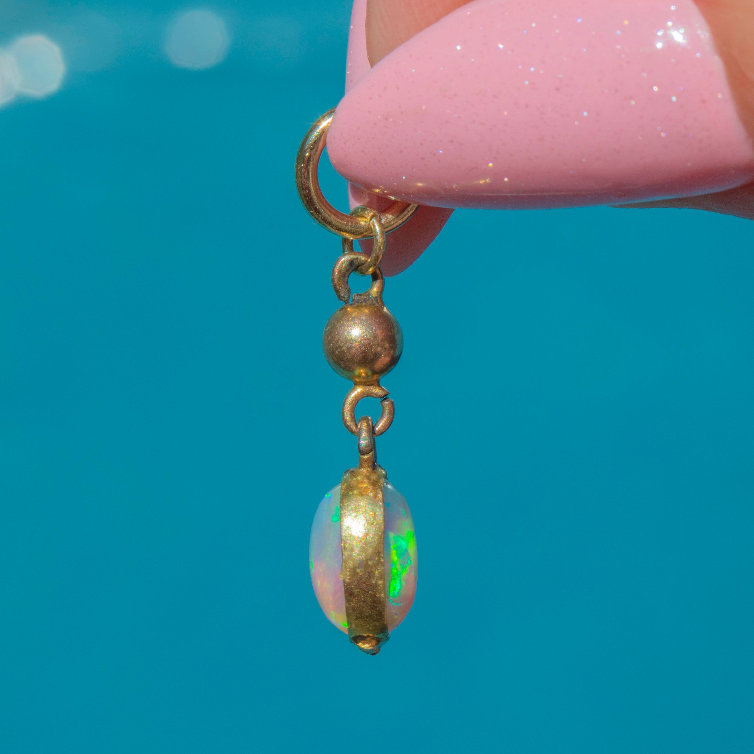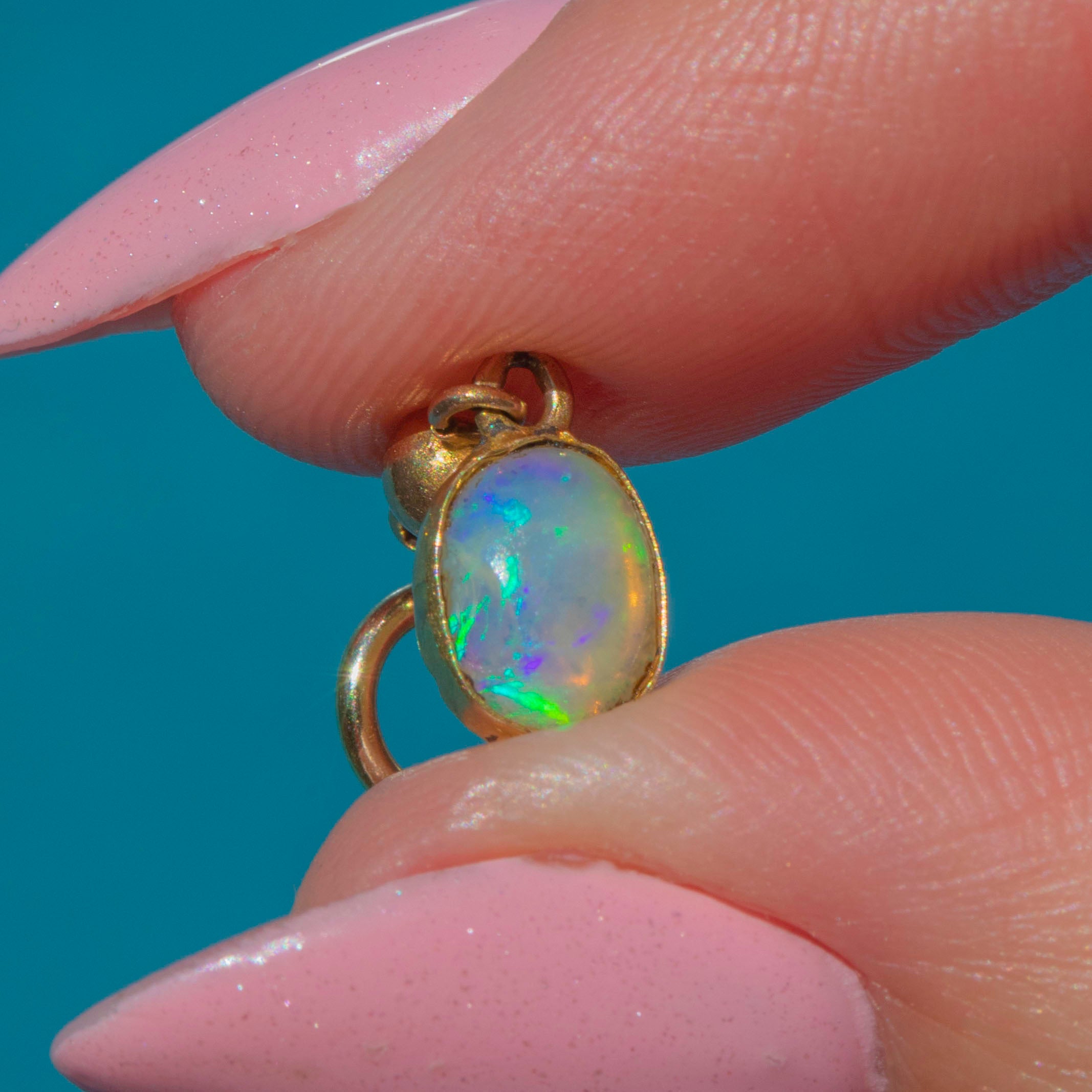 GOOD-VERY GOOD: This dainty antique 18ct Gold Opal charm is in great condition. The Opals are radiant and full of mesmerising colour, set securely within their bezel. There are some signs of wear to the Gold though this is commensurate with age. With a securely soldered jump ring, this charm can be worn with confidence!