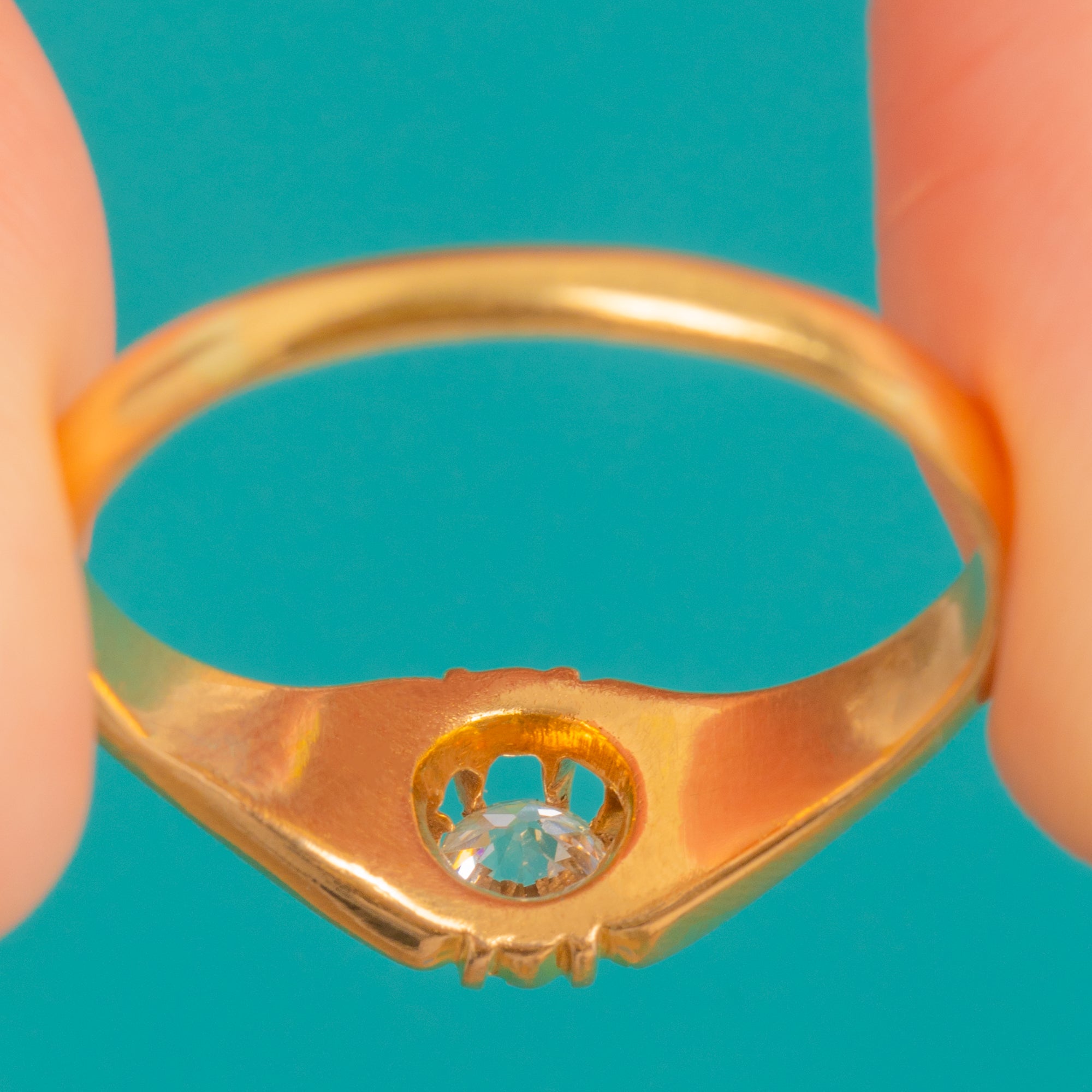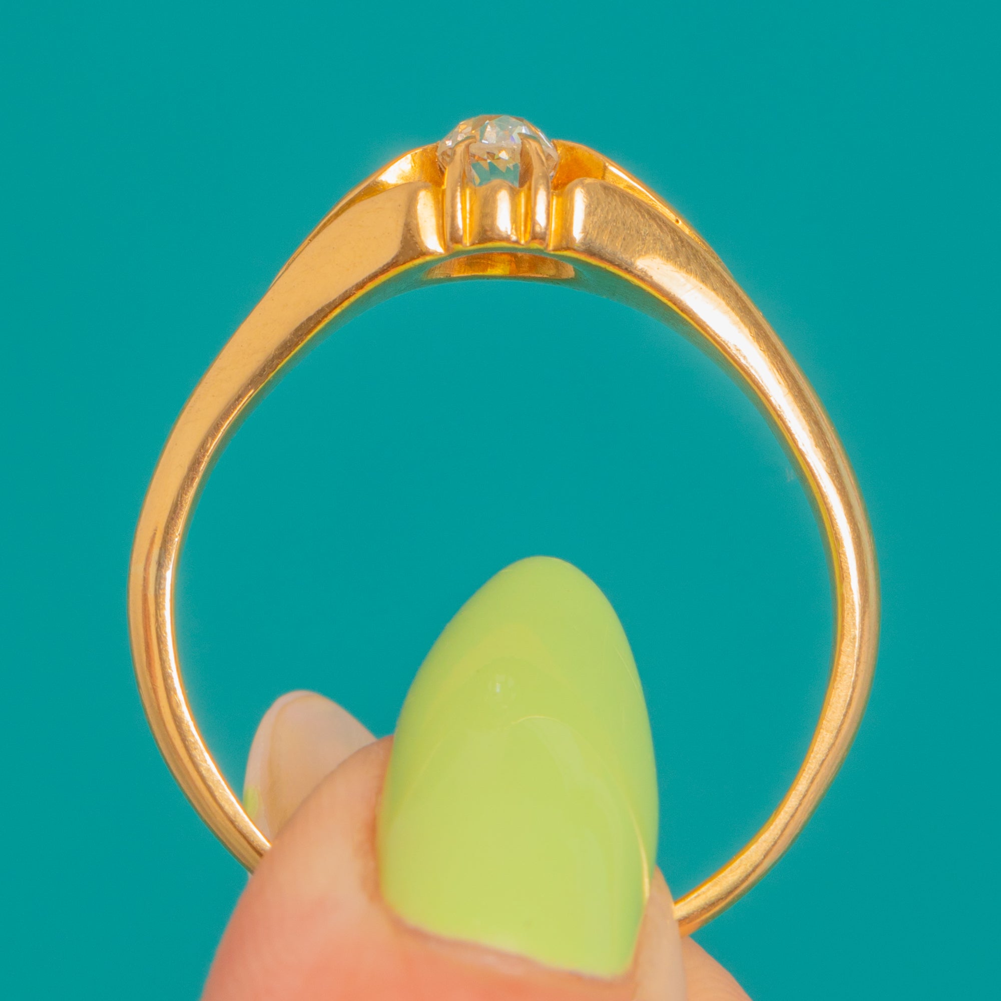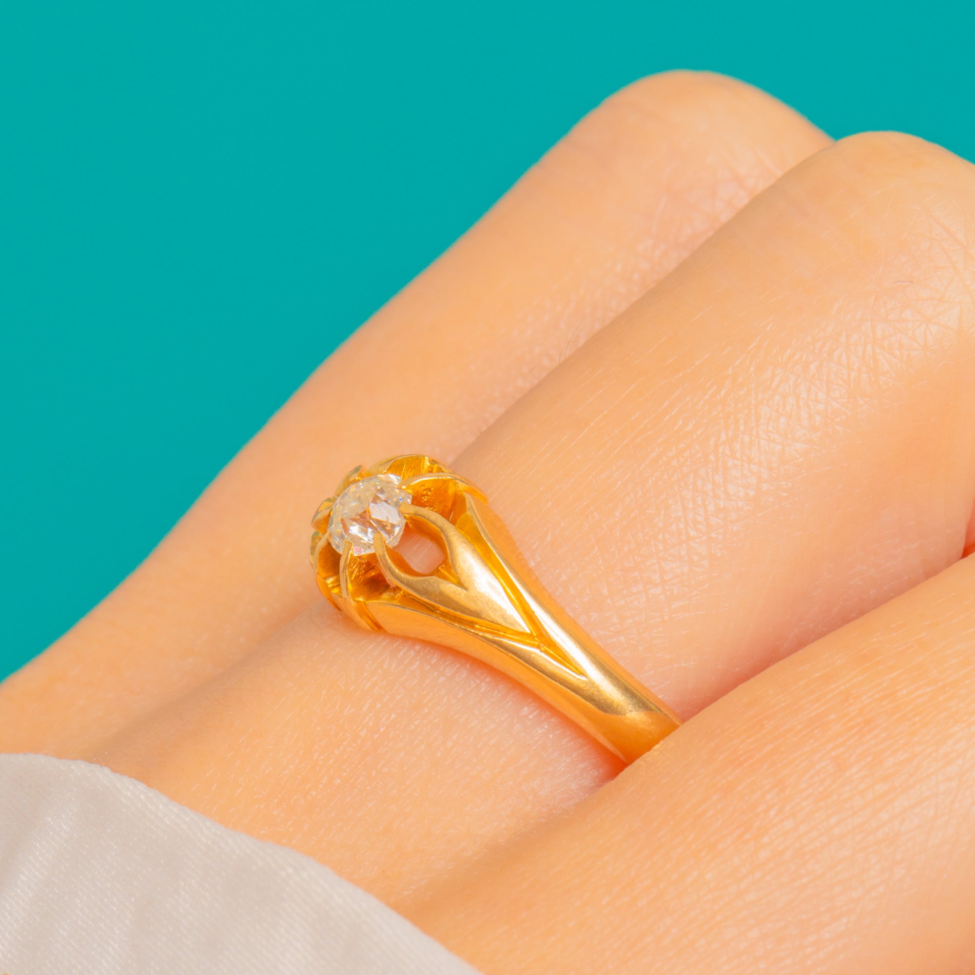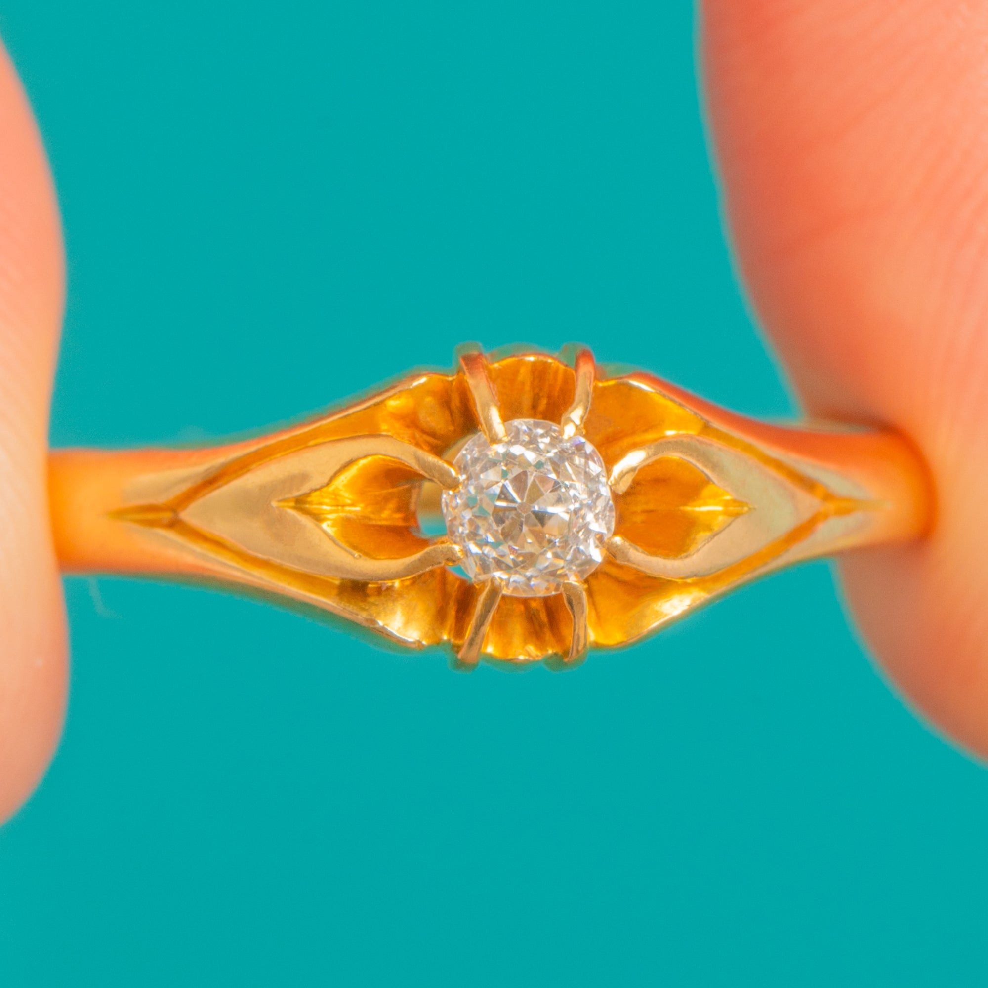Quintessentially Victorian, this 18ct Gold Belcher “buttercup” ring blooms with an Old Mine-cut Diamond of approximately 0.25ct. The cushion-shaped stone sits at the heart of a scalloped buttercup setting, catching the light with that romantic, antique sparkle we adore.