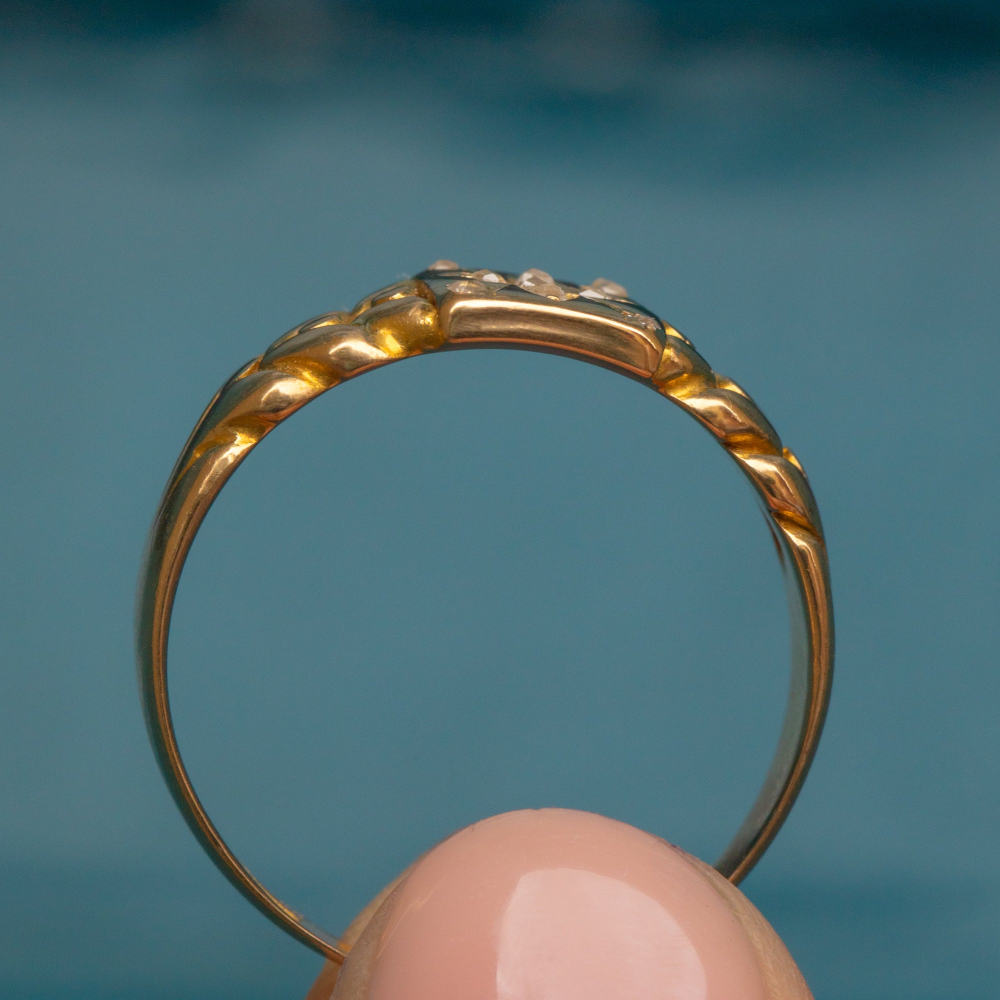Add a touch of Victorian charm to your ring stack with this exquisite antique 18ct Gold Diamond star keeper ring! Crafted from sumptuous 18ct Gold and displaying a twinkling Diamond at her centre, this Victorian ring features woven details on the shoulders that were so typical of keeper rings.
