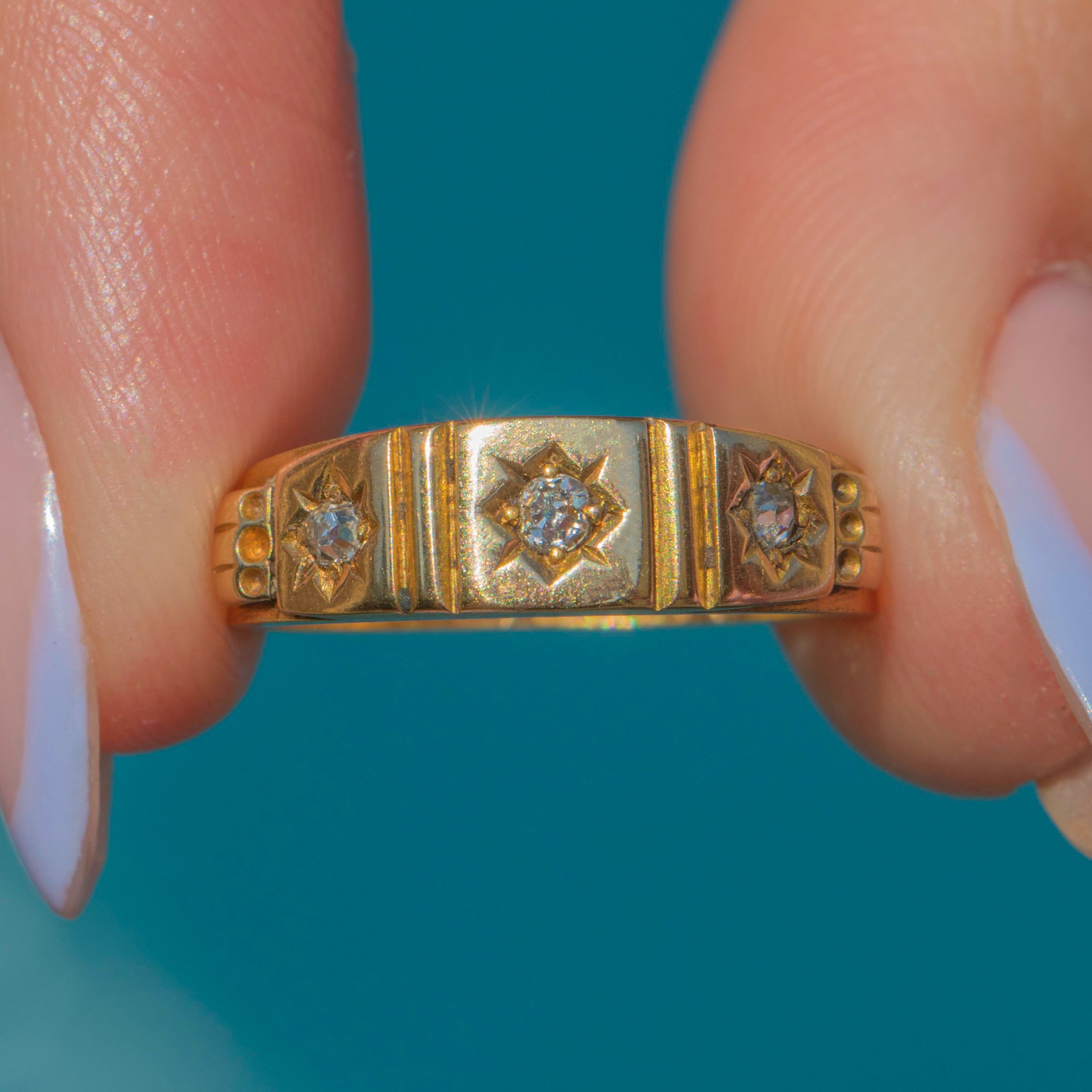 VERY GOOD: This antique 18ct Gold Diamond three stone gypsy ring is in very good condition. The Gold is bright and the engraved details have remained crisp and defined. There is some wear throughout, most notably on the inside of the band, and the date letter has been lost over time, but this does not detract from the overall impact of the piece. The Diamonds are all secure in their settings and free from surface wear. With plenty of life left in her, this Victorian Diamond gypsy ring will soon become a staple in your repertoire!