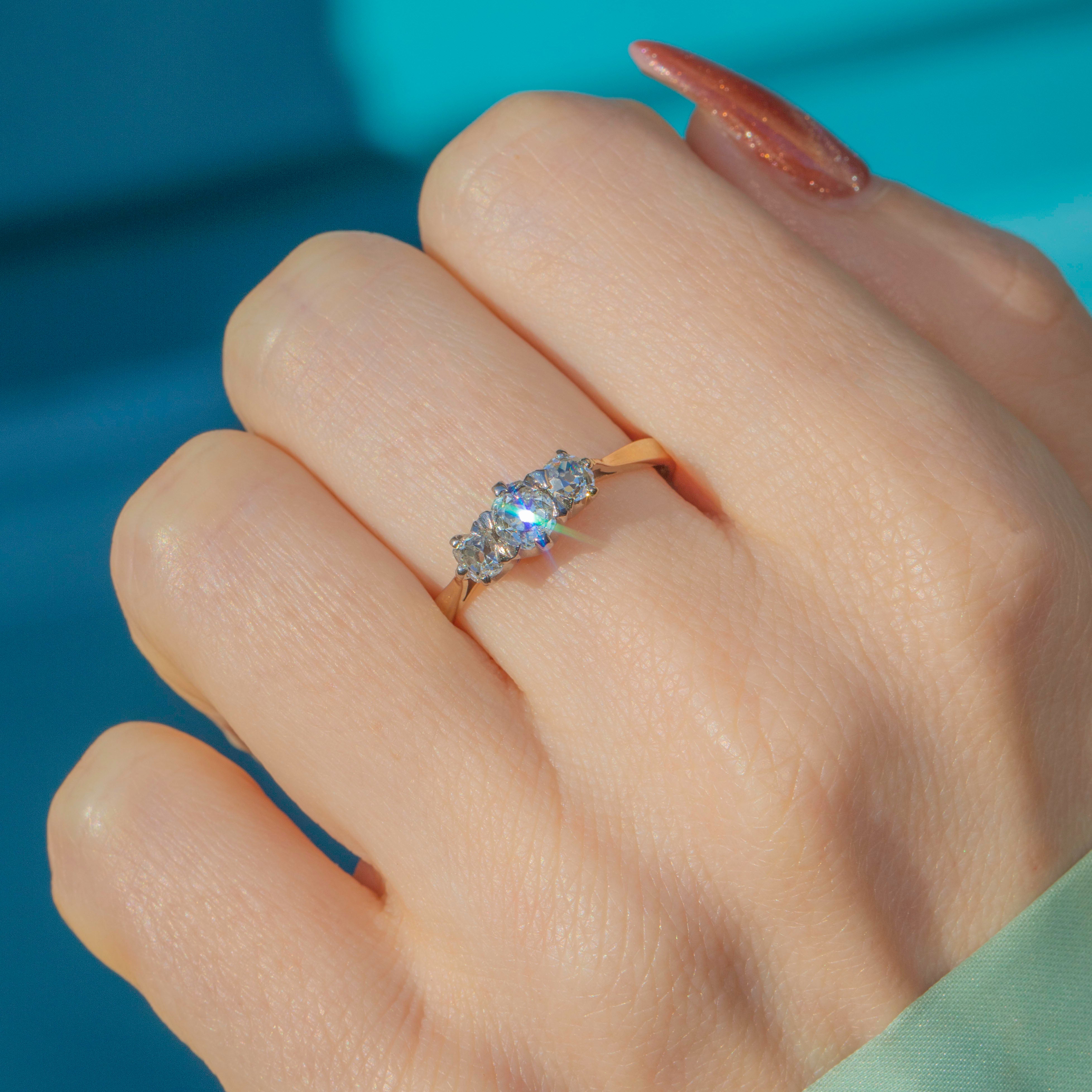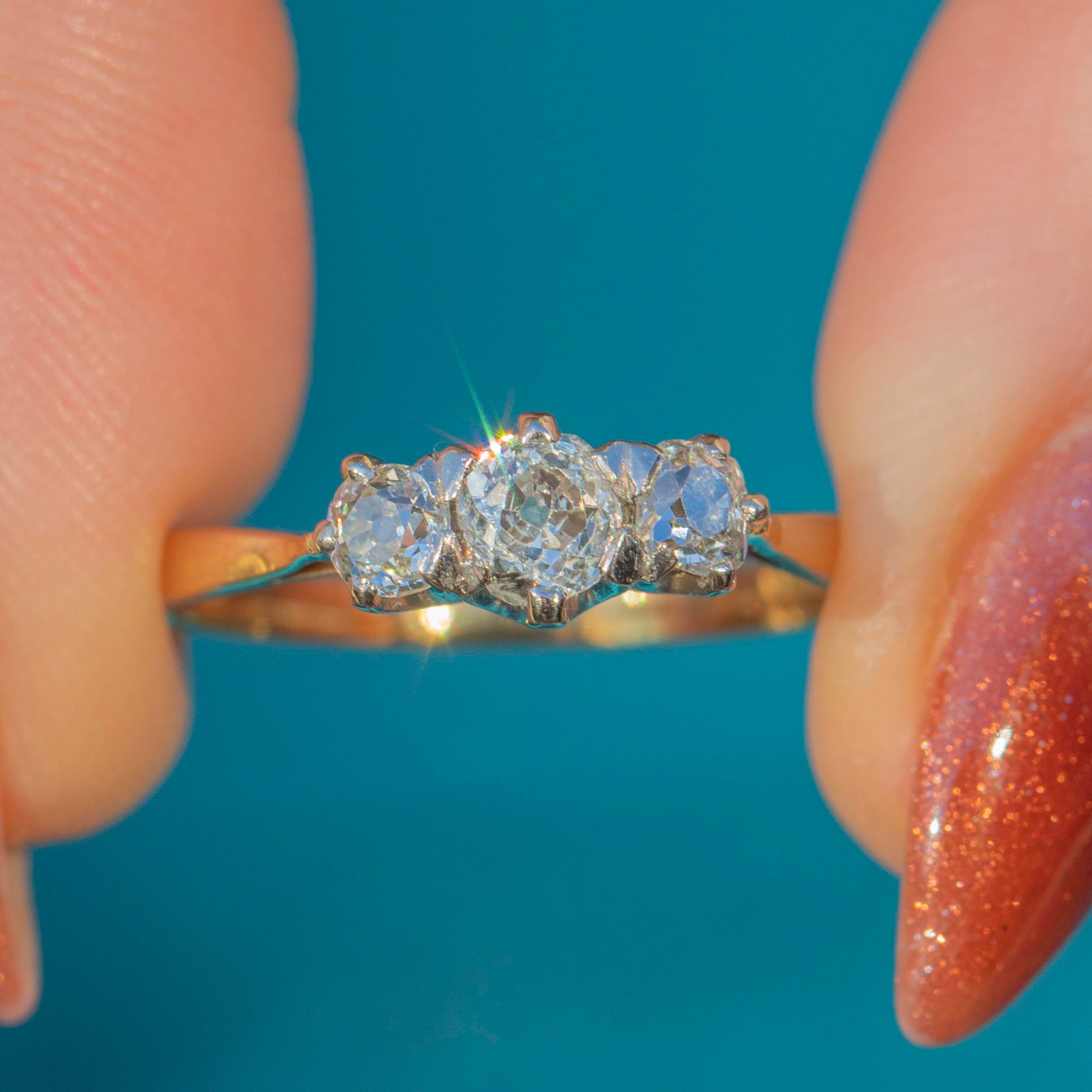 A gorgeous antique 18ct Gold Diamond trilogy ring! The three graduating old-mine-cut Diamonds boast beautifully cut facets that dazzle beneath the light, set in lustrous 18ct White Gold settings to emphasise their size and splendour!