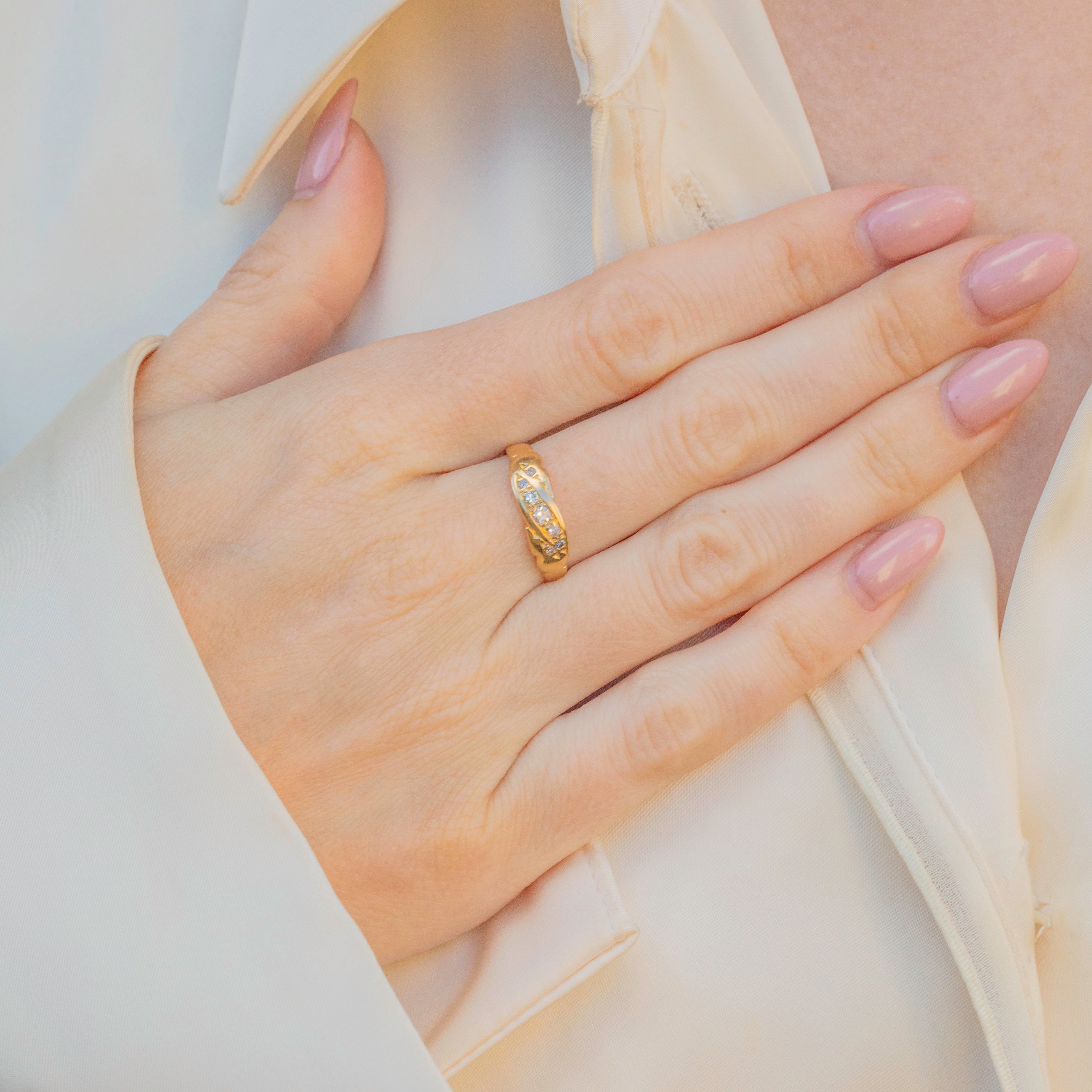 EXCELLENT. This lovely antique 18ct Gold Diamond twist ring is in perfect condition throughout. The Diamonds are clean and bright and set securely in tidy settings. The Gold is buttery and the band is smooth, feeling comfortable and robust.
