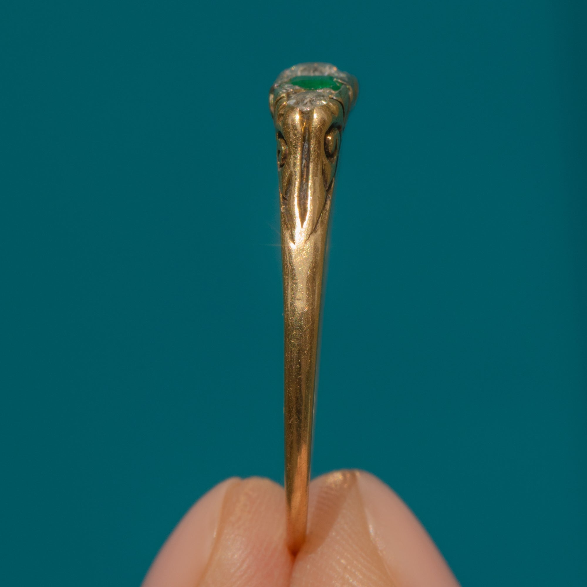 VERY GOOD- EXCELLENT.  This incredible 18ct Gold Emerald Diamond five stone ring is in wonderful condition throughout. The solid 18ct Gold mount is stunning, free from any dents or scratches to note and the scroll-work gallery is still just as beautiful as it was 100 years ago.  Her scrolled settings are intact and all of the gemstones are securely set. Although the back of the band has thinned slightly with age, she has remained robust enough to wear daily with care for many years to come! The Emeralds and Diamonds are all natural and earth-mined, bright and beautifully kept.