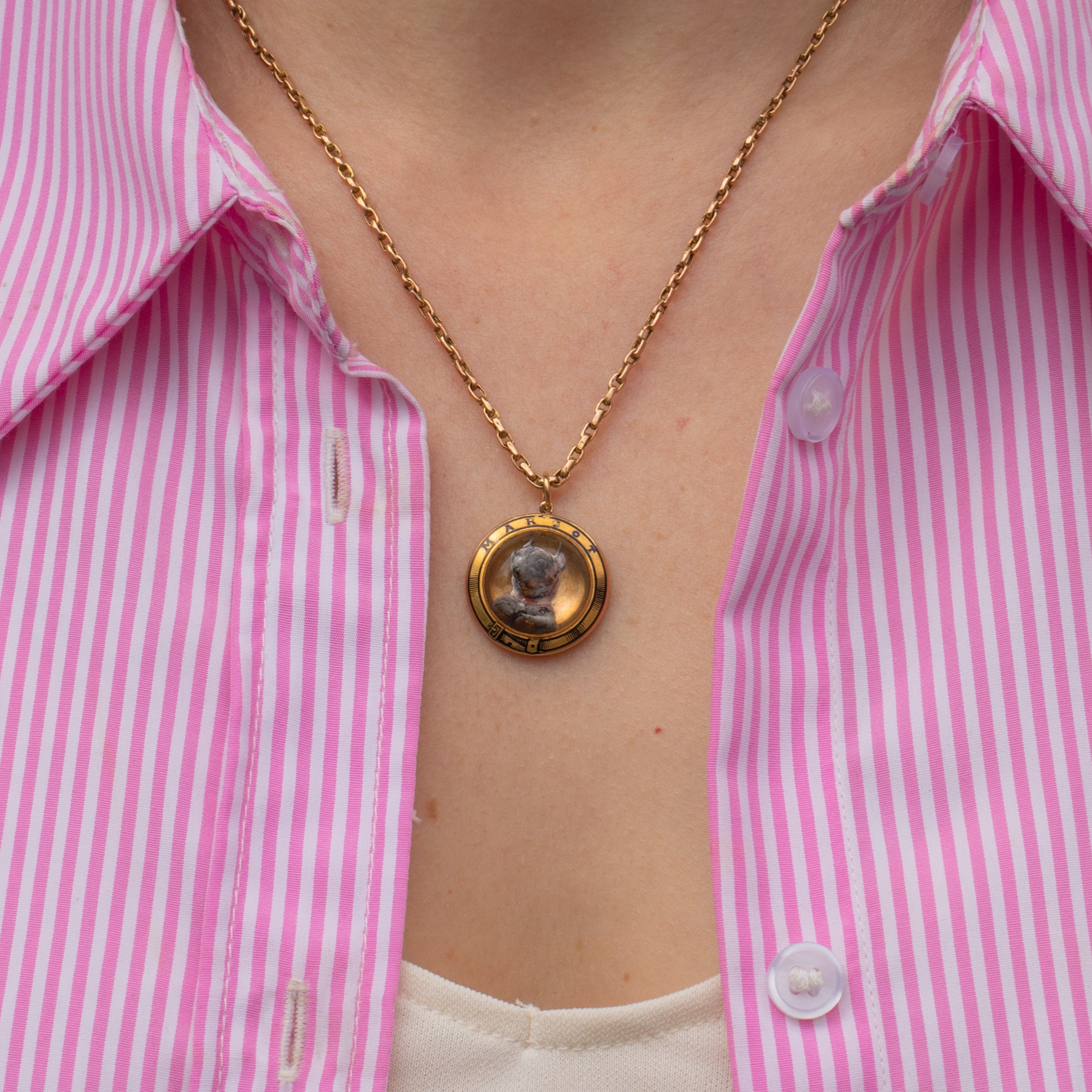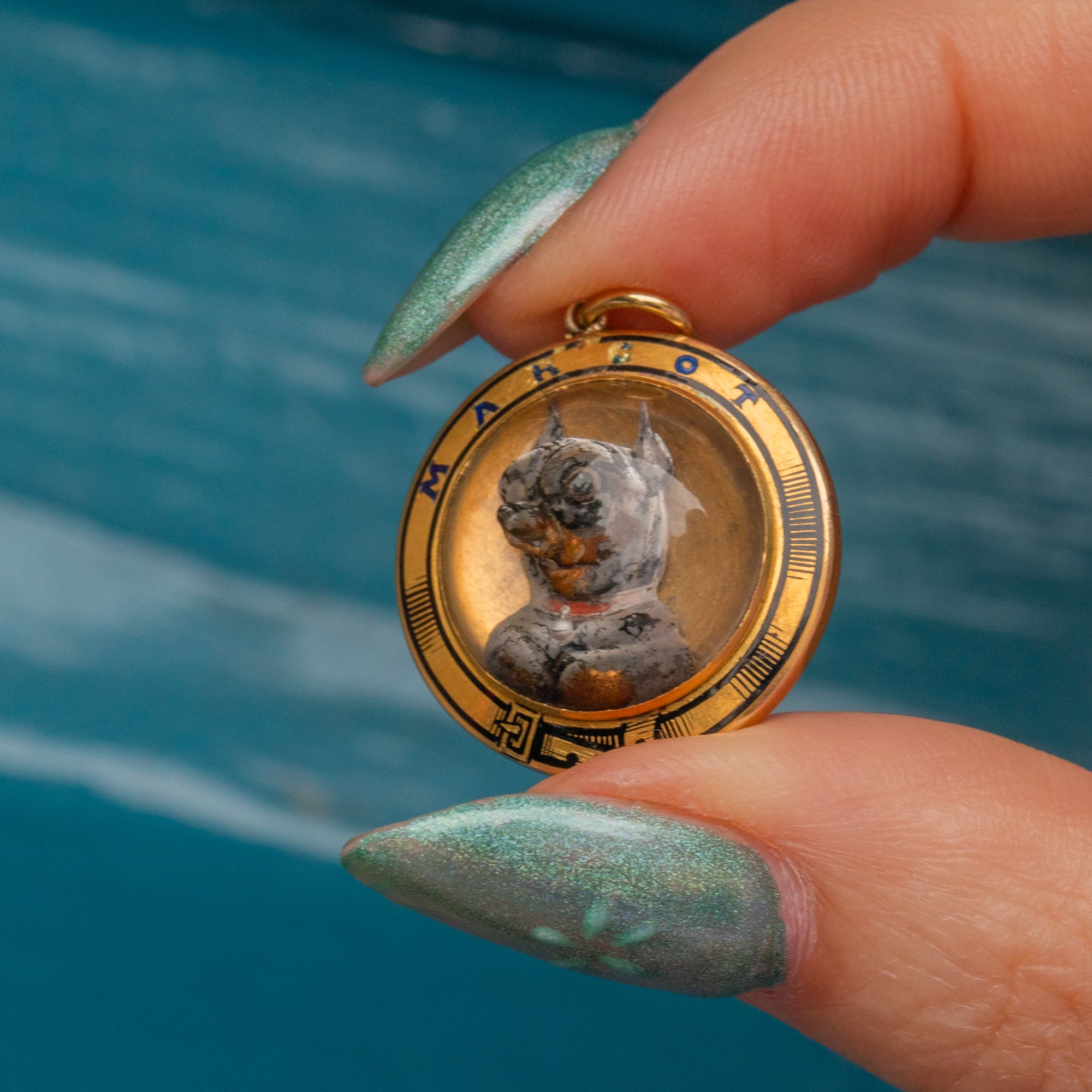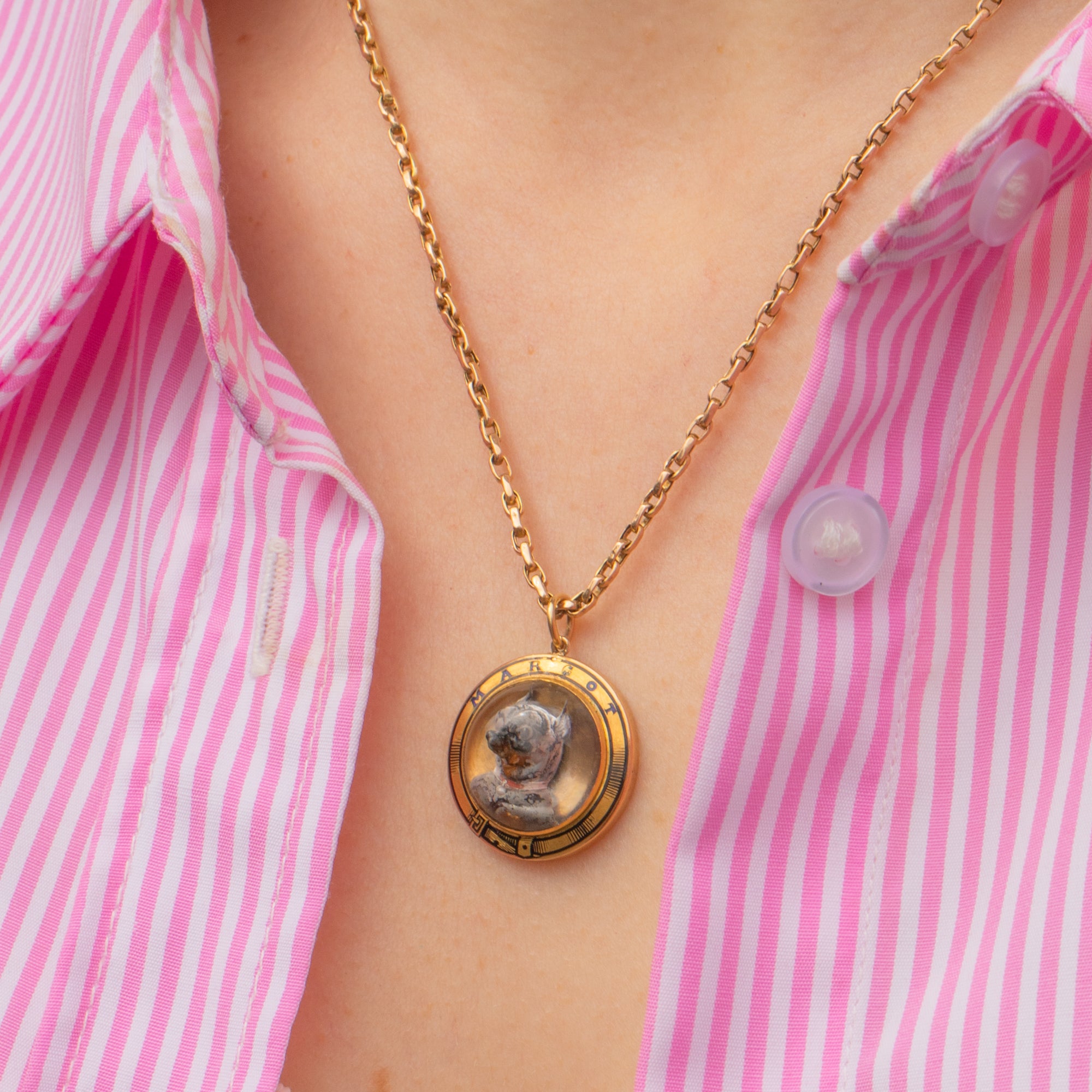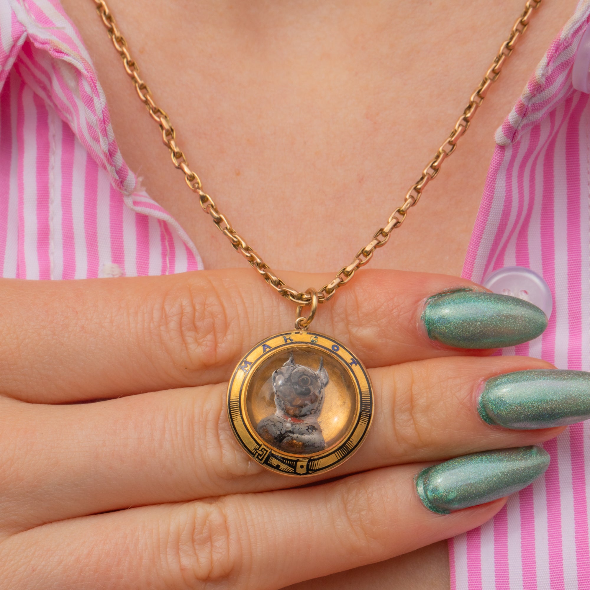 VERY GOOD-EXCELLENT. This antique 18ct Gold Essex Crystal dog pendant is in beautiful condition throughout. The Essex Crystal is completely polished, with no signs of scuffs, scratches or nicks to its settings. The 'G' in the word 'Margot' has worn slightly, but other than that her Enamel is superb! There are a few subtle scratches to the back of the pendant, but this is unnoticeable when worn. Plus, the little chihuahua's face is completely immaculate.