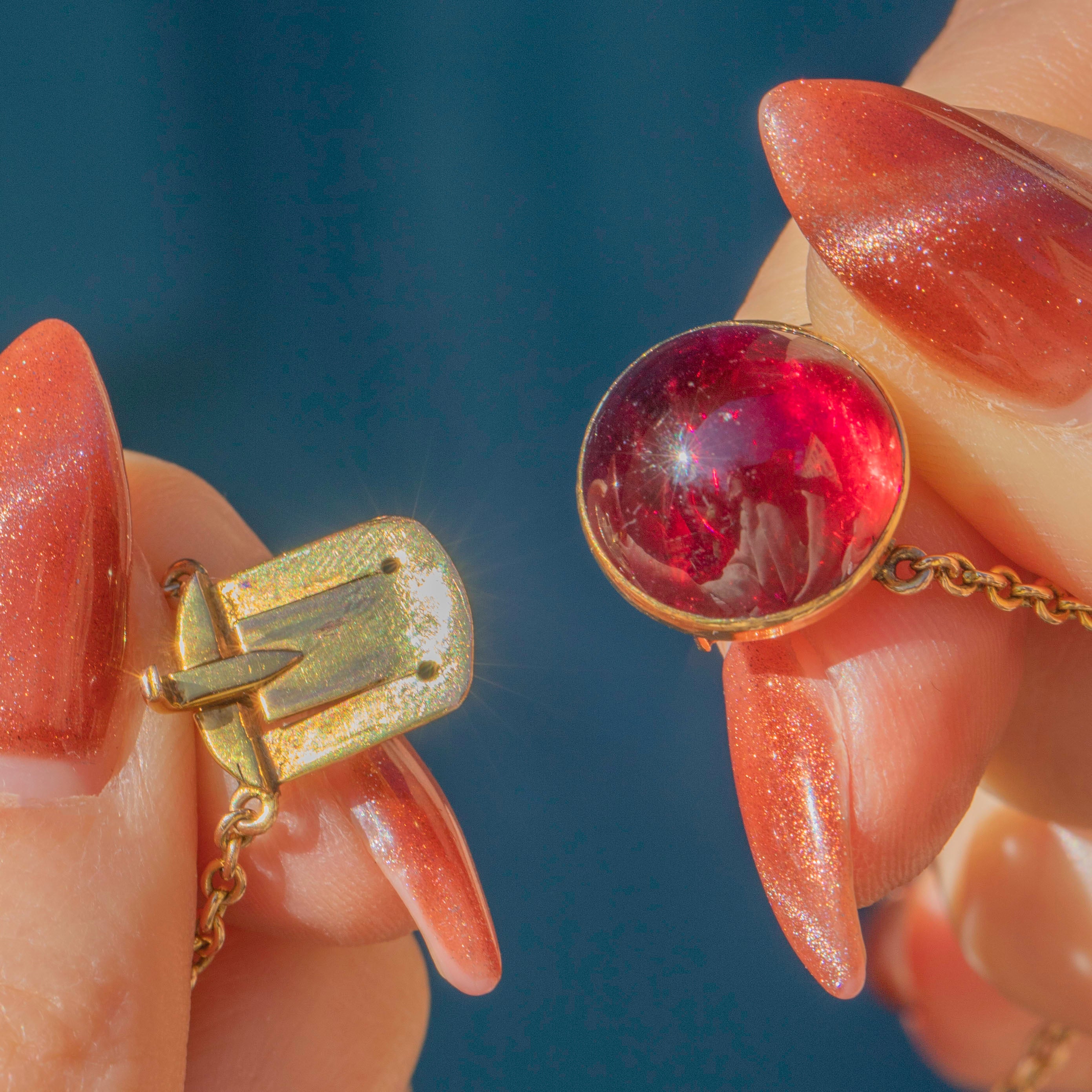 We are obsessed with this antique 18ct Gold Garnet cabochon bracelet! Boasting 89.00ct of cherry red cabochon cut Garnets, each one has been foiled to perfection, making this bracelet a delectable treasure!
