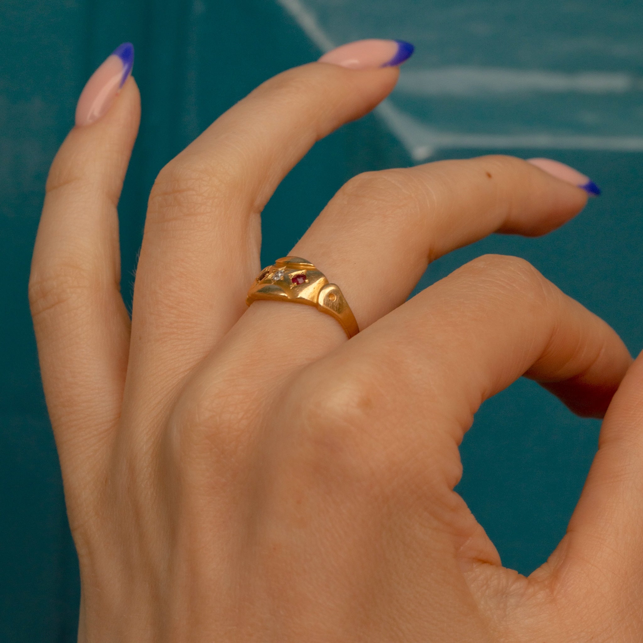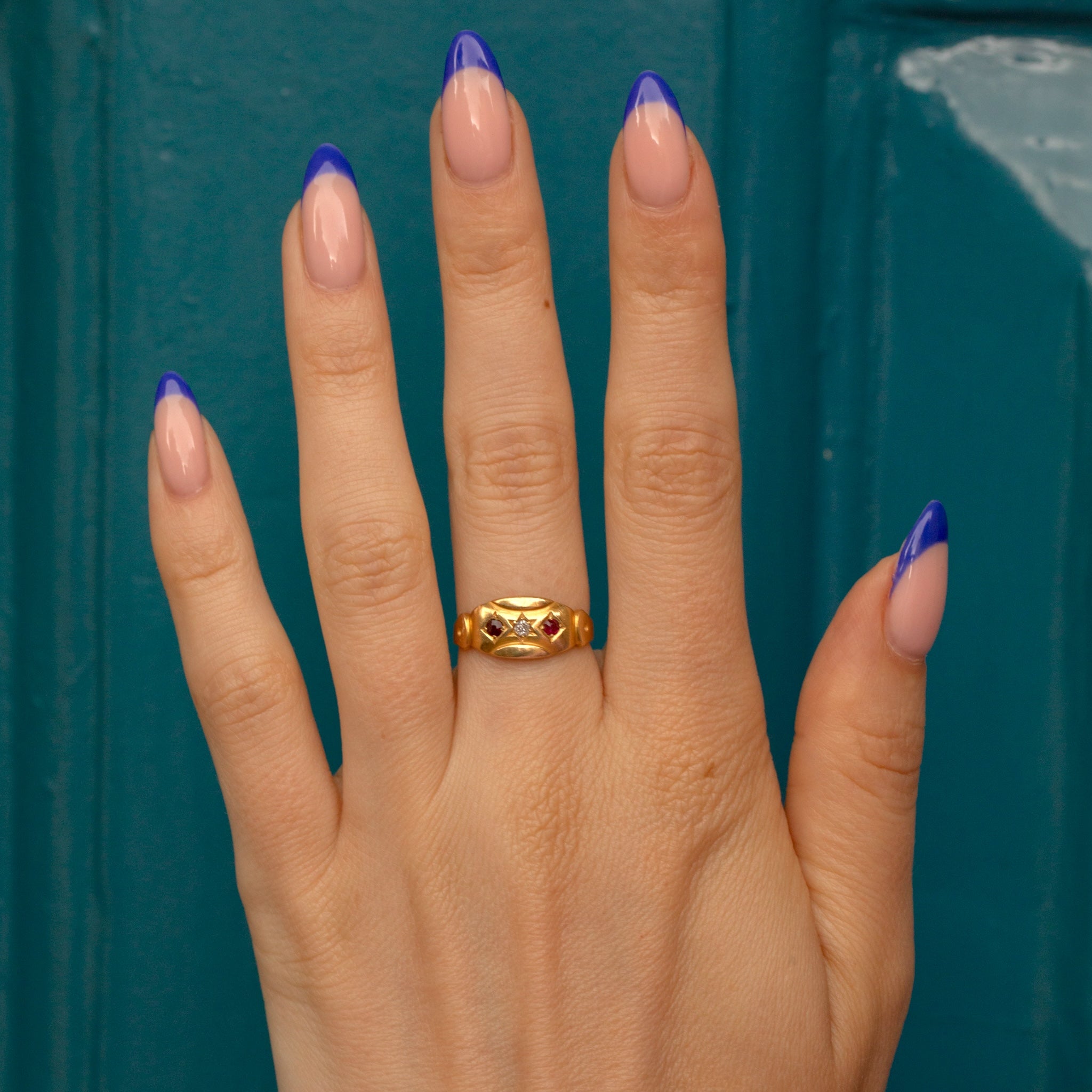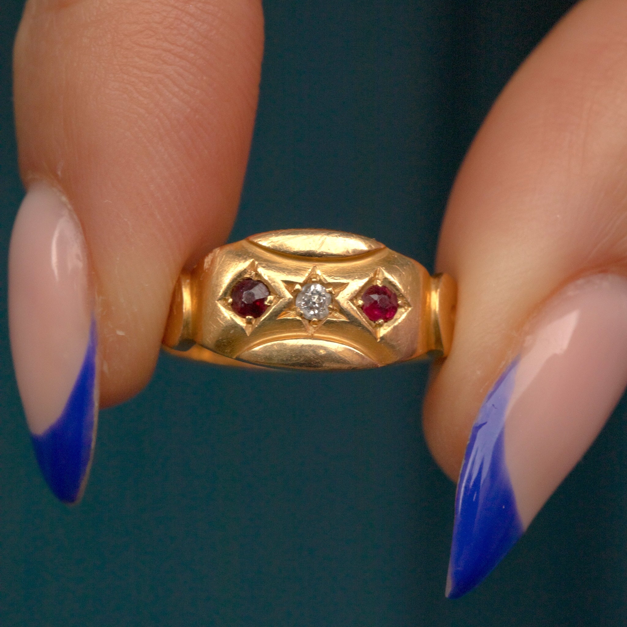 The star-set Diamond is flanked by crimson Garnets, each one glistening beneath the light. With a full set of hallmarks dating to 1899, this Victorian gypsy ring is a fine collector's piece!