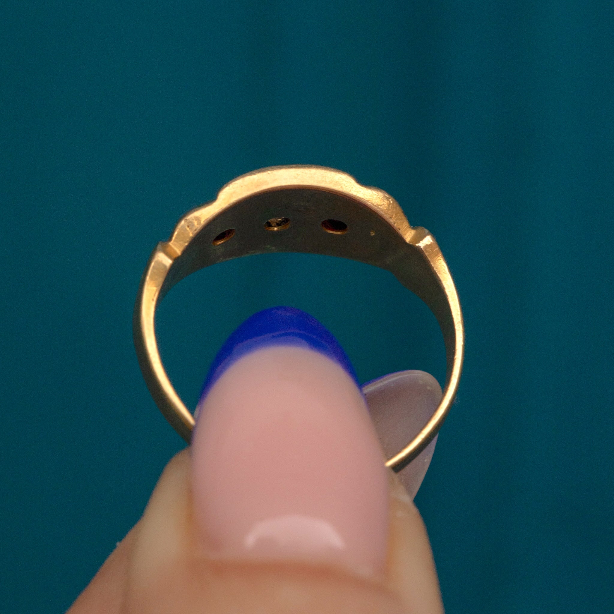 This striking antique 18ct Gold Garnet Diamond gypsy ring will add a unique flare to your ring stack! Beautifully crafted in luxurious 18ct Gold, this chunky delight has been uniquely formed and set with a trio of delectable gemstones.