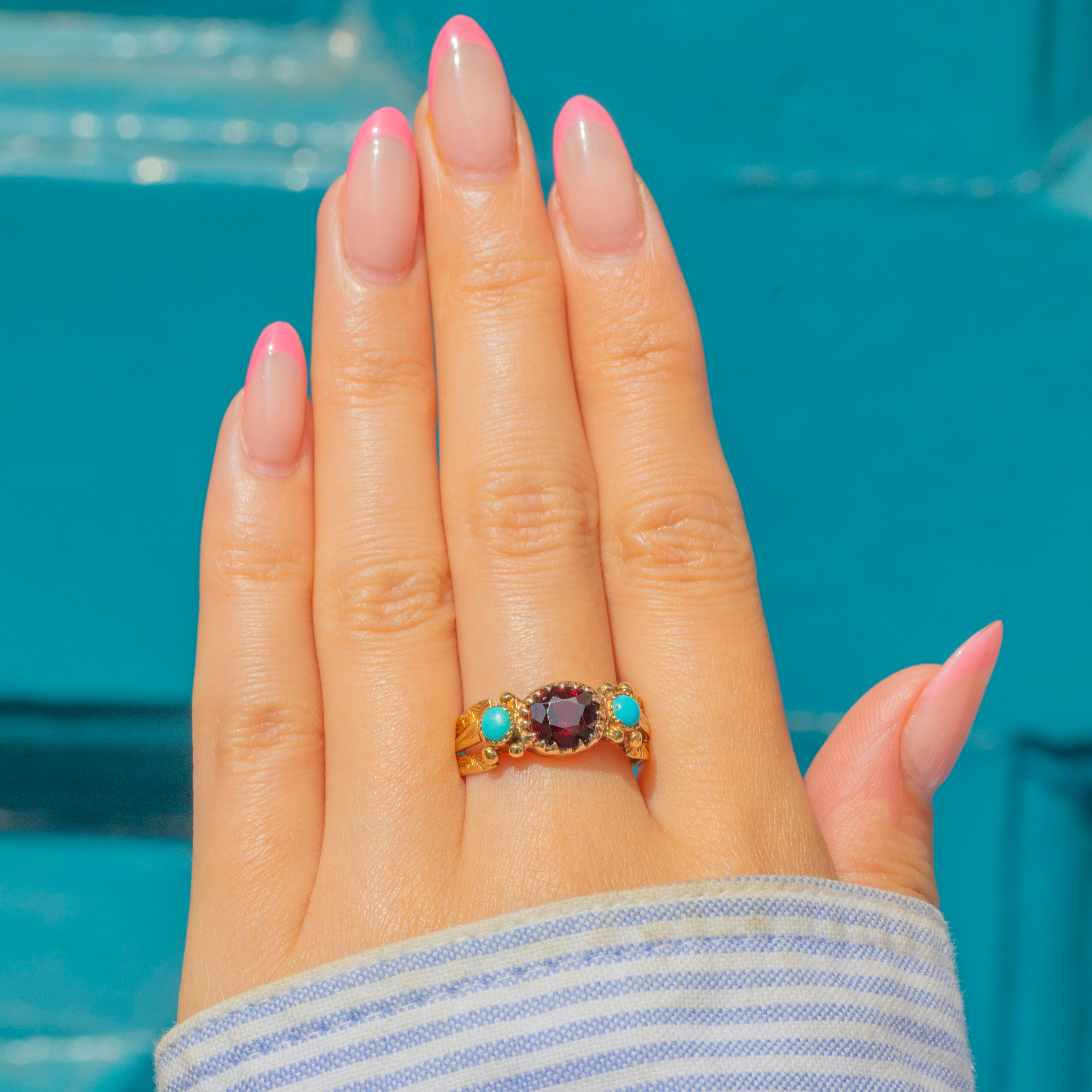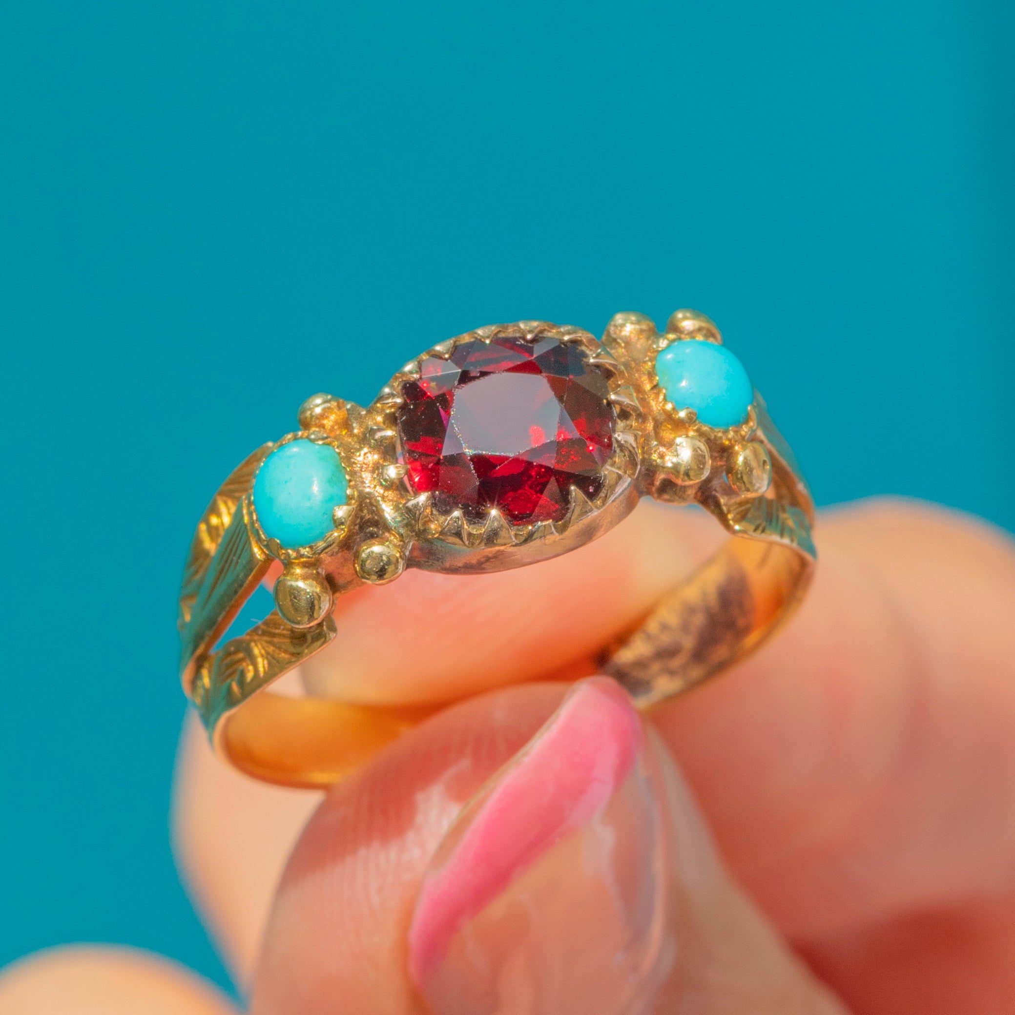 Antique 18ct Gold Garnet Turquoise Ring, Engraved Shoulders