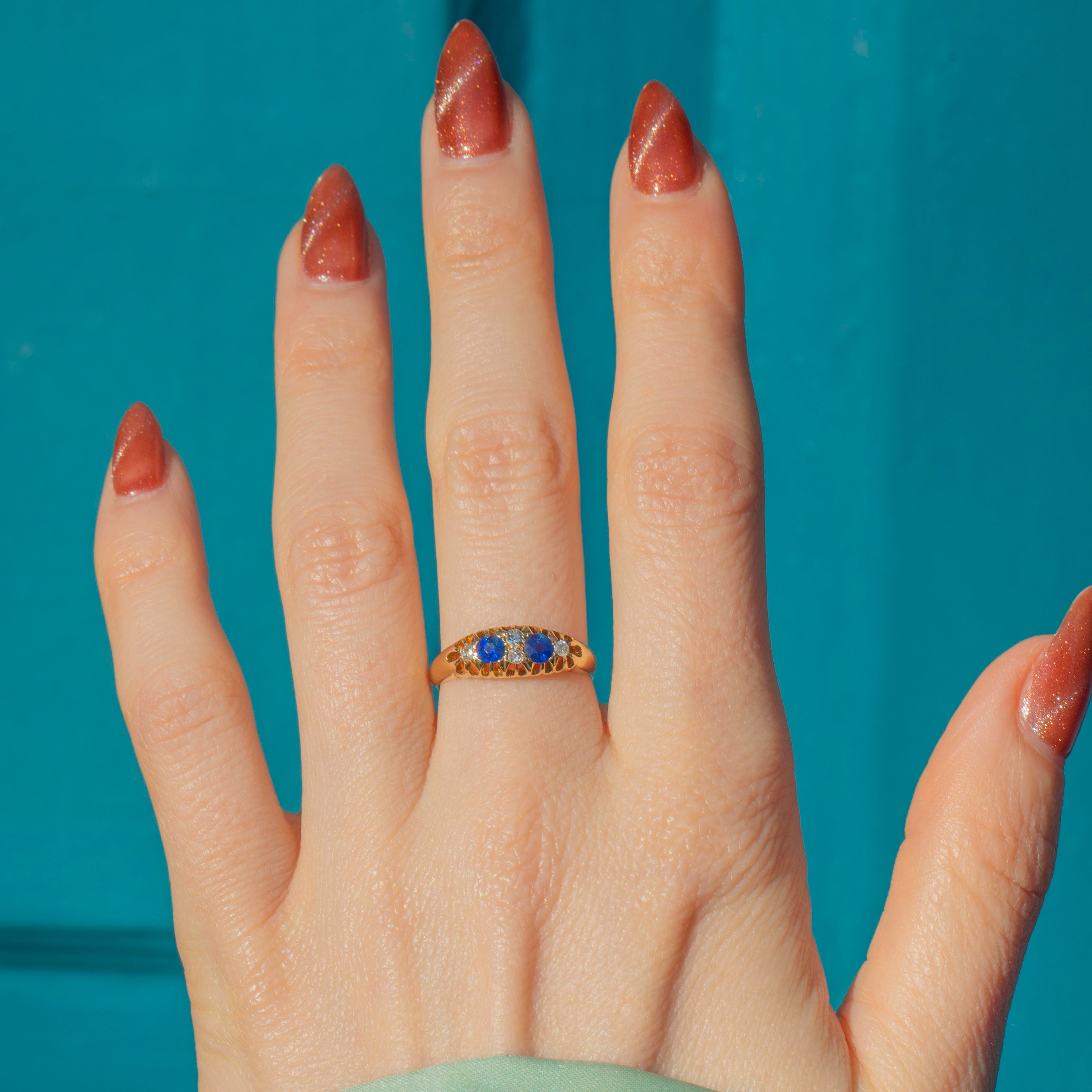This antique 18ct Gold Natural Sapphire Diamond boat ring is a sweet piece. The Sapphires possess a midnight-blue hue and are accompanied by four twinkling Diamonds, creating an eye-catching piece ideal for everyday wear!