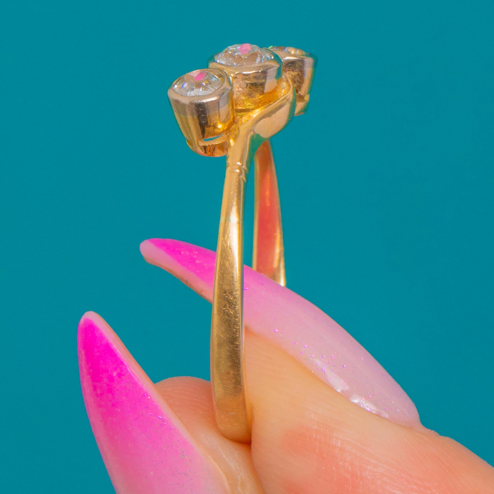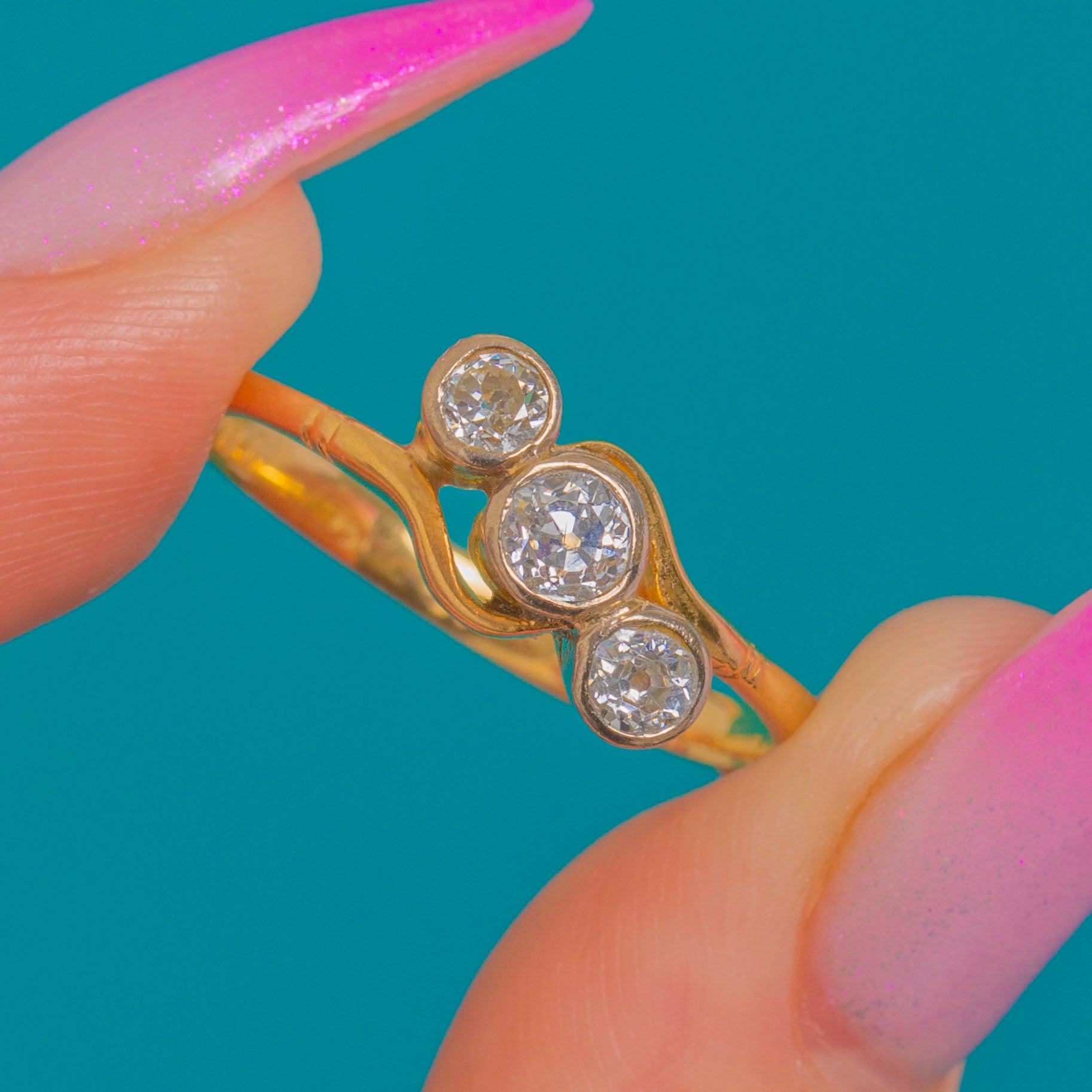 A refined Edwardian three-stone ring set with charming Old Mine Cut Diamonds in smooth rub-over bezel settings. The central Diamond sits slightly prouder between two petite companions, creating a graceful trilogy across a slender 18ct Gold band with subtly undulating shoulders.