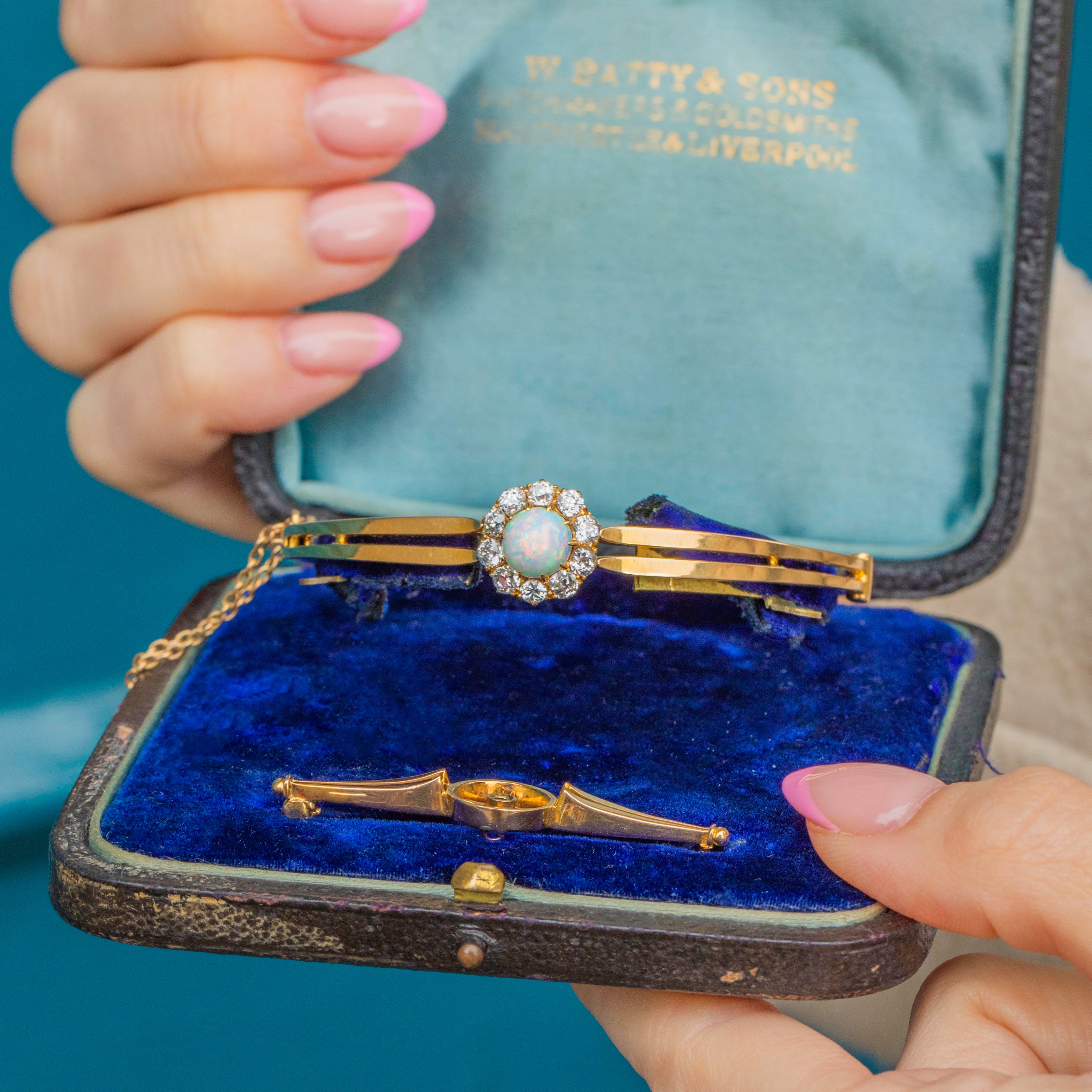 Antique 18ct Gold Opal Diamond Bangle in Fitted Box, with Brooch Attachment