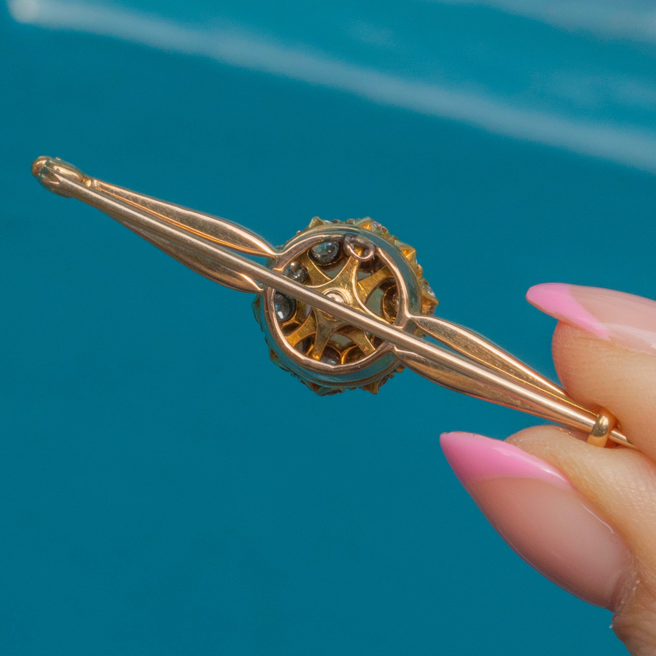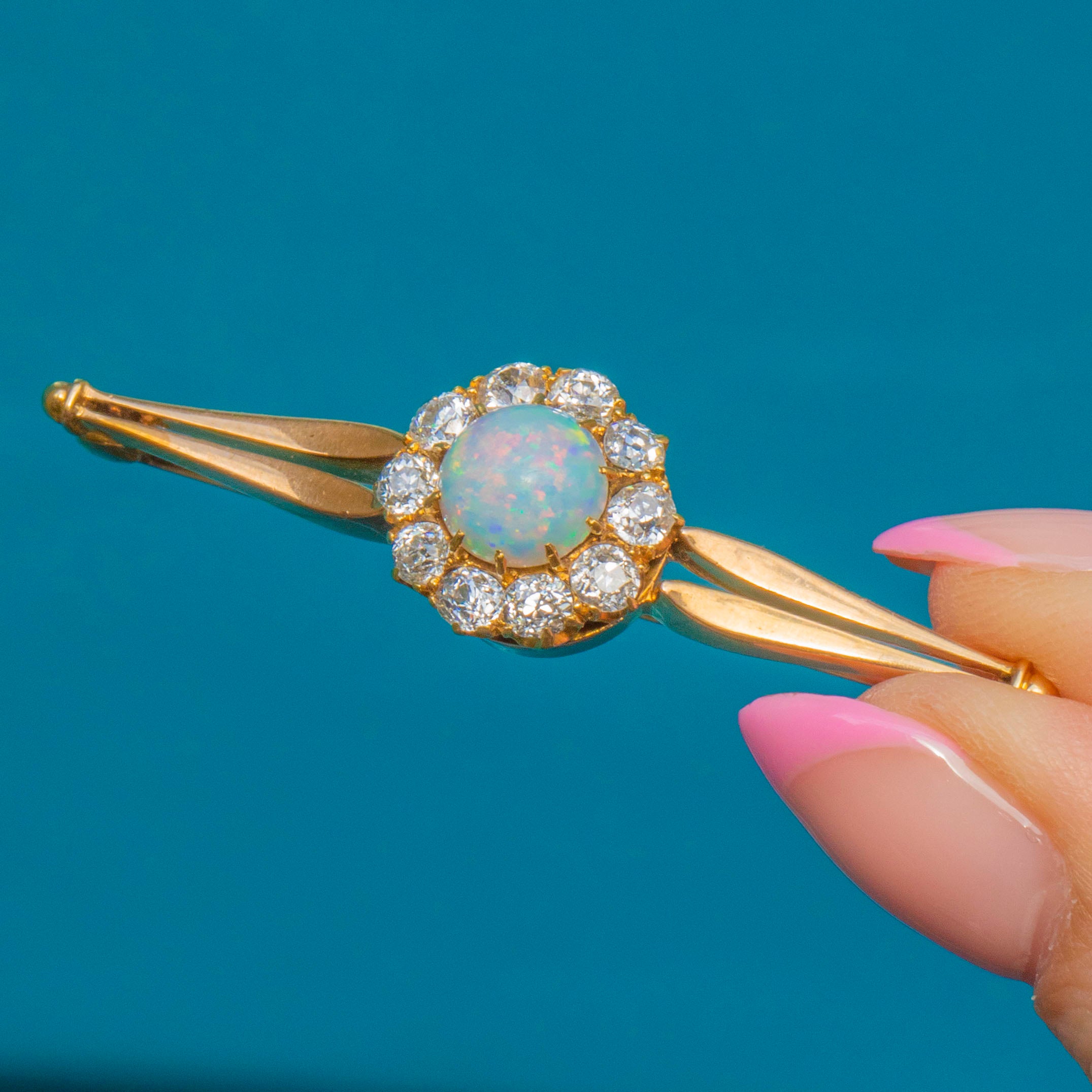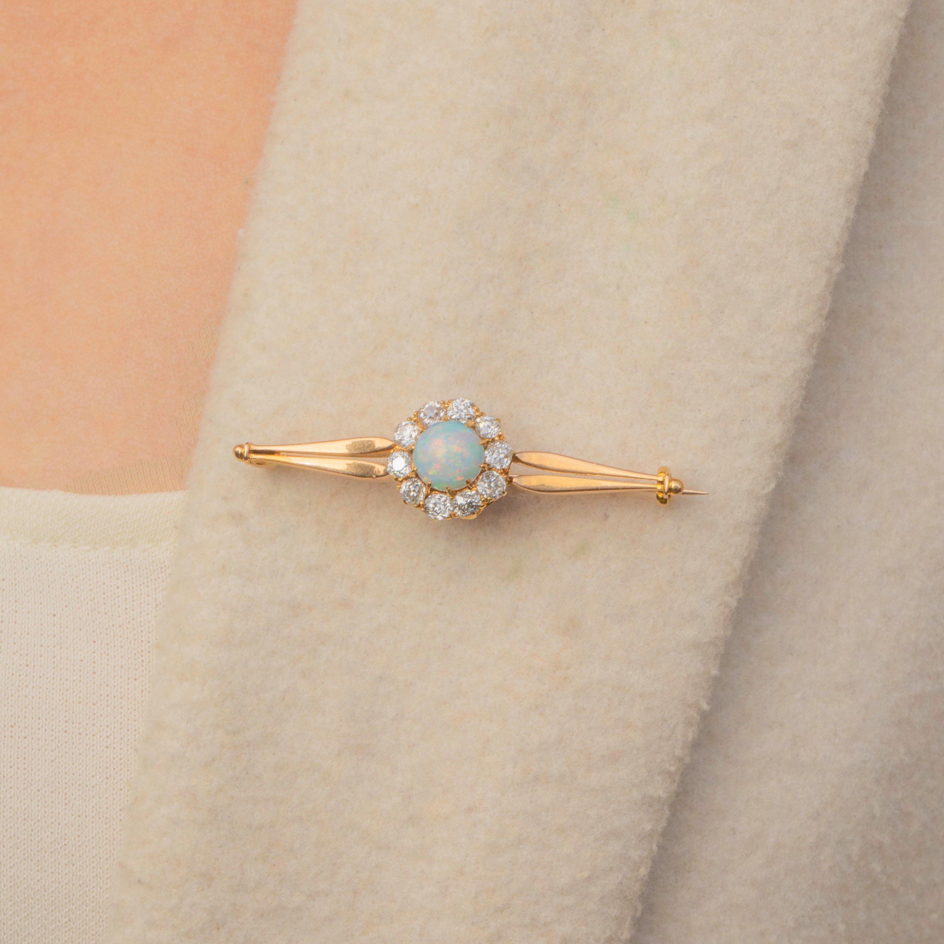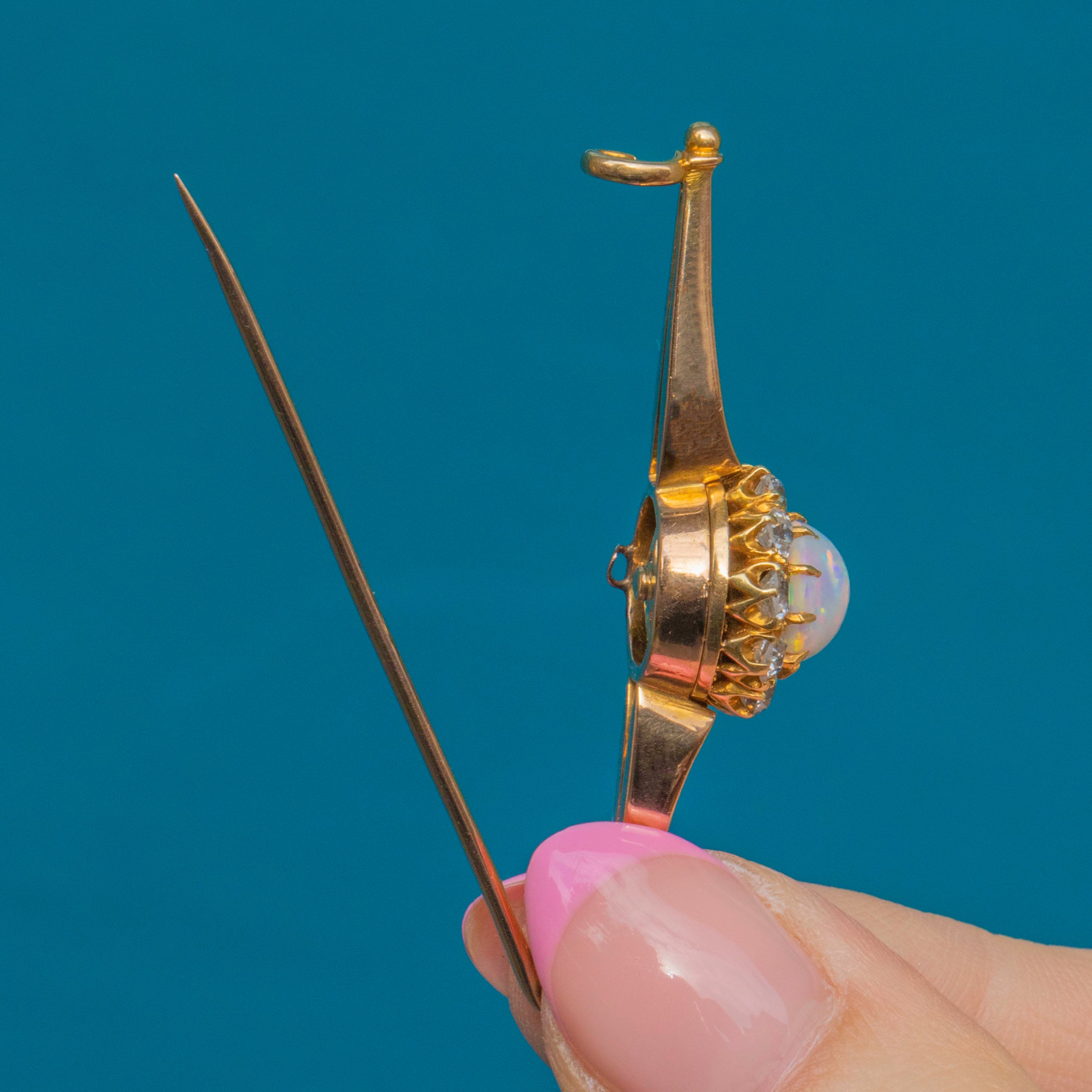 MATERIALS: Tests as 18ct Gold, 15ct Gold pin on brooch, Natural Solid Opal (0.83ct), Diamond (0.80ct).