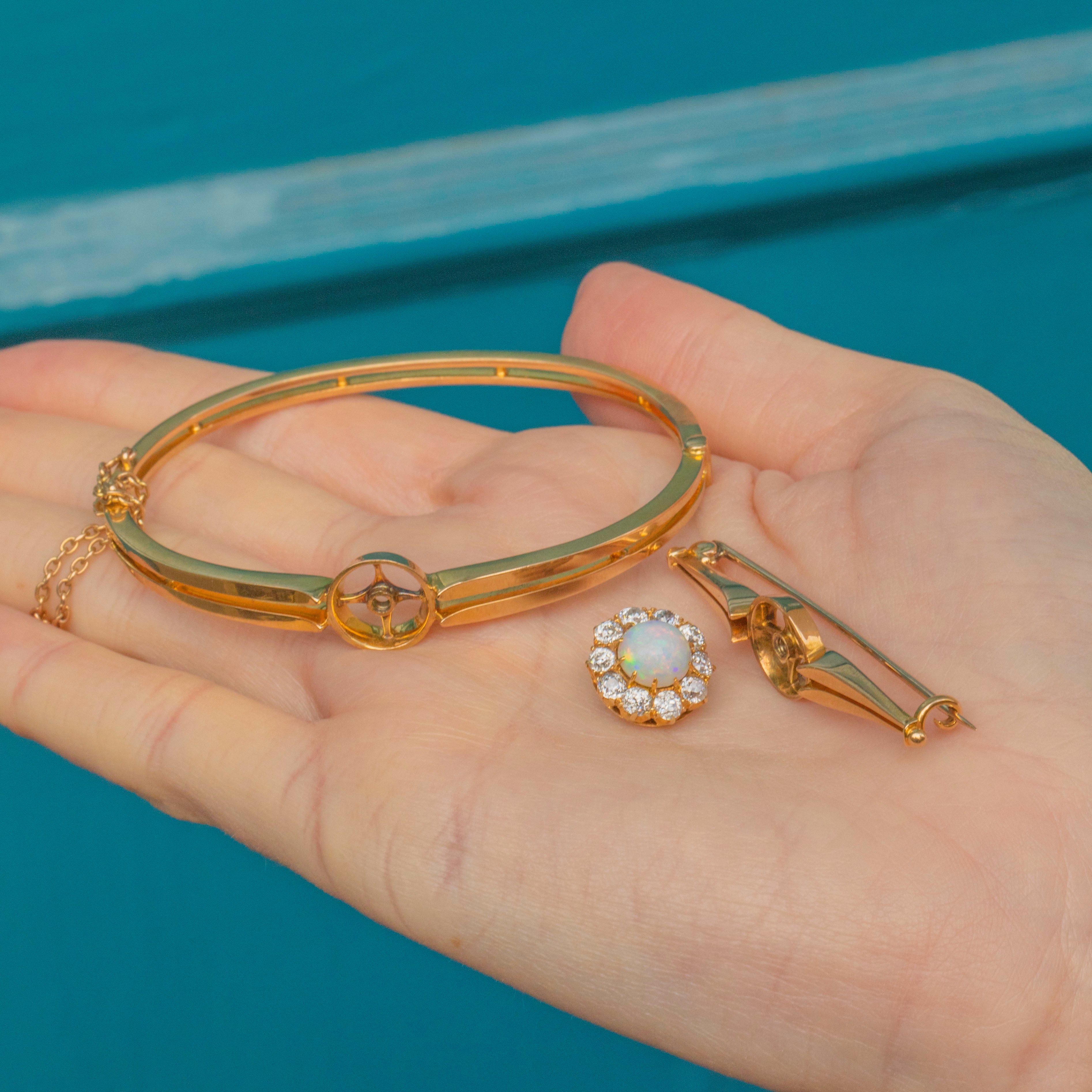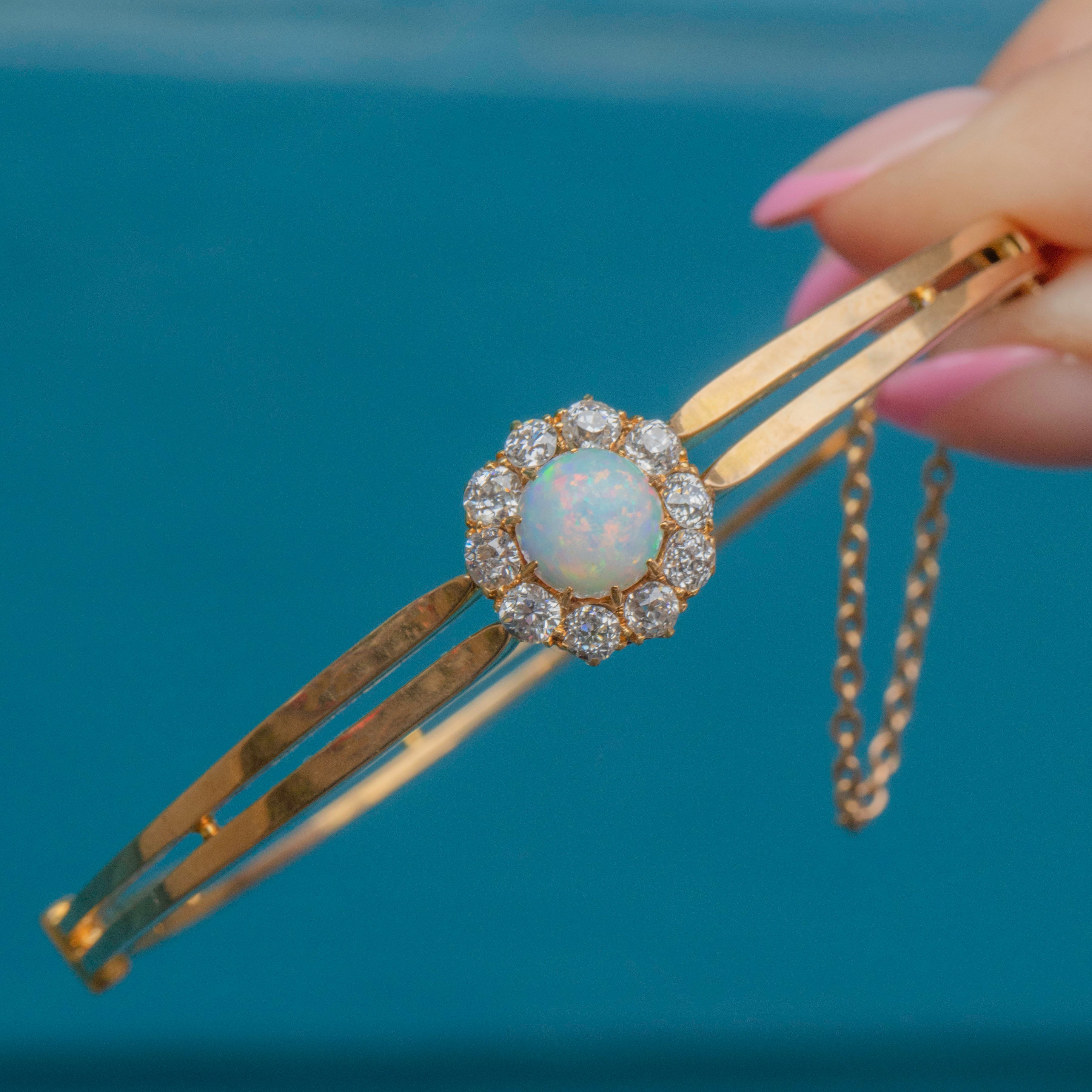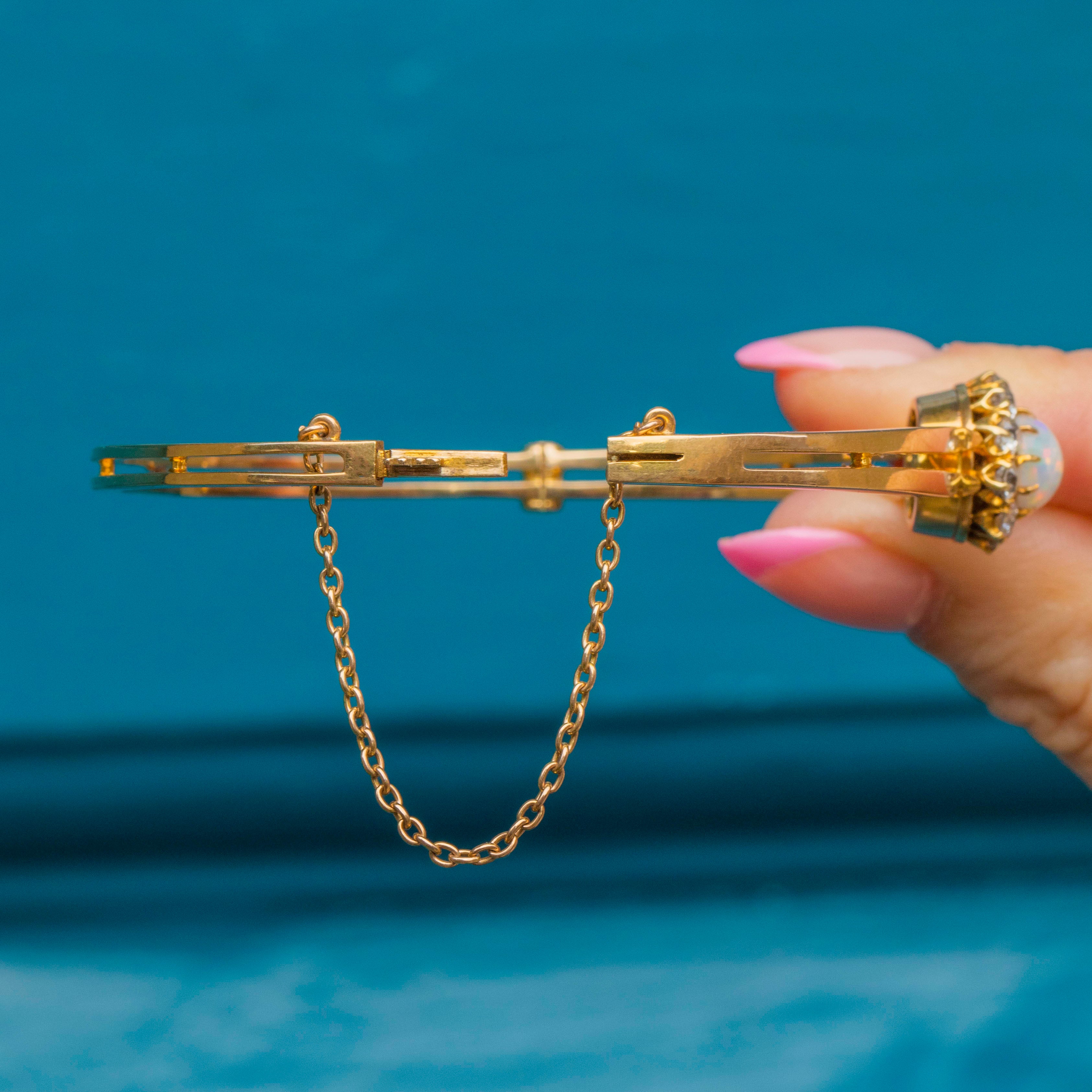EXCELLENT. This antique 18ct Gold Opal Diamond bangle is offered in excellent condition. The Opal is secured within its setting and is free from nibbles or chips. The Diamonds are sparkly, securely set and free from fleabites. The 18ct & 15ct Gold is lustrously shiny and has remained unscathed over the years. The bangle features a subtle clasp providing you with a secure and comfortable closure, with added protection from the safety chain. The brooch fitting is in perfect working condition allowing you to wear this superb piece of Edwardian jewellery however you please!