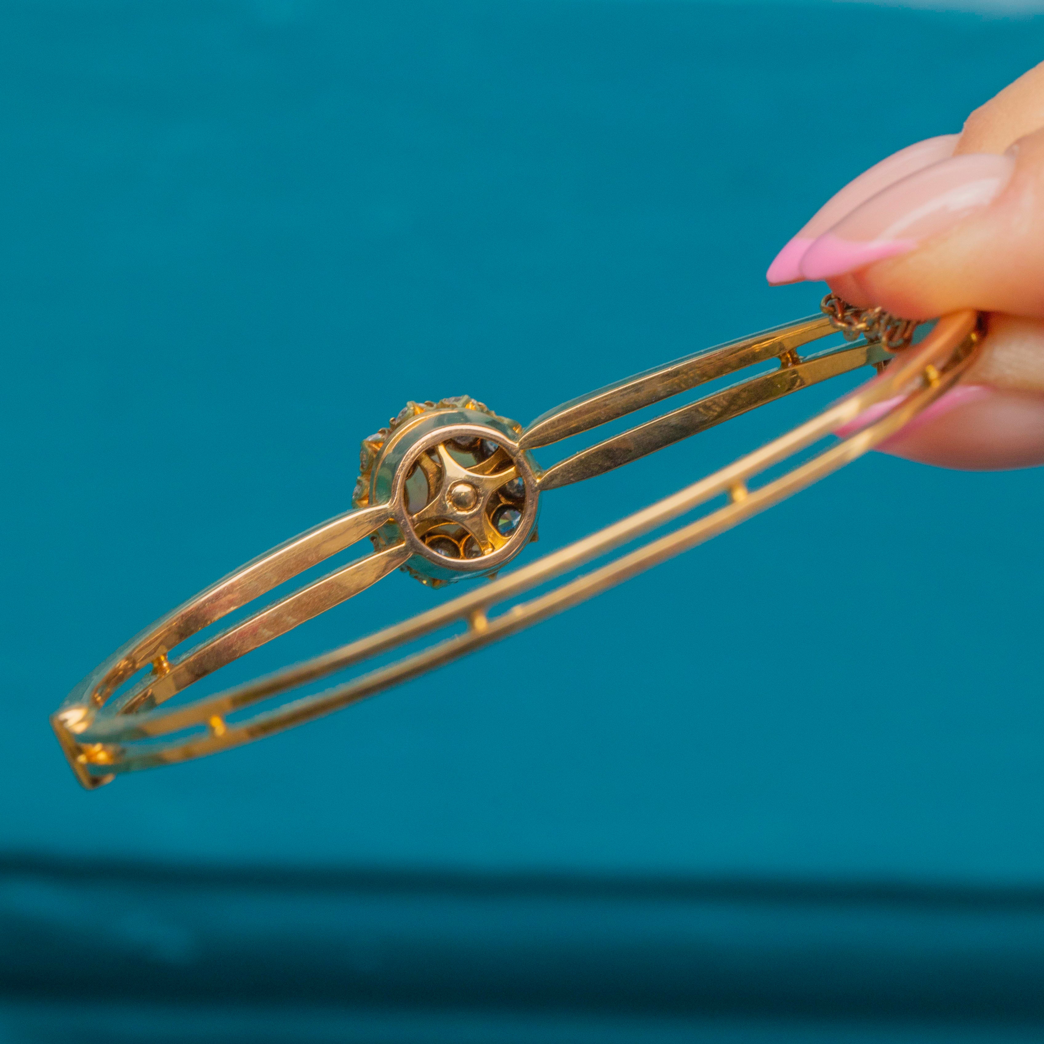 This antique 18ct Gold Opal Diamond bangle is an exquisite find. You will instantly become captivated by the 0.83ct natural solid Opal cabochon infused with zingy greens and flashes of fiery orange, haloed by scintillating old-mine cut Diamonds creating a truly show-stopping cluster!