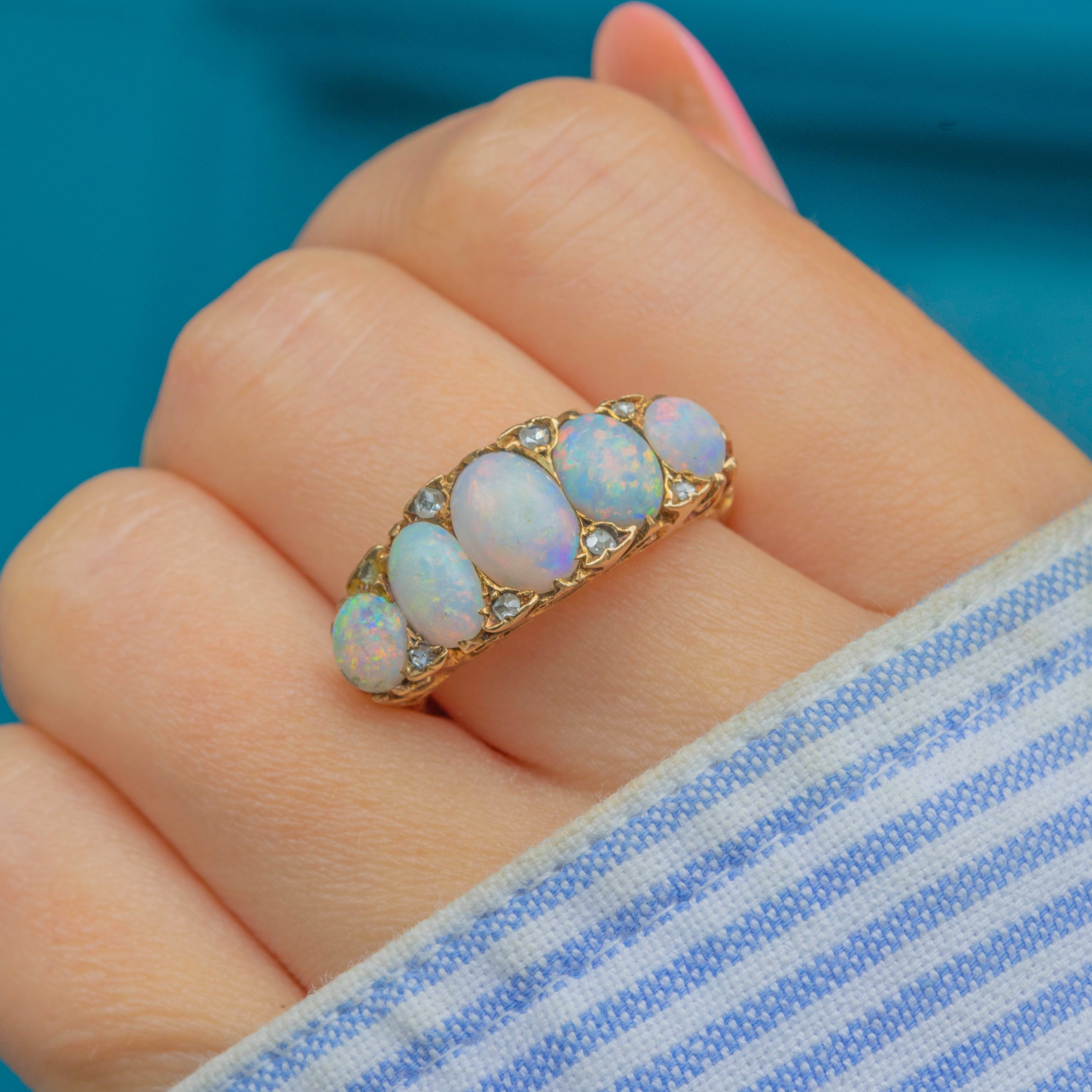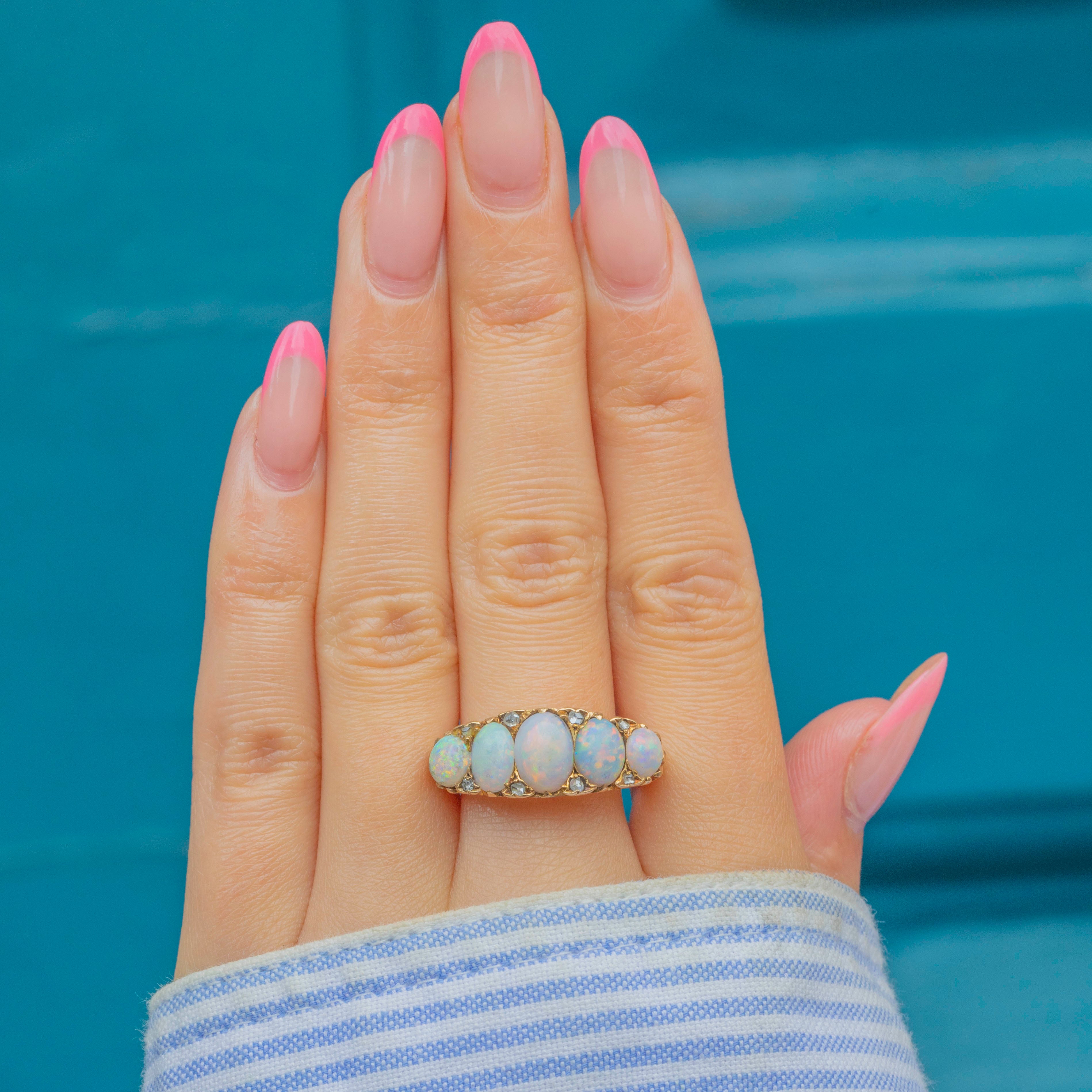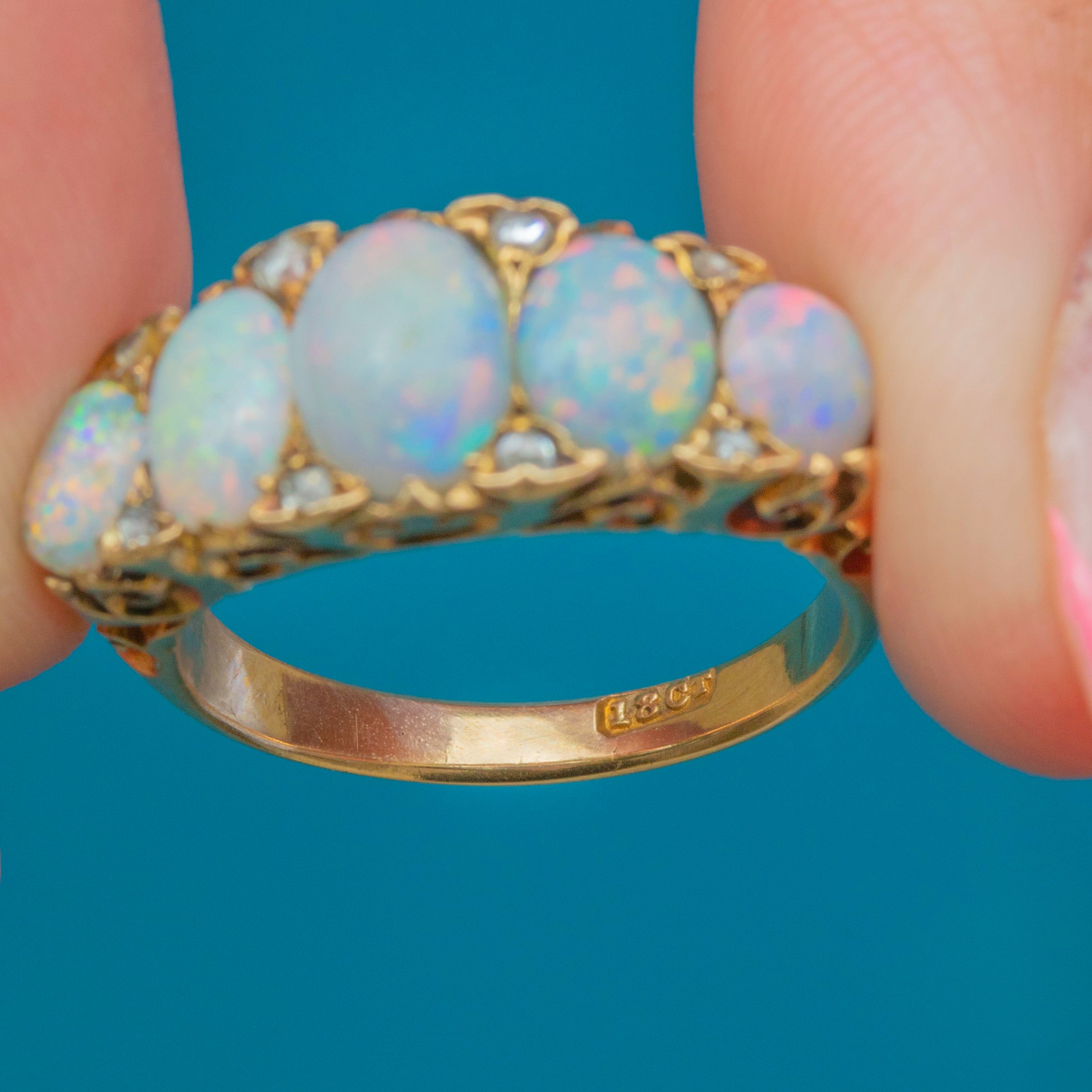 EXCELLENT: This antique 18ct Gold Opal five stone ring is in outstanding condition throughout. The Opals are perfectly smooth, with no chips or scuffs, and their settings keep them securely held in place. The Diamonds are bright with no chips. The Gold has an even saturation, and the gallery has no signs of wear. A superb piece of Victorian jewellery ready to be worn and appreciated for generations to come!