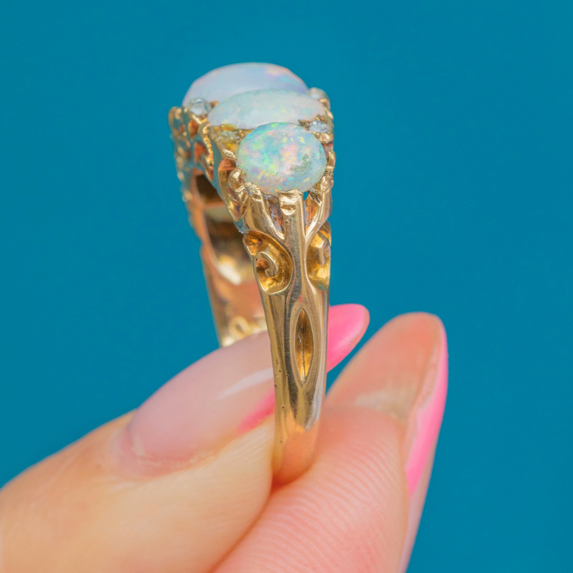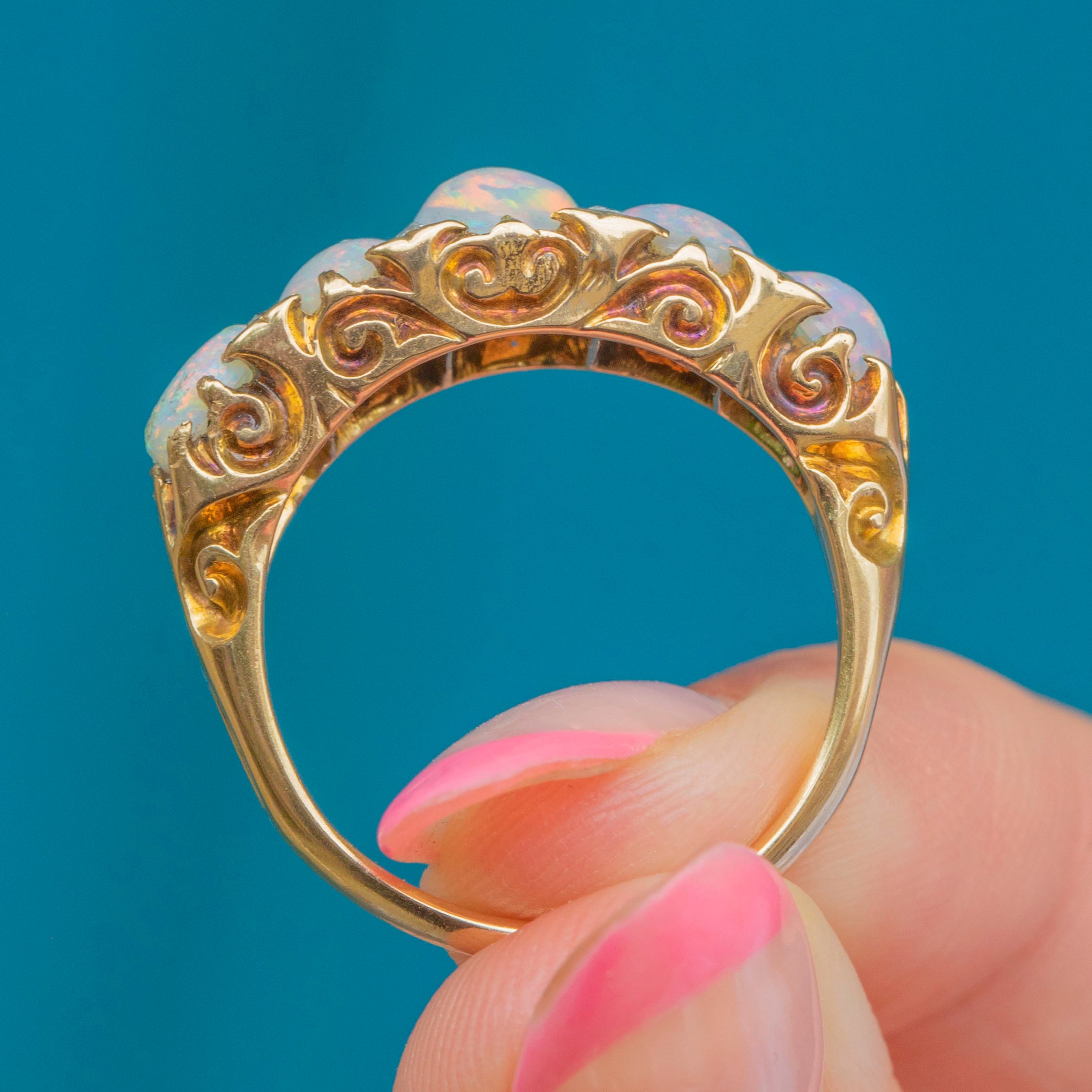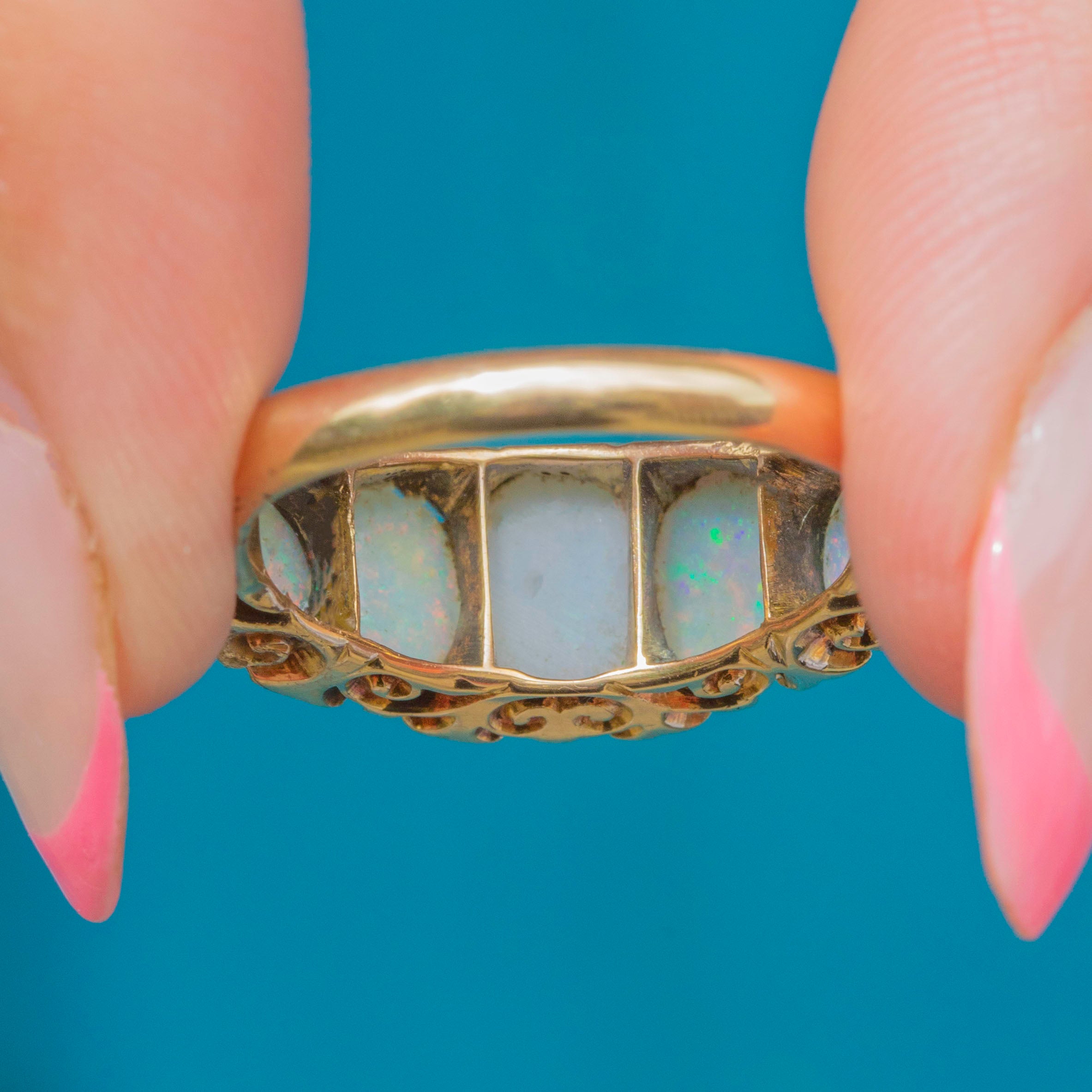 EXCELLENT: This antique 18ct Gold Opal five stone ring is in outstanding condition throughout. The Opals are perfectly smooth, with no chips or scuffs, and their settings keep them securely held in place. The Diamonds are bright with no chips. The Gold has an even saturation, and the gallery has no signs of wear. A superb piece of Victorian jewellery ready to be worn and appreciated for generations to come!