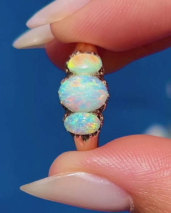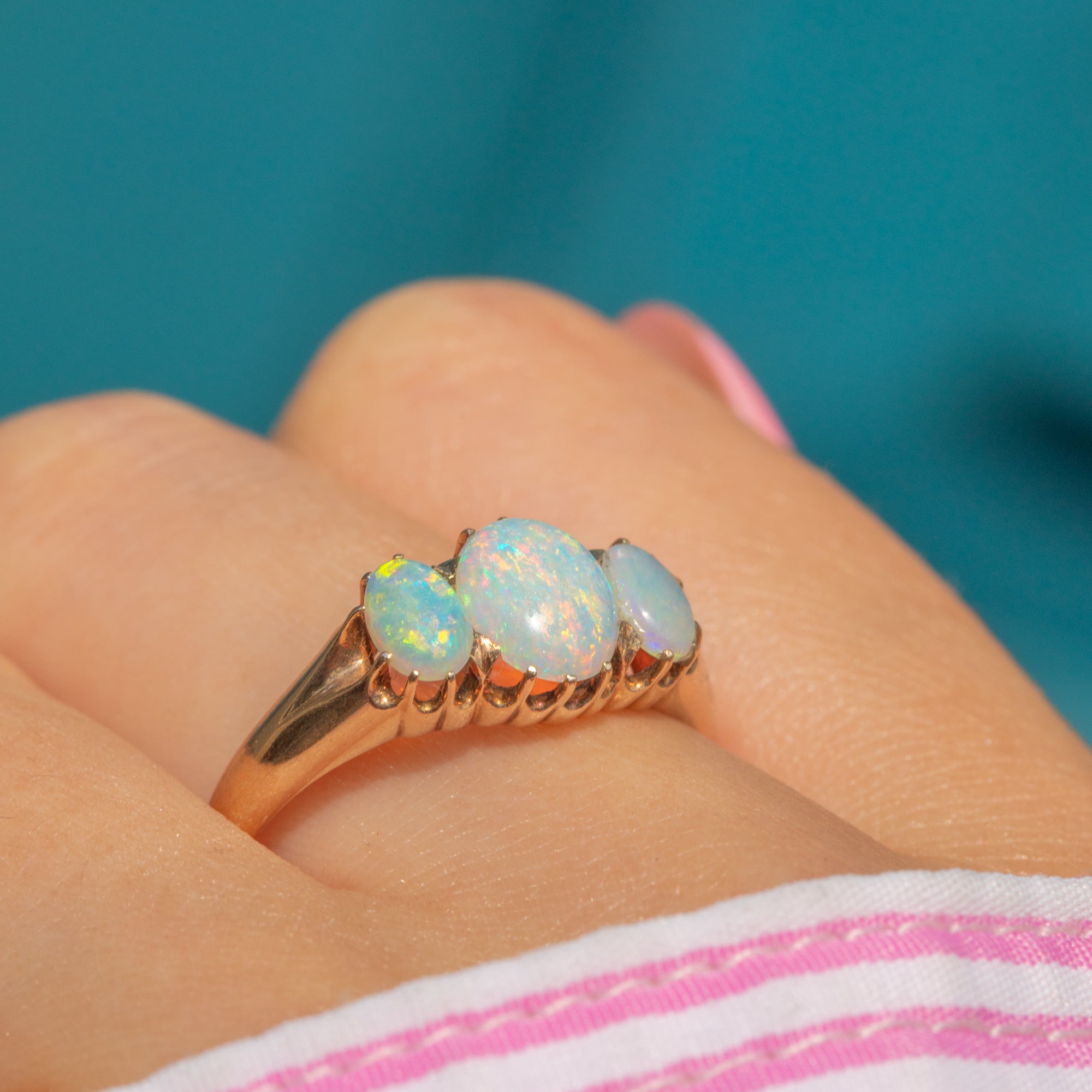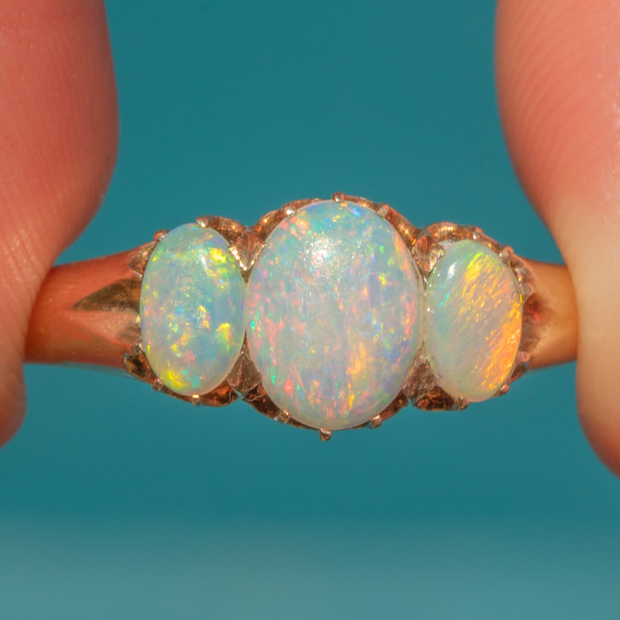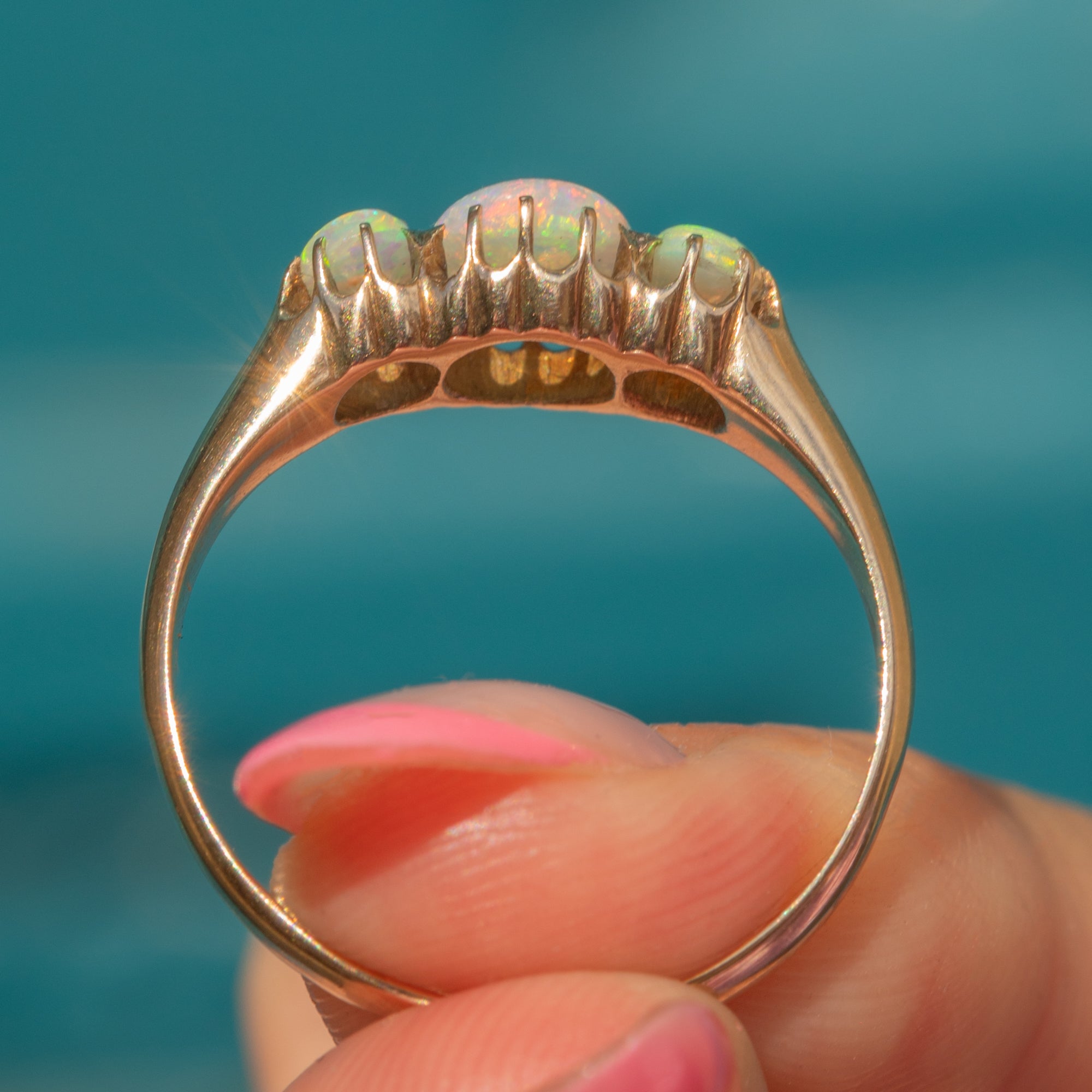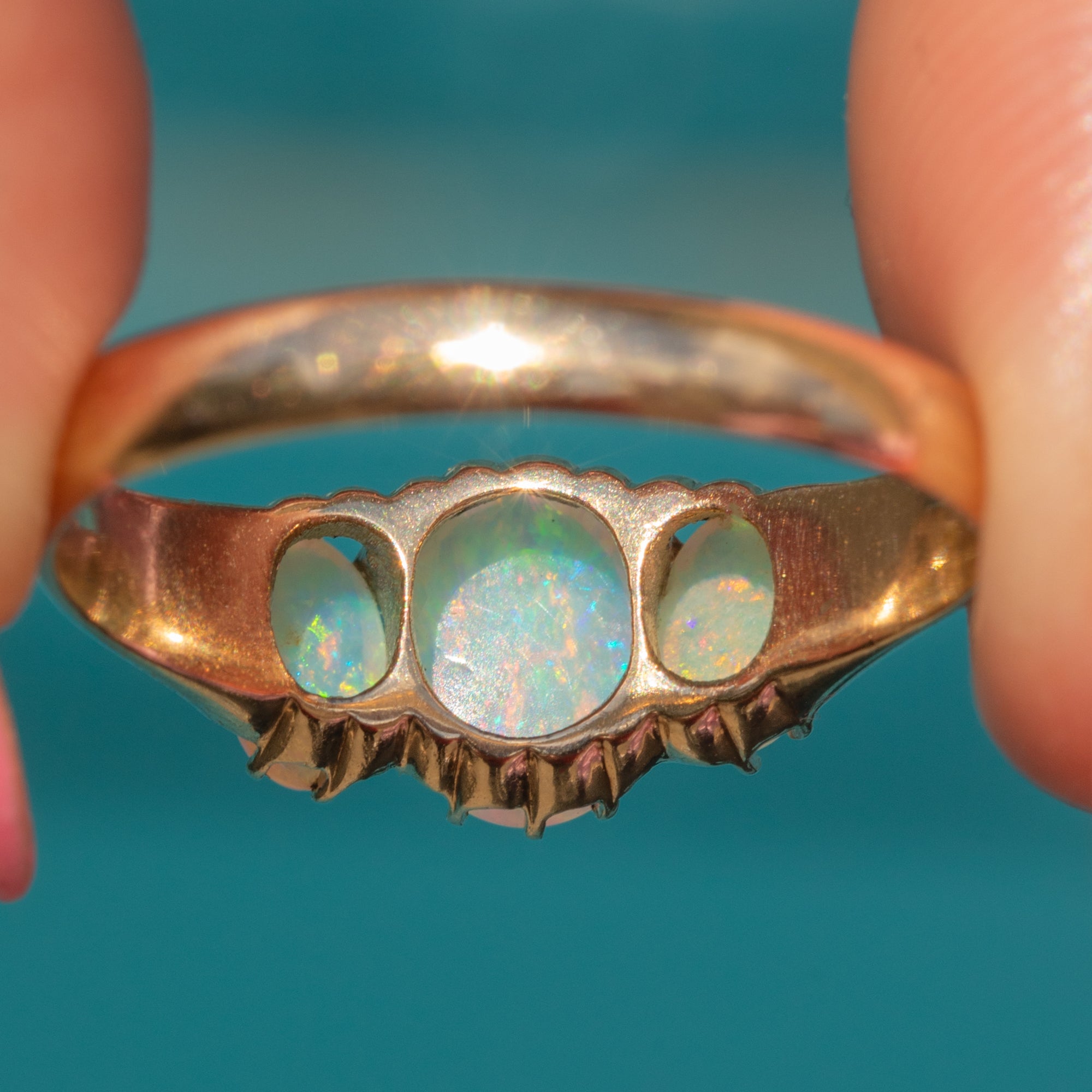 VERY GOOD: This antique 18ct Gold Opal three stone ring is in very good condition. The 18ct Gold is sumptuous and radiant. The Opal cabochons are securely set, they are all original with a full spectrum of vibrant rainbow colours. The Gold band shows some age-related wear, noticeable under close inspection. All in all, this Victorian Opal ring is a fabulous find and will make a gorgeous addition to your collection!
