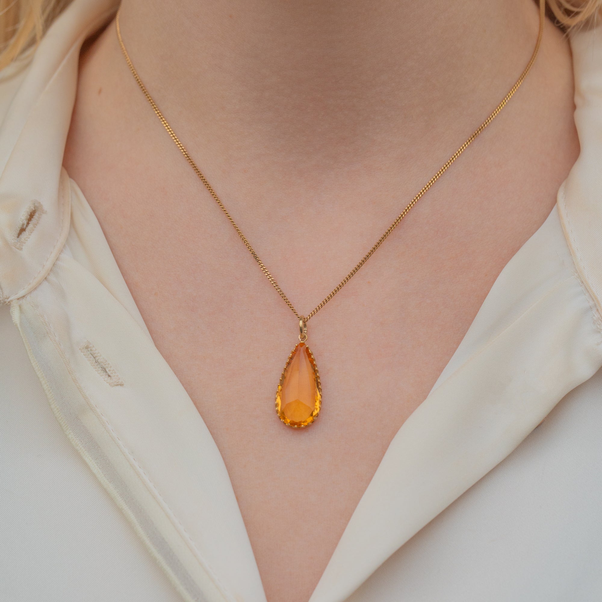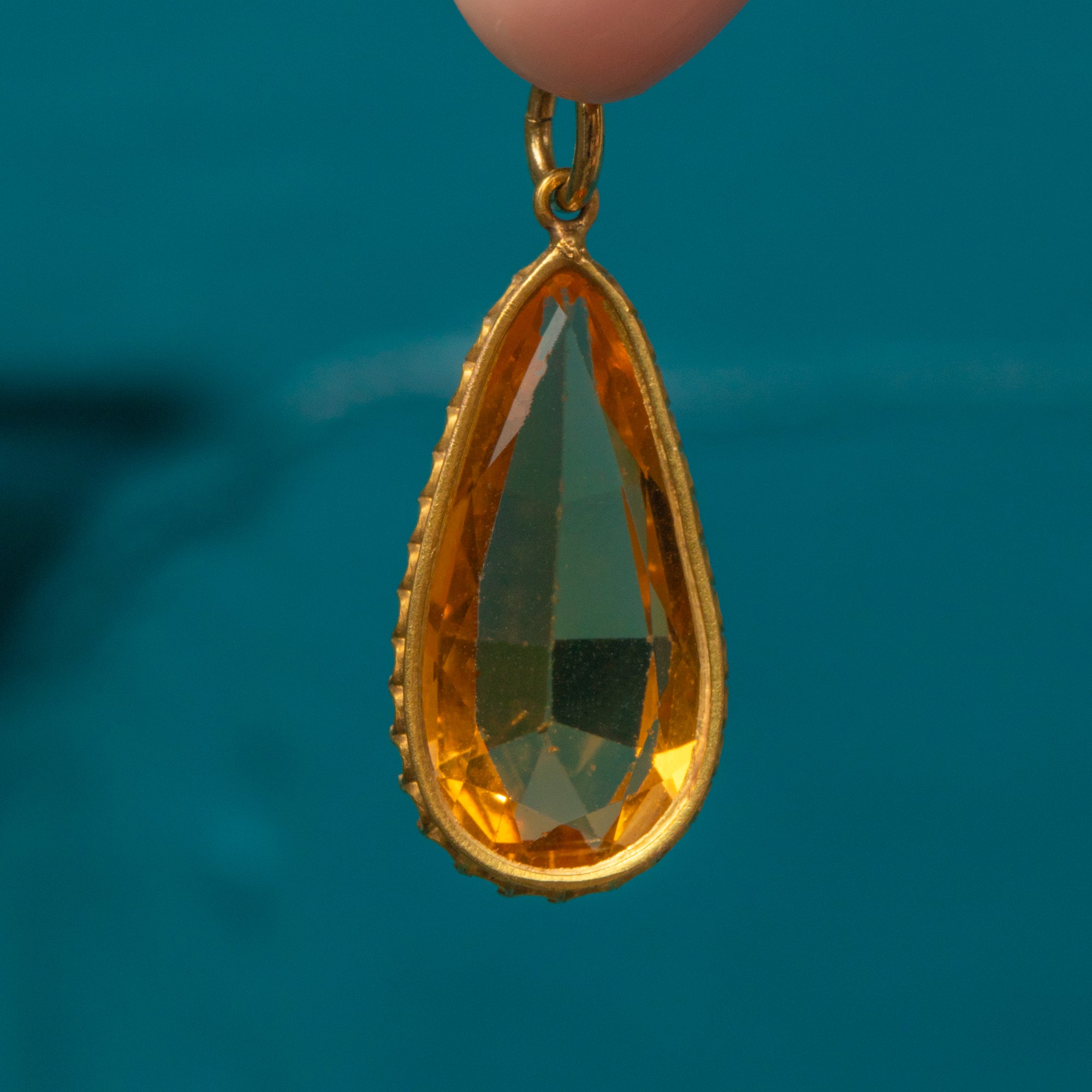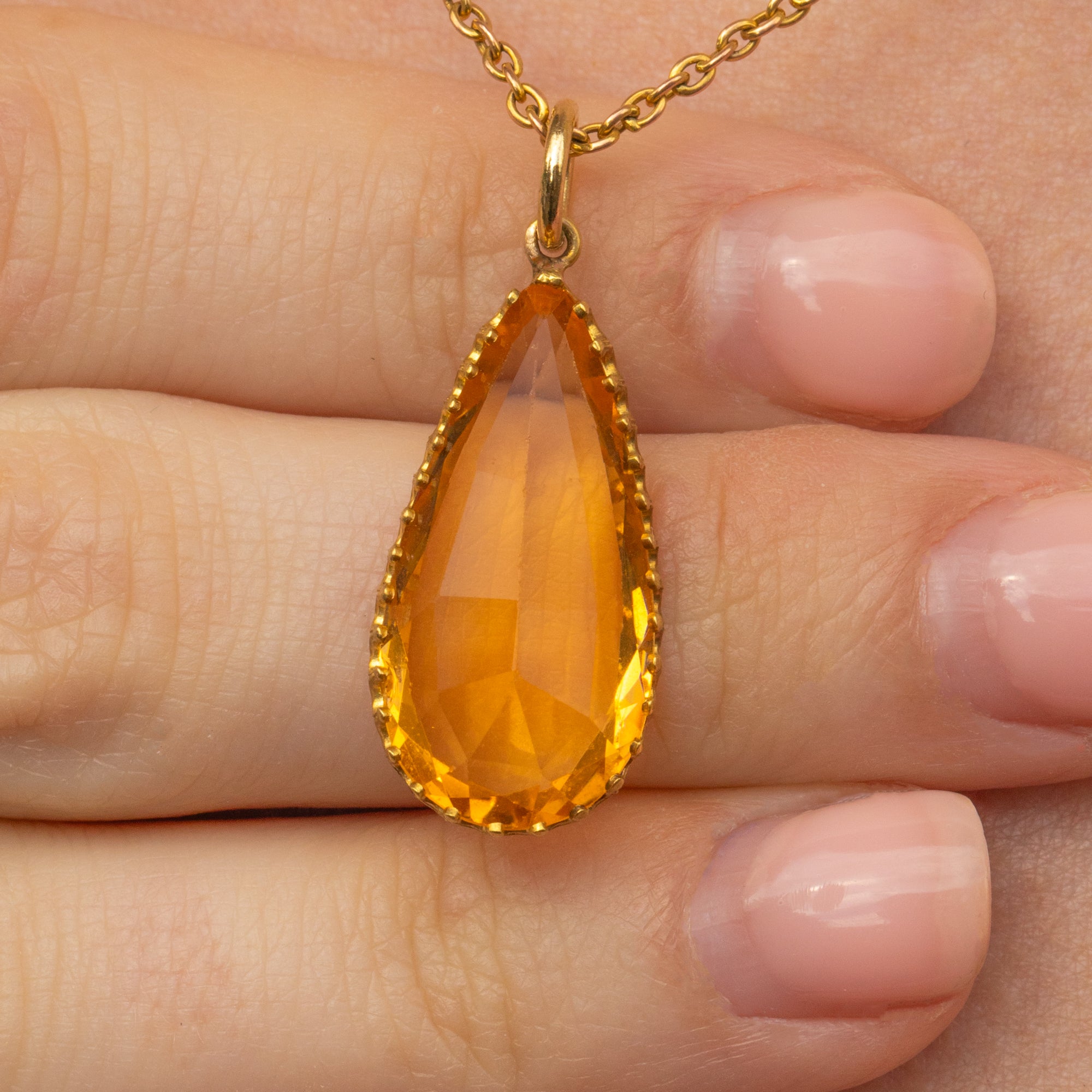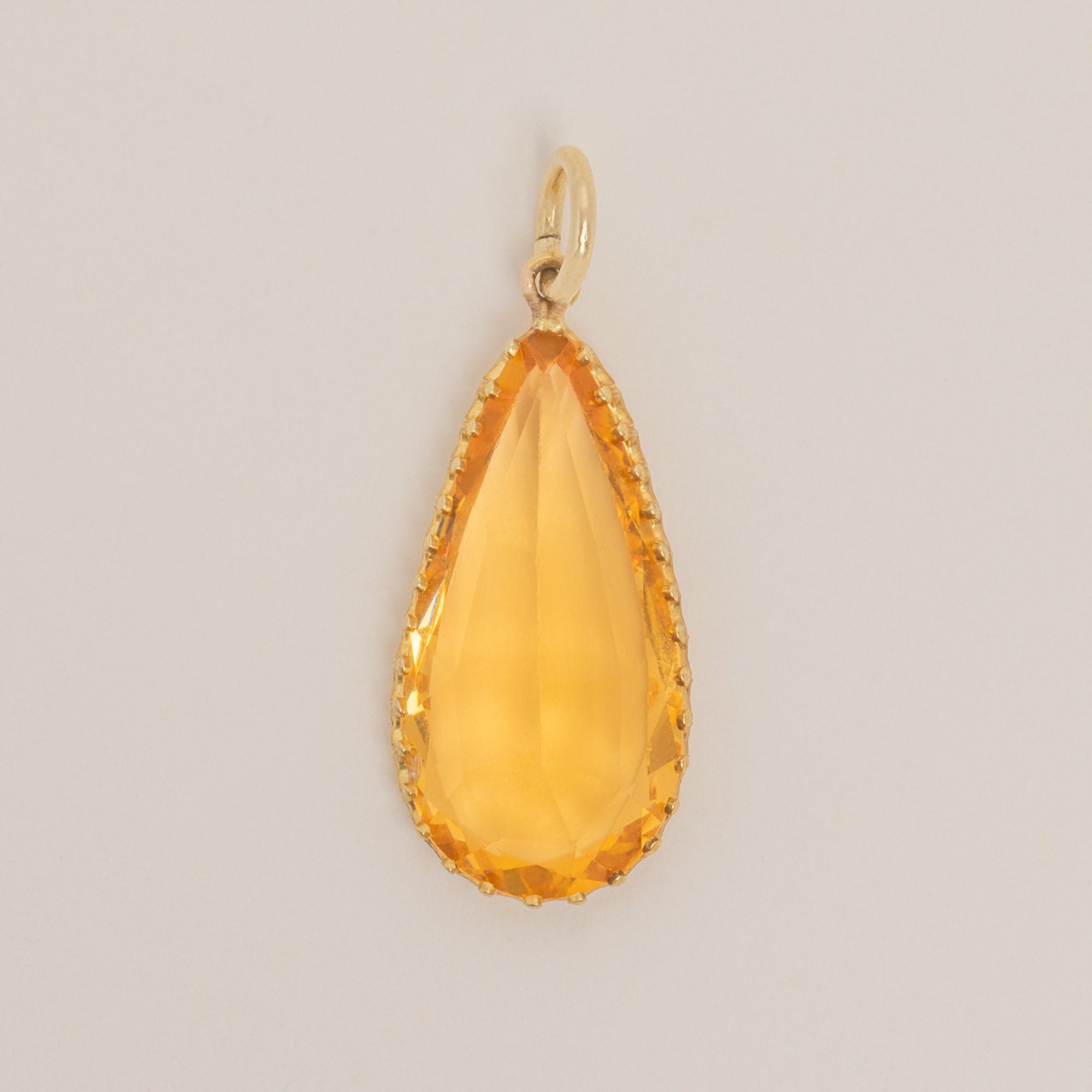 This antique 18ct Gold Paste teardrop pendant reveals spectacular honey hues at every twist and turn! Exquisitely faceted, the teardrop Citrine Paste catches the light beautifully as she adorns your décolletage.