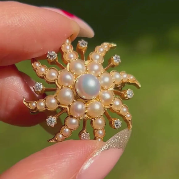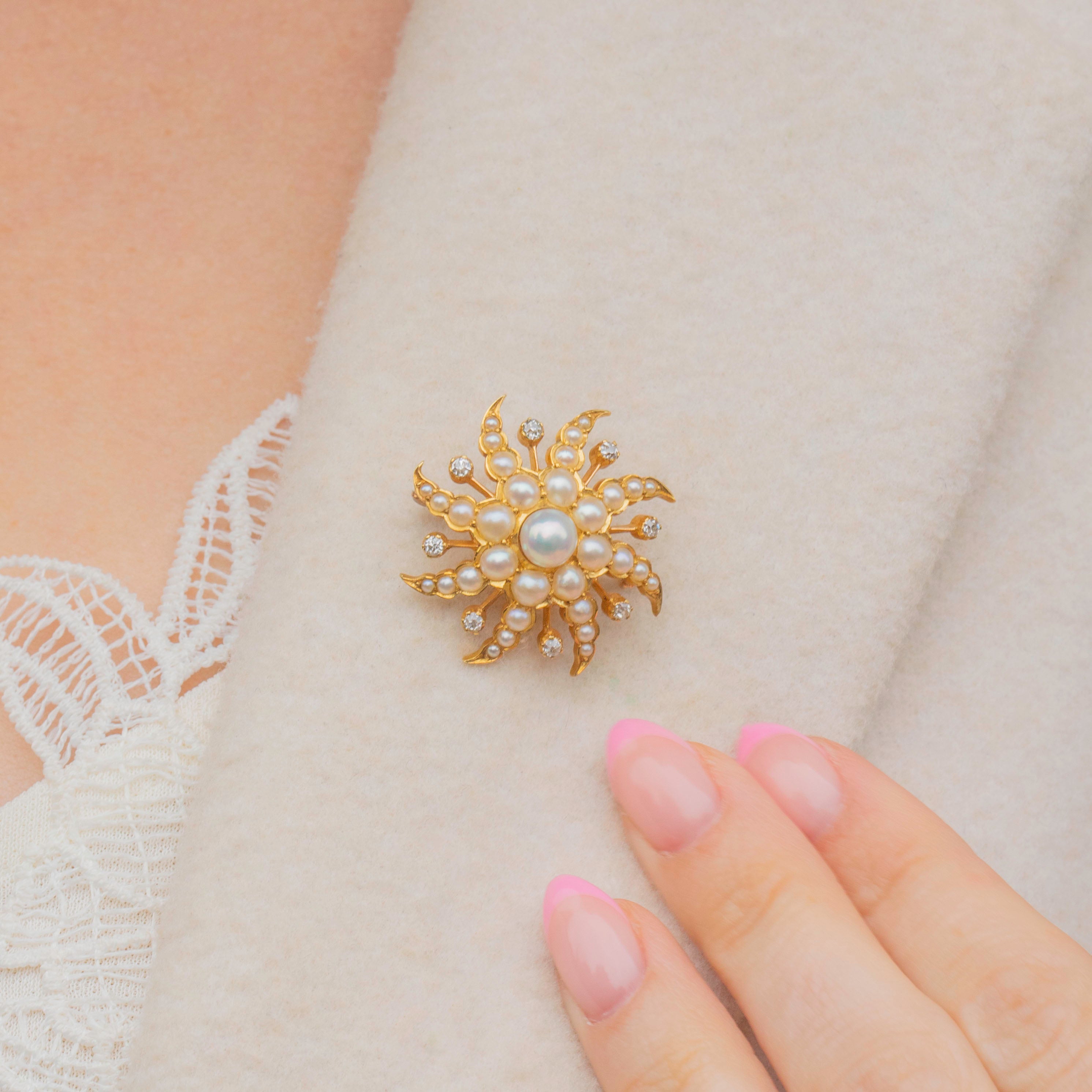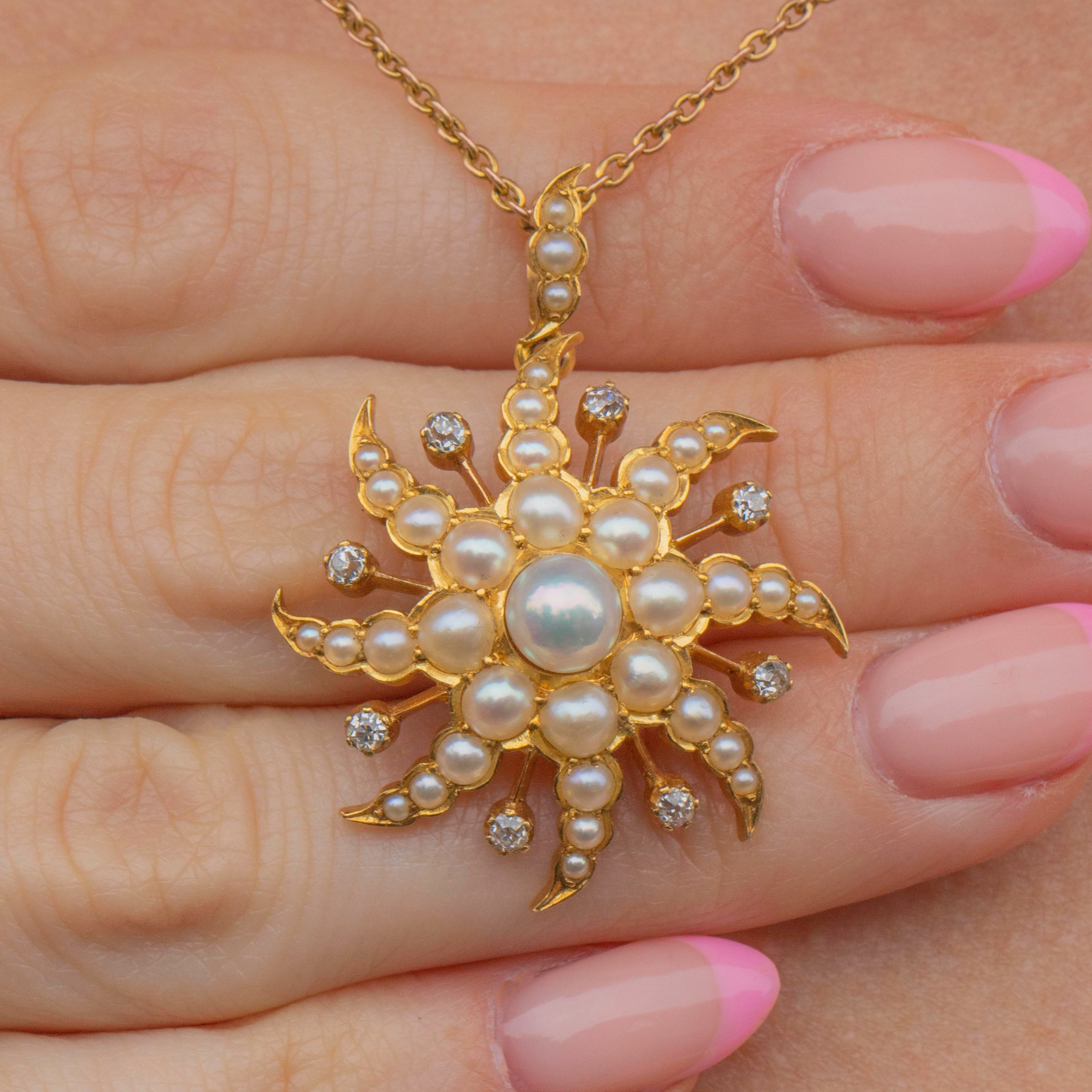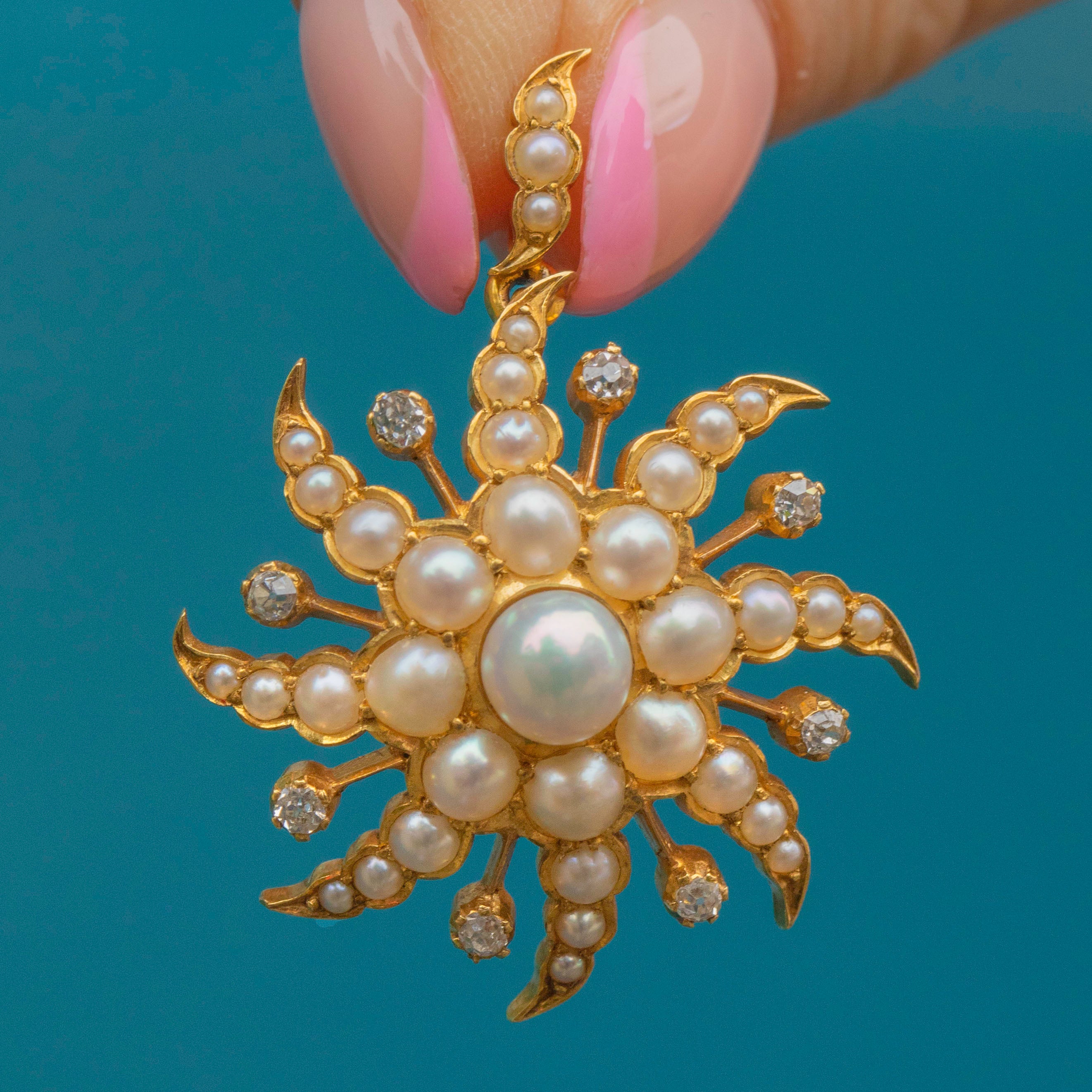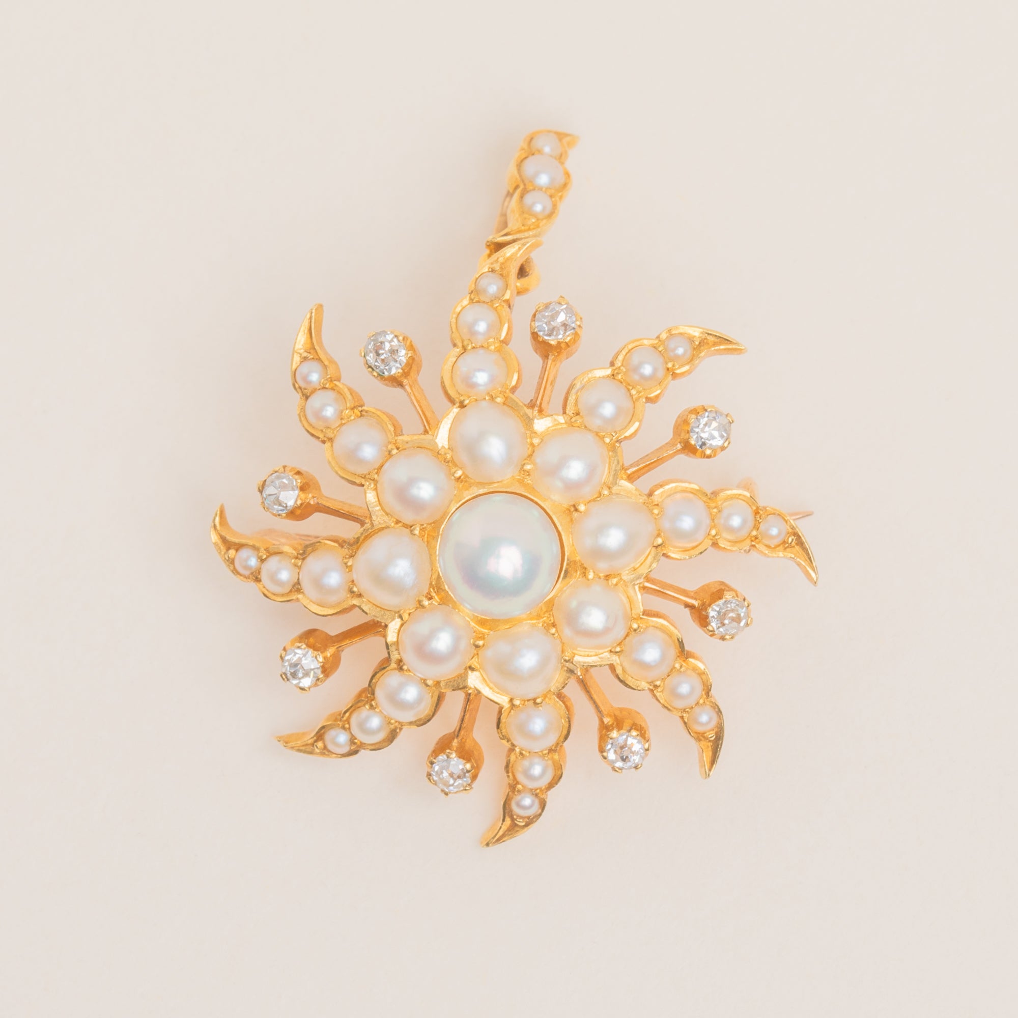 EXCELLENT. This antique 15ct Gold Pearl starburst pendant is in excellent condition. Each Pearl is secure and present, with a myriad of shimmering hues throughout. The Diamonds are all present and free from fleabites, providing a twinkling accent. The structural integrity of the piece has withheld the test of time and has retained its superb starburst form effortlessly. On the back, her detachable brooch fittings are in perfect working condition!