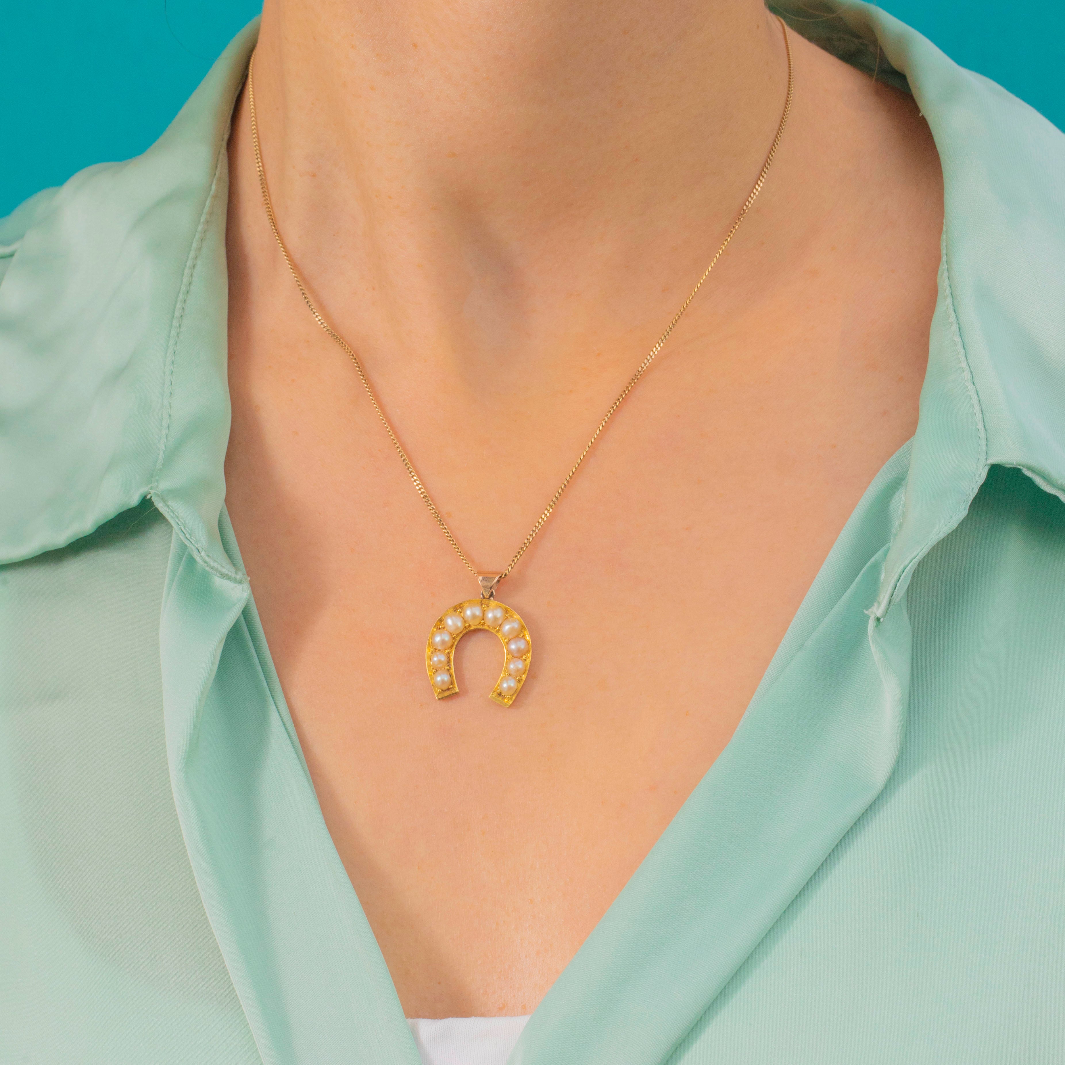 A charming Victorian Pearl horseshoe pendant, crafted in rich 18ct Yellow Gold. Each creamy Pearl is individually set and beautifully matched, their soft ivory tones shimmering with subtle blush and champagne overtones.