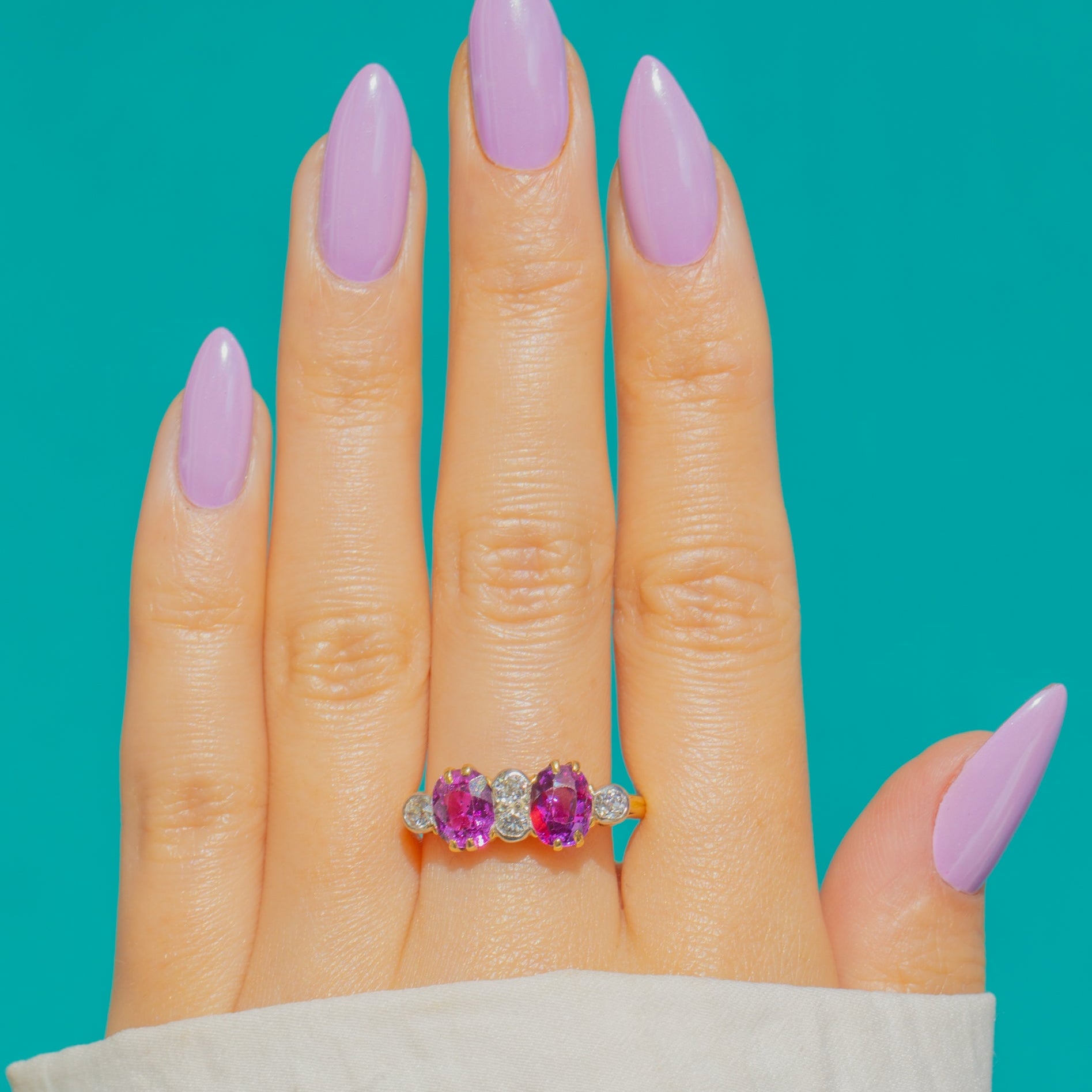 A romantic Victorian six-stone ring set with twin oval Pink Sapphires glowing a vivid pink-purple and accented by crisp, sparkling Diamonds. Crafted in rich 18ct Gold, the stones sit in a refined basket that invites the light to dance through each facet.