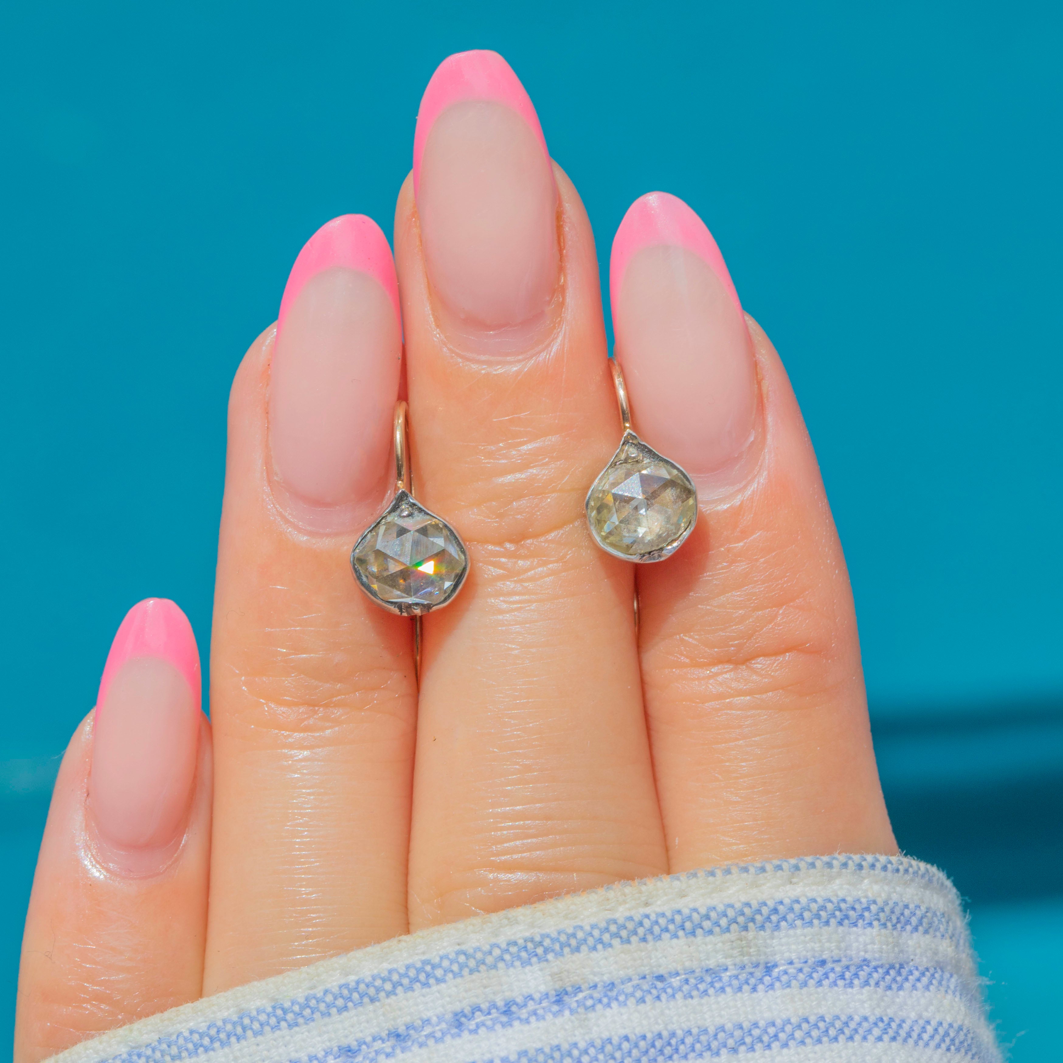 These antique 18ct Gold rose-cut Diamond earrings are an exquisite pair! Each earring drop boasts a fabulous 0.60ct rose-cut Diamond, with a high profile and perfectly geometric facets that will provide your lobes with endless sparkle.