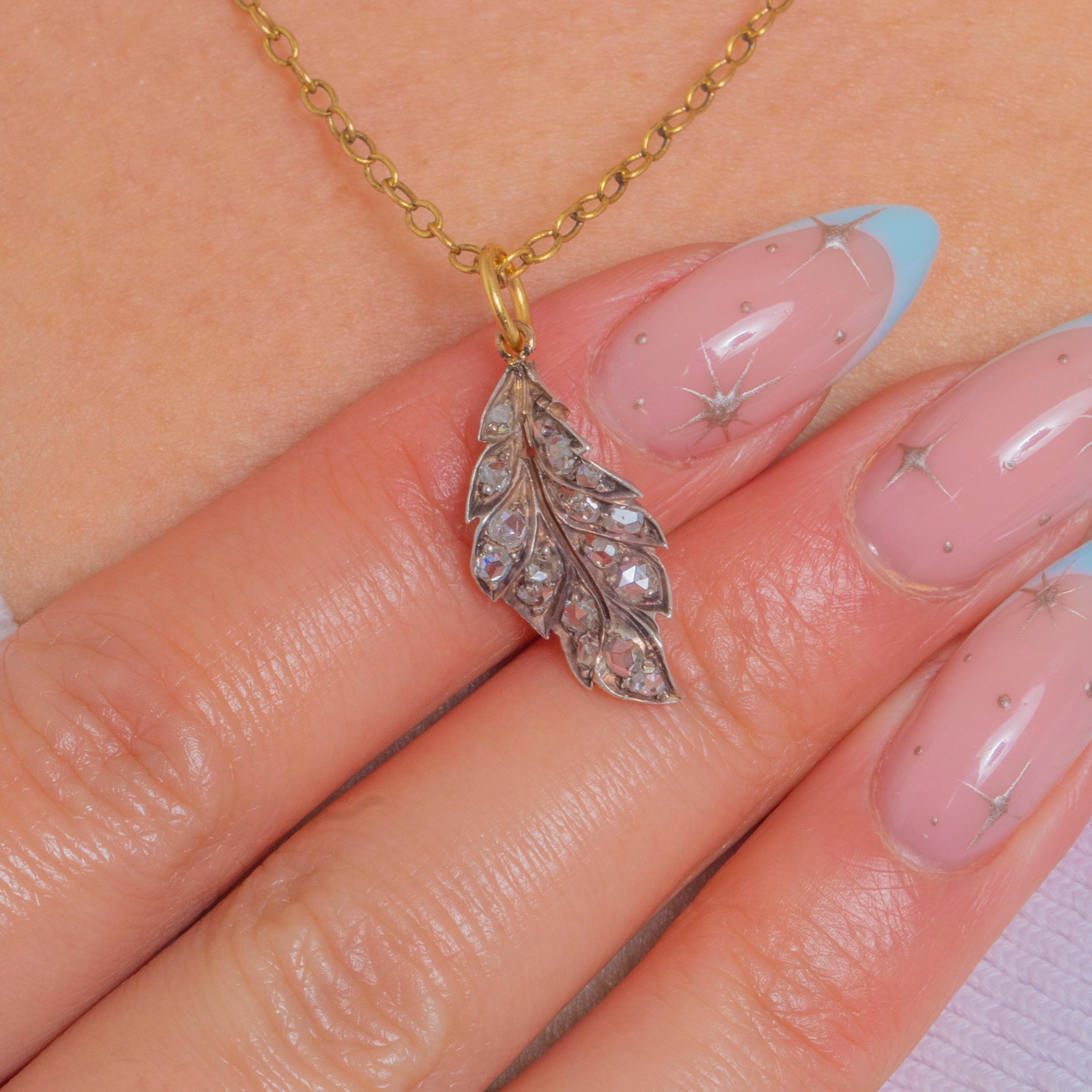 A delicate Victorian leaf charm alive with softly shimmering rose-cut Diamonds. The naturalistic frond is set in a Silver frame, the Diamonds arranged like fine veins for a gentle, antique sparkle. The contrasting warmth of 18ct Gold completes the look with timeless elegance.