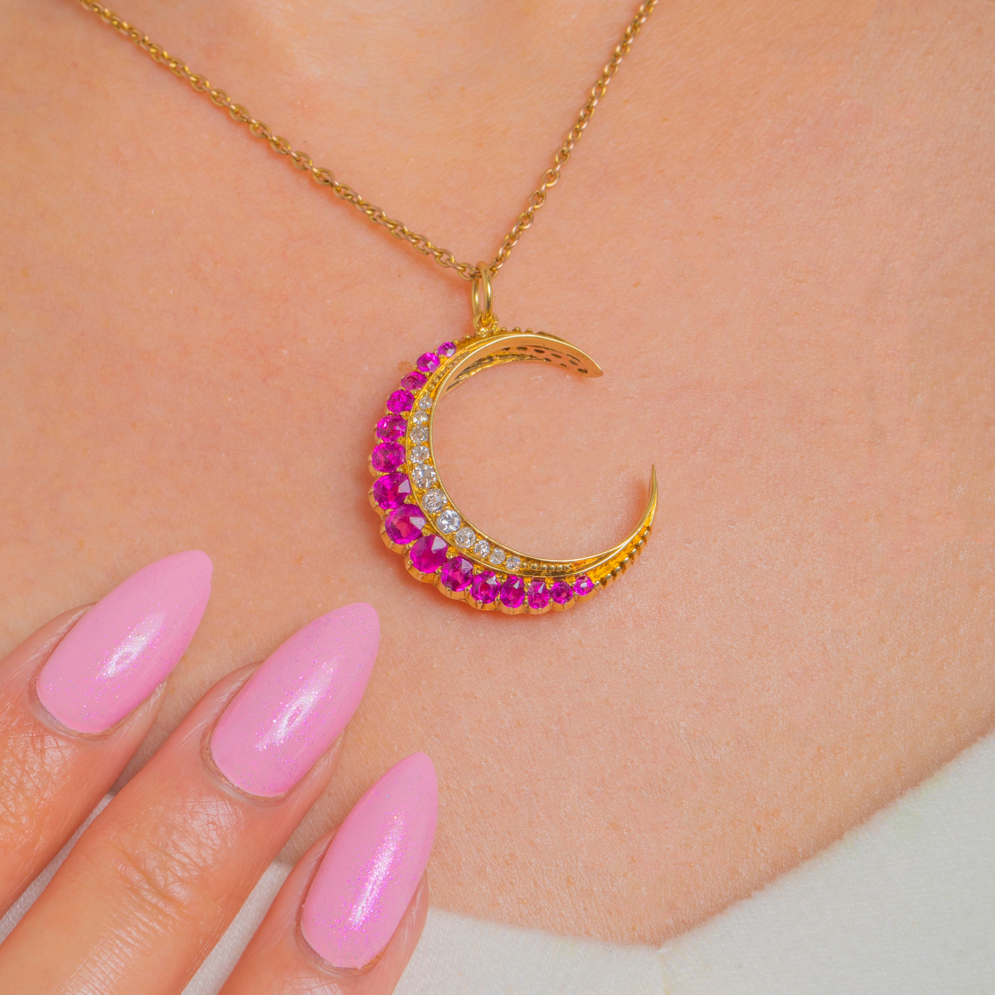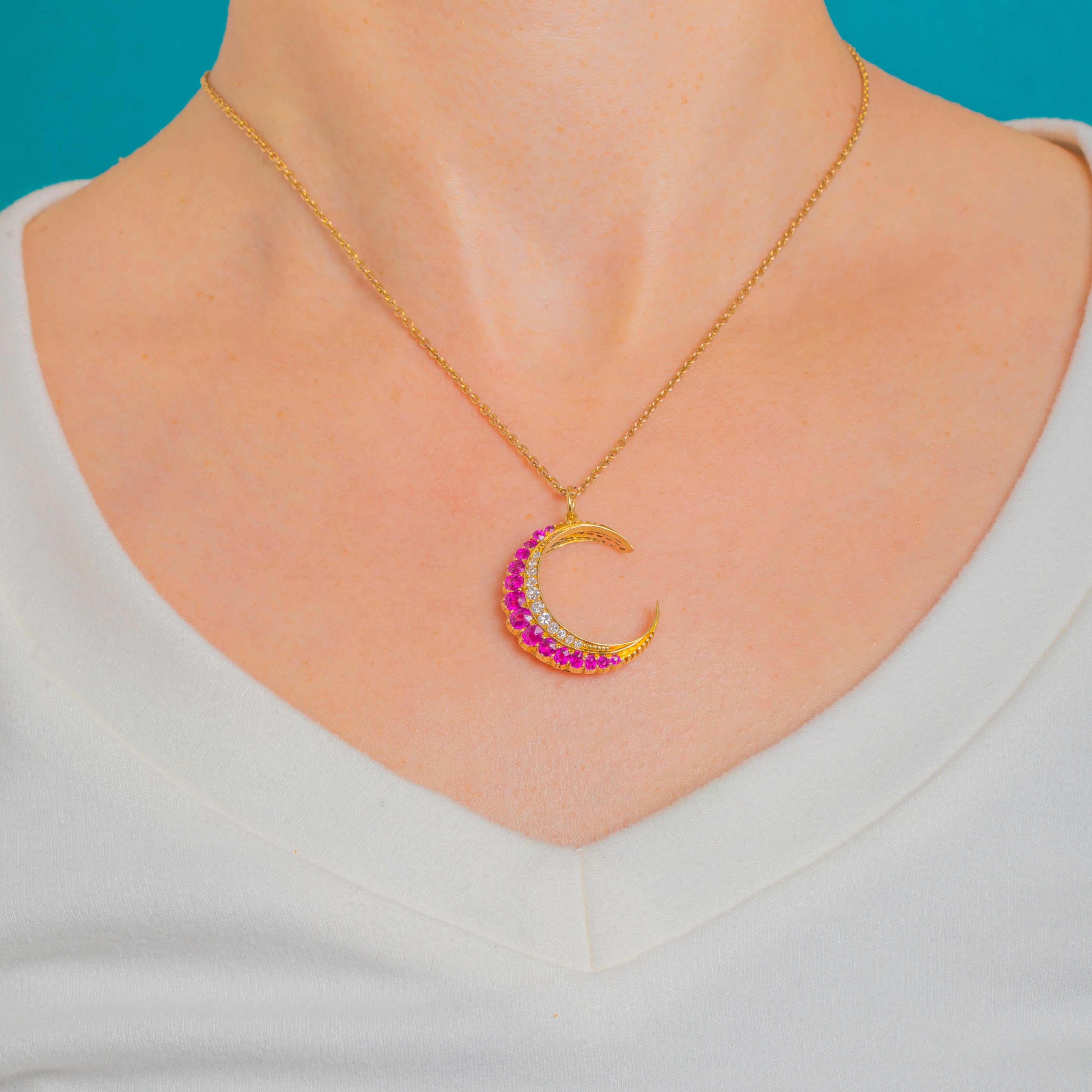 A luminous crescent moon traced in 18ct Gold, this pendant glows with a border of vivid Rubies and a delicate inner ribbon of twinkling Diamonds. The Rubies graduate beautifully around the outer arc, their rich colour heightened by the warm Gold, while the Diamonds add a refined, celestial sparkle.