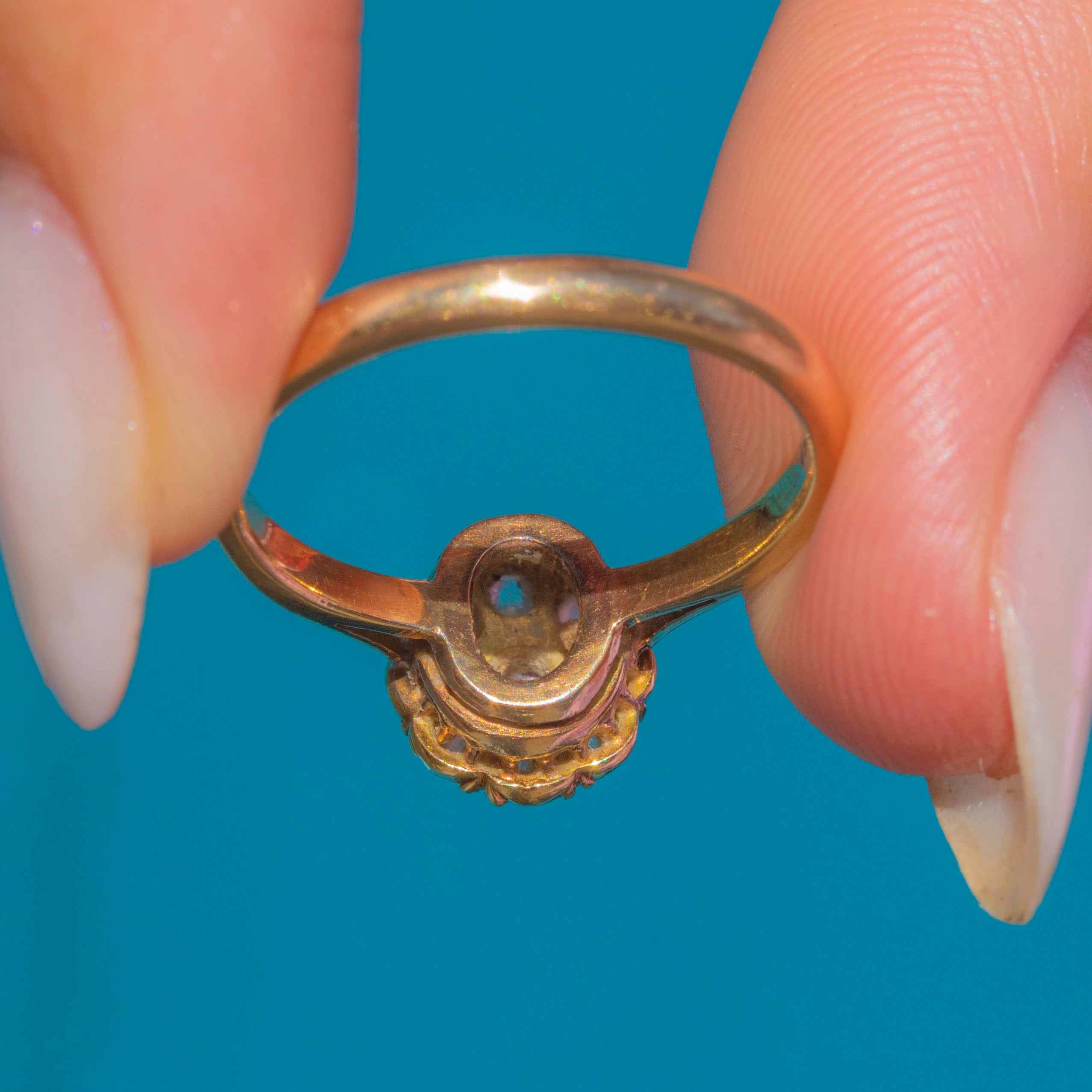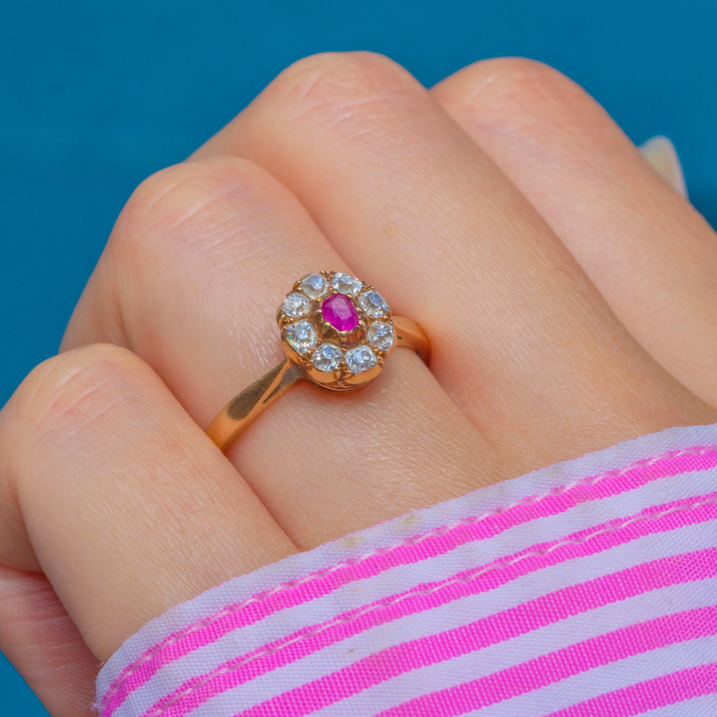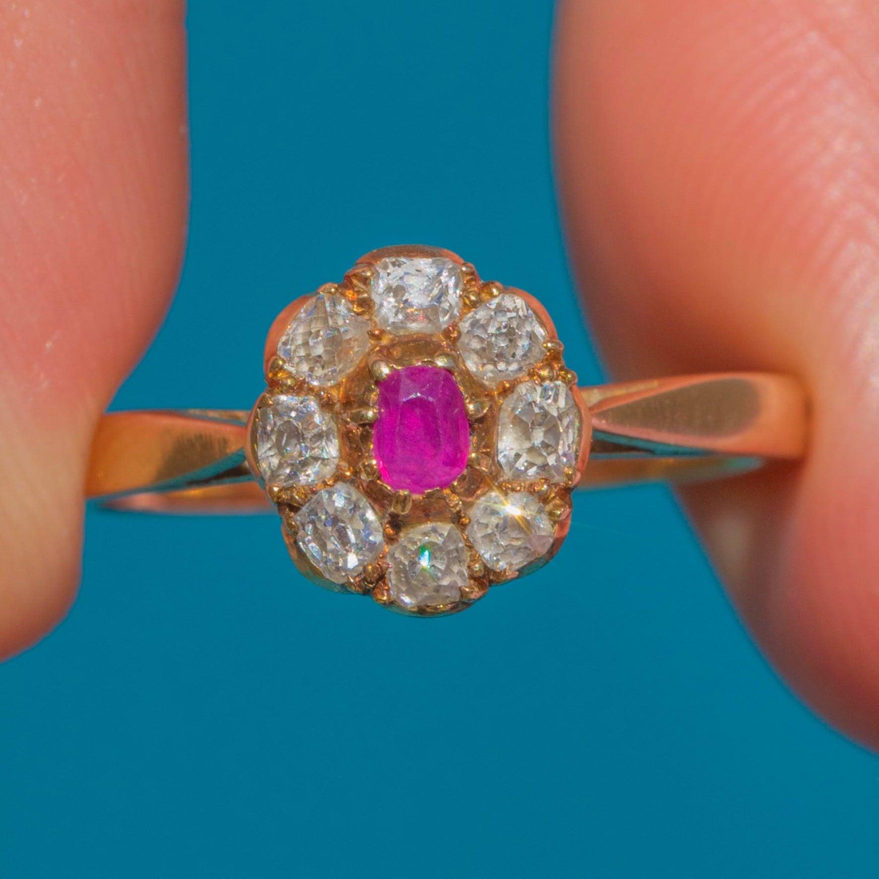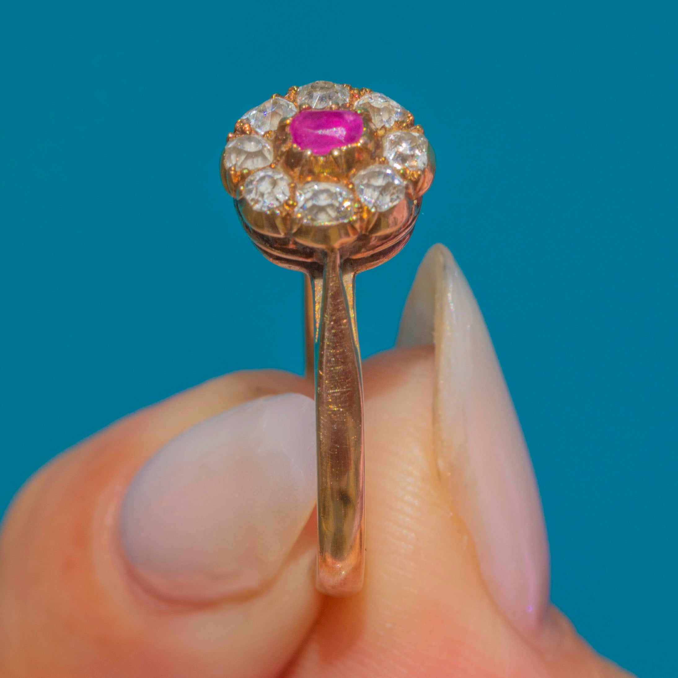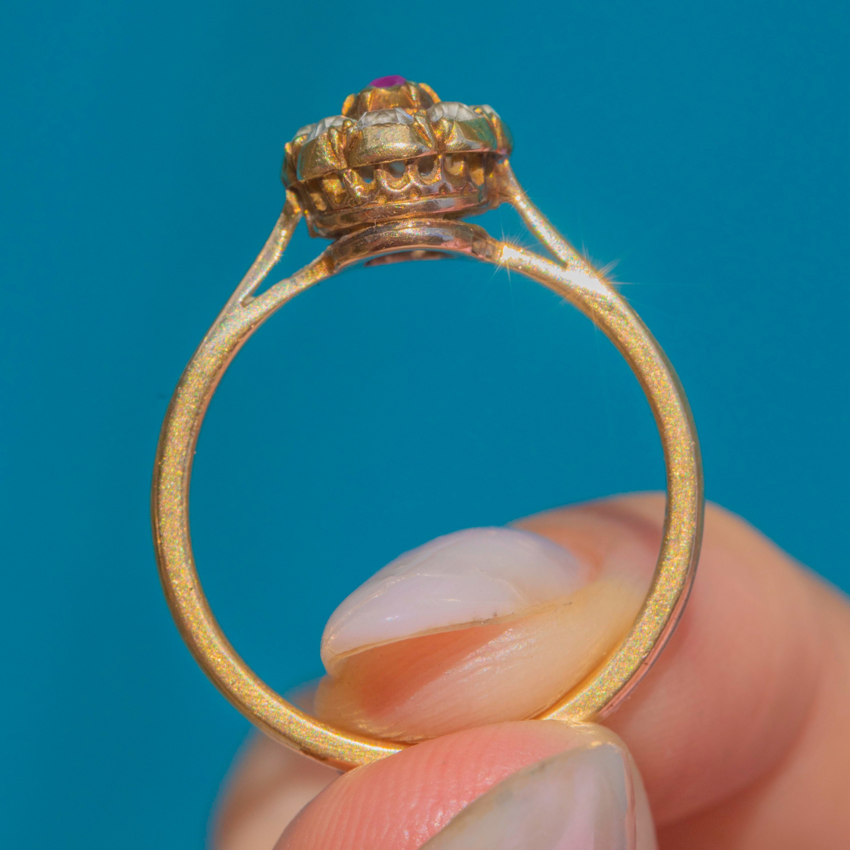 Antique 18ct Gold Ruby Diamond Flower Cluster Ring