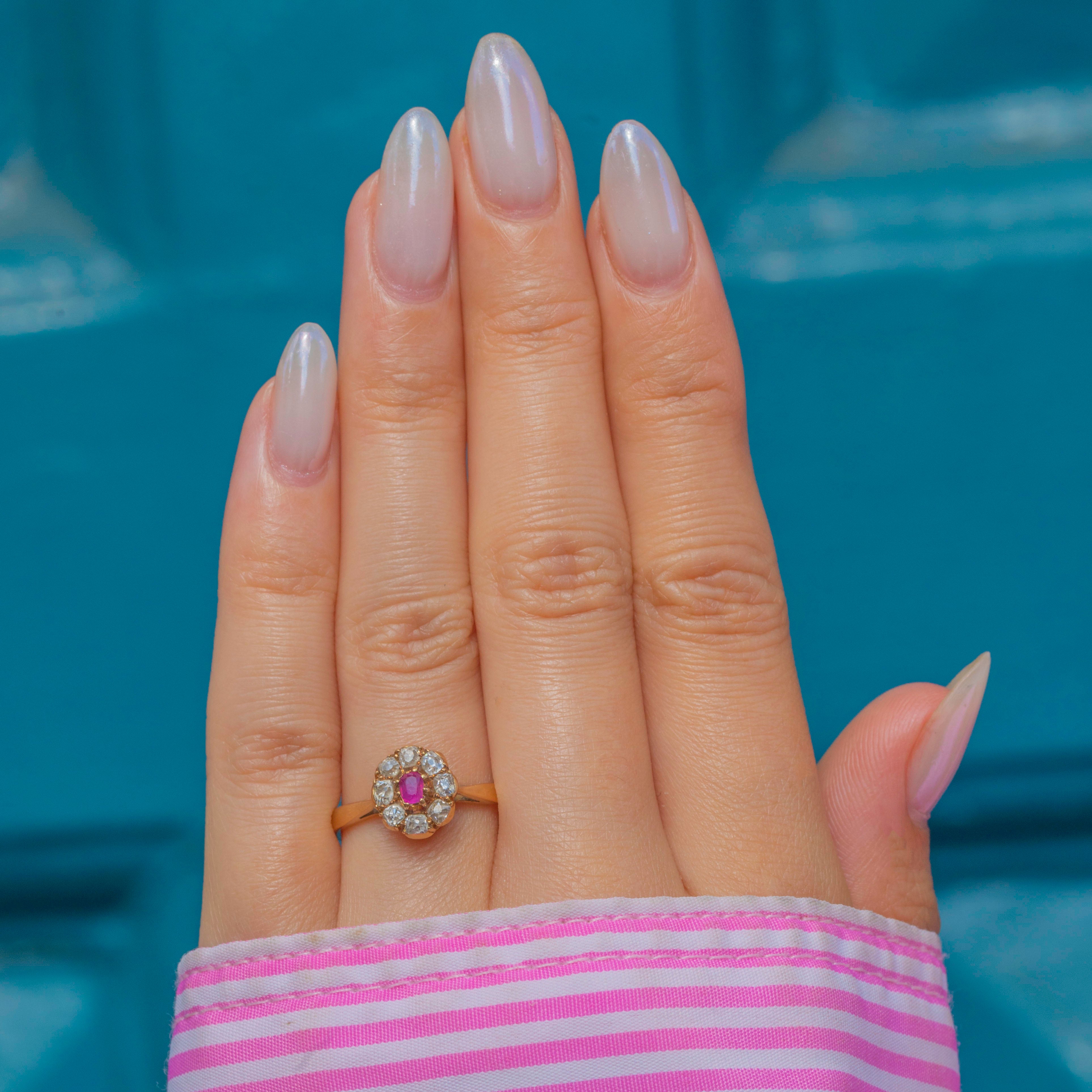 We love the timeless appeal of this Ruby Diamond cluster ring! The Ruby has a pretty fuchsia hue and is surrounded by a 0.20ct halo of old-mine-cut Diamonds.