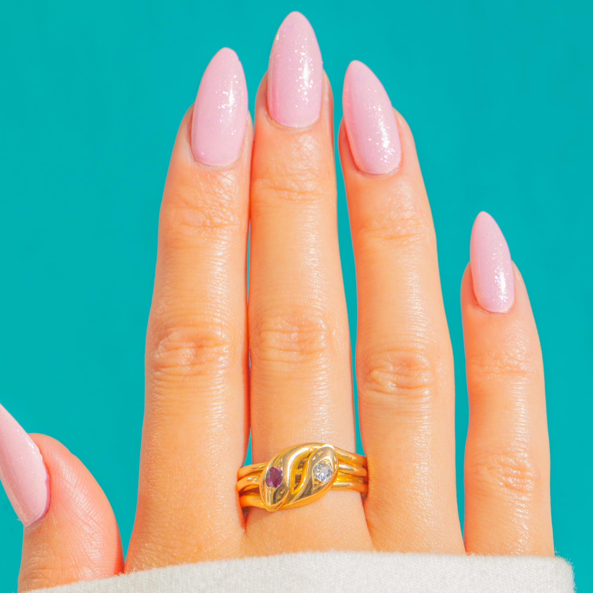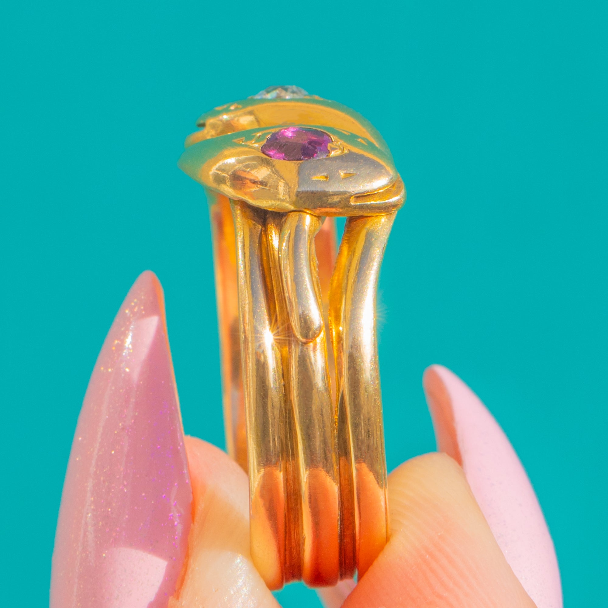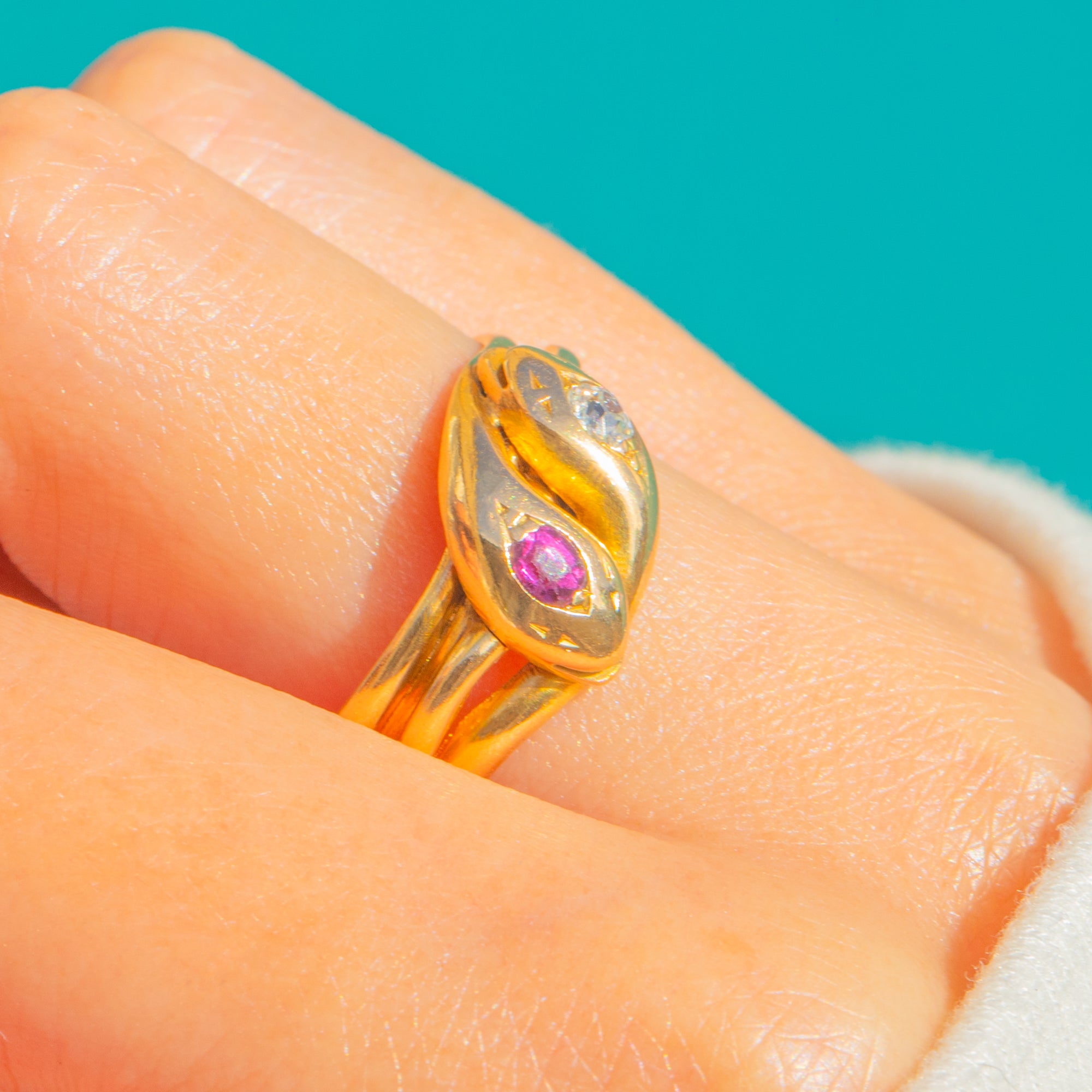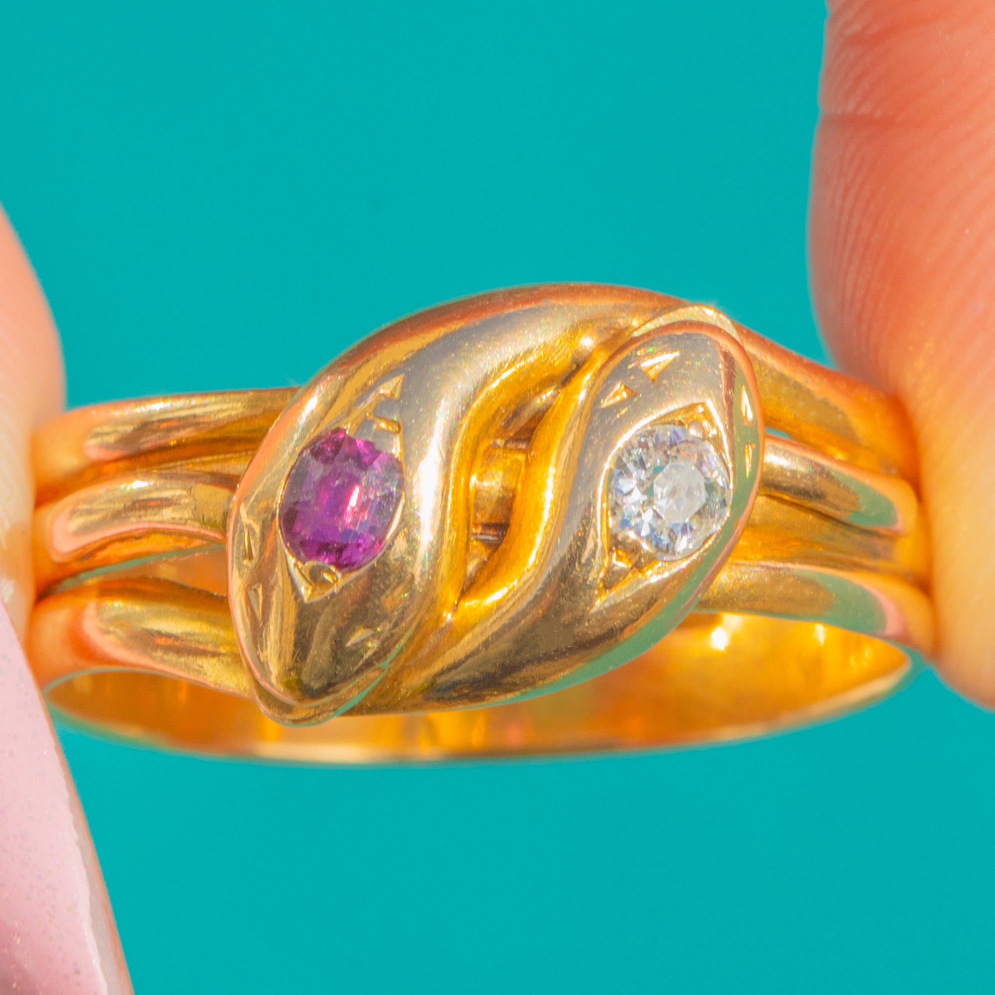 A lithe Edwardian snake ring in rich 18ct Gold, set toi-et-moi with a sparkling Diamond and a vivid Ruby. The twin gems nestle together in a romantic embrace, their contrasting fire and glow beautifully framed by the ring’s graceful, serpentine flow.