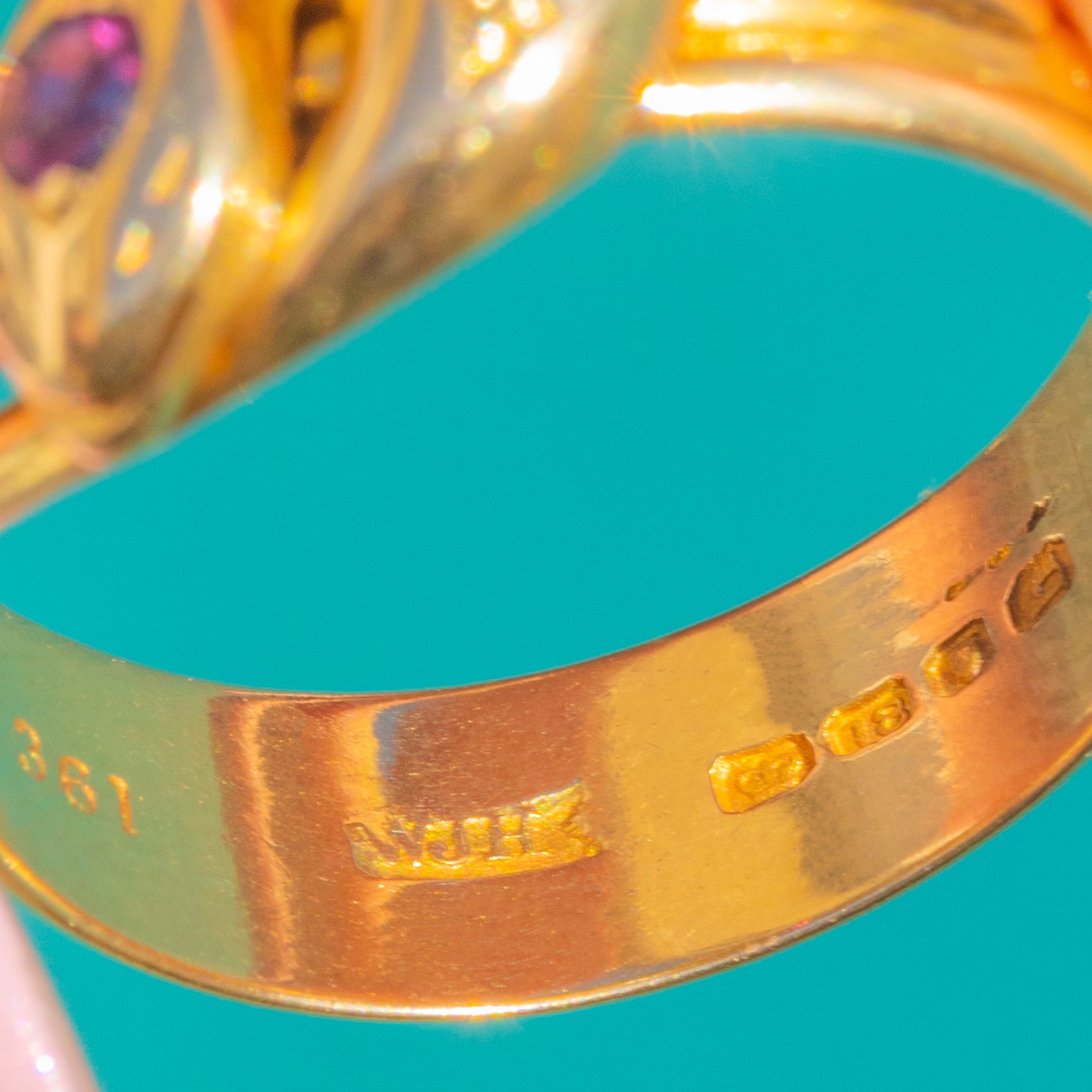 EXCELLENT: The Ruby and Diamond are bright with no obvious chips or abrasions, and both are securely set. The 18ct Gold has been polished to a high shine with minimal surface wear. The shank is sturdy with no noticeable thinning and no obvious signs of prior resizing, with all hallmarks clear.