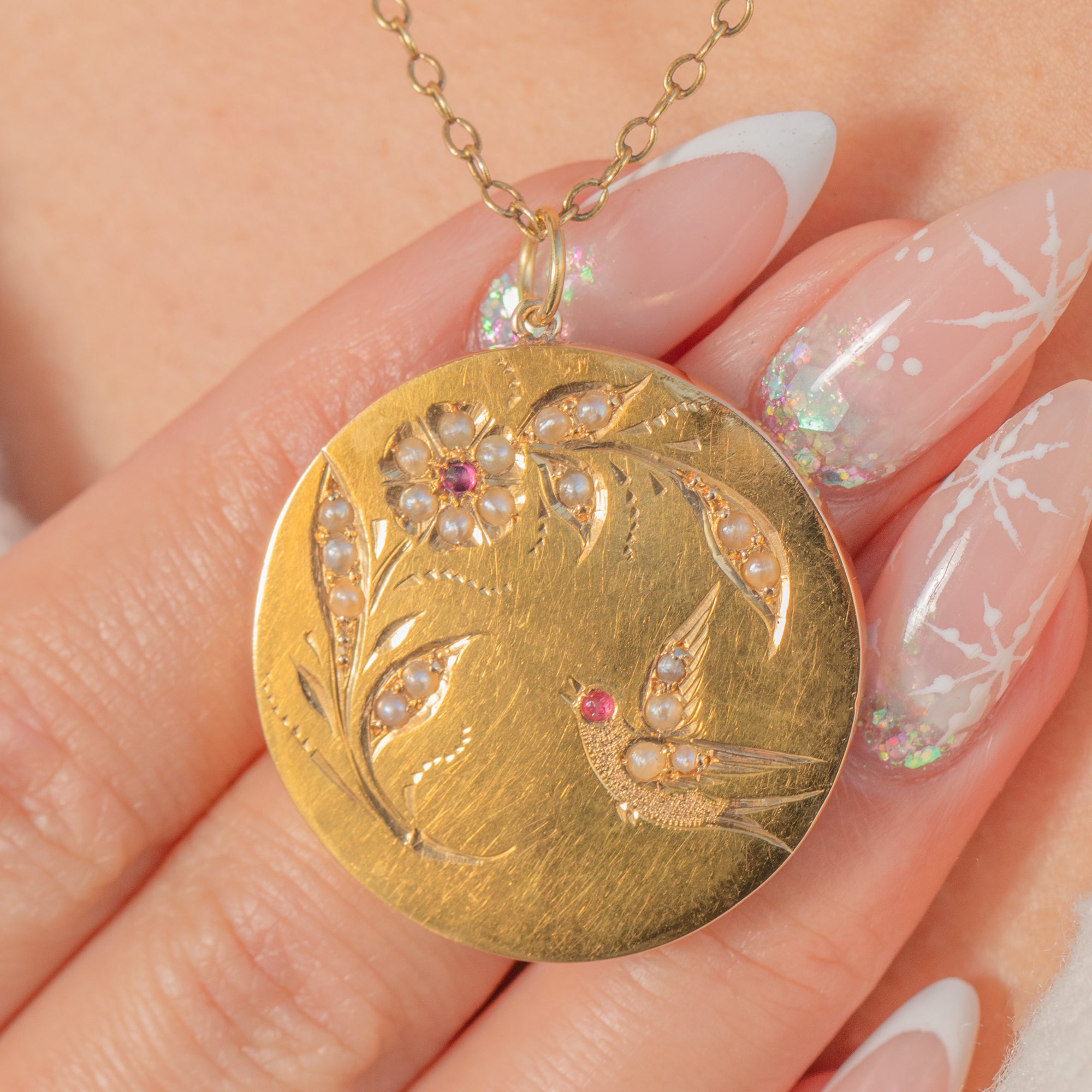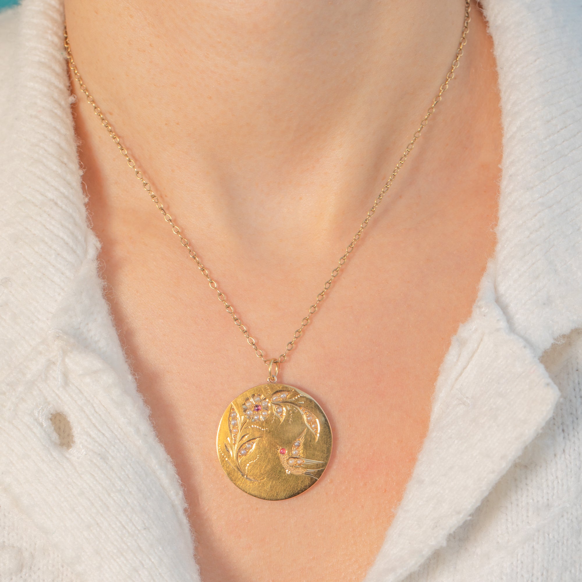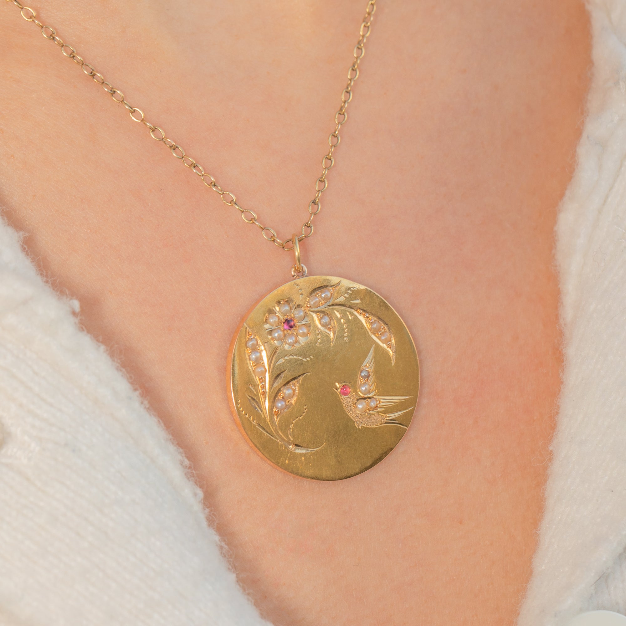 A charming Edwardian 18ct Gold disc pendant, beautifully hand-engraved with a swallow in flight amidst a delicate foliate spray. The soft, satin backdrop is enlivened by bright highlights, with a constellation of tiny Seed Pearls tracing the bird and foliage for a fine, romantic sparkle. Two petite red Paste accents add a subtle pop of colour.