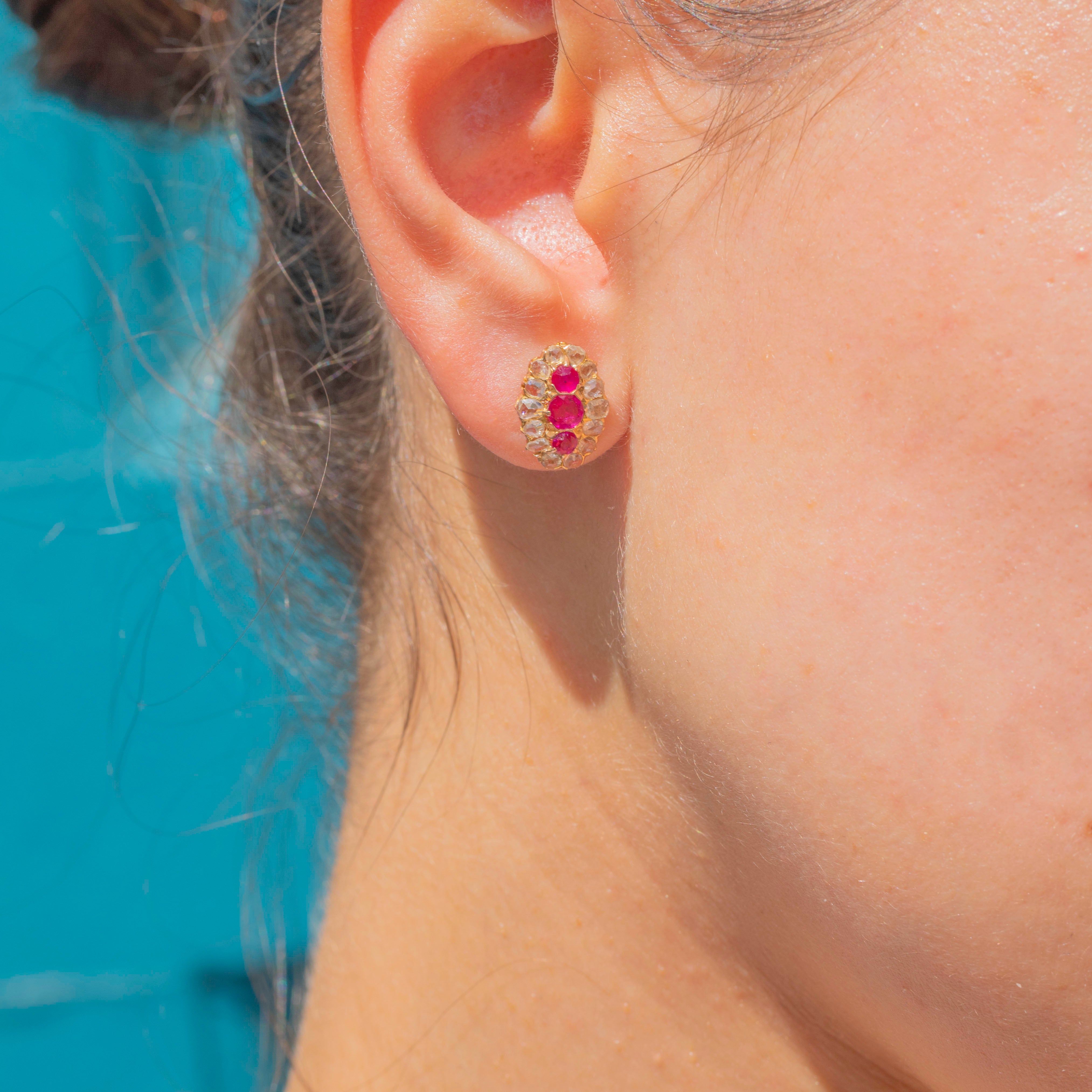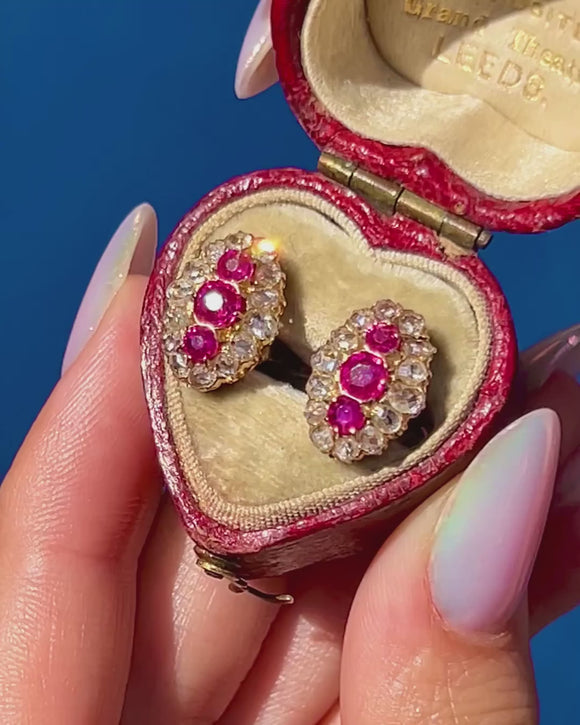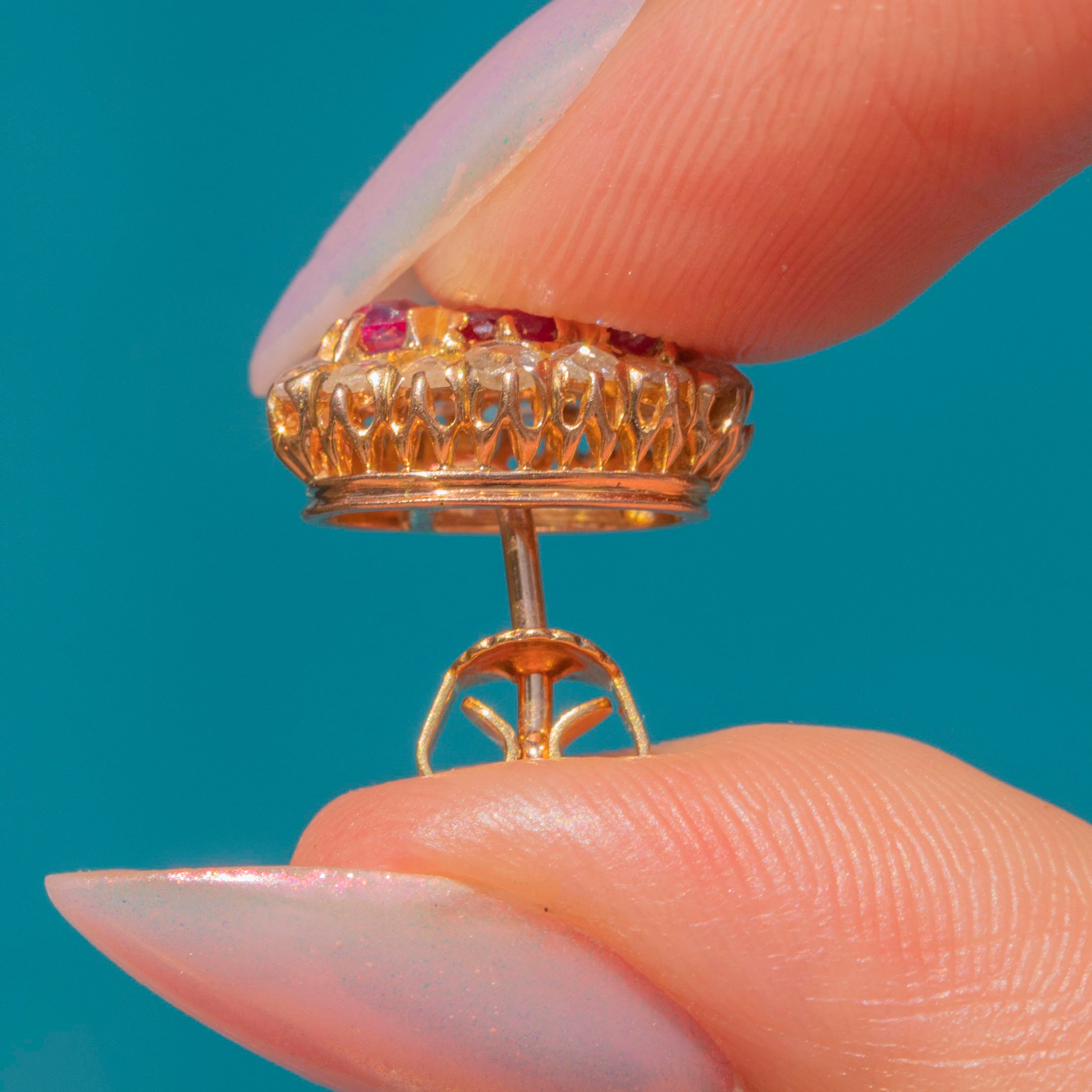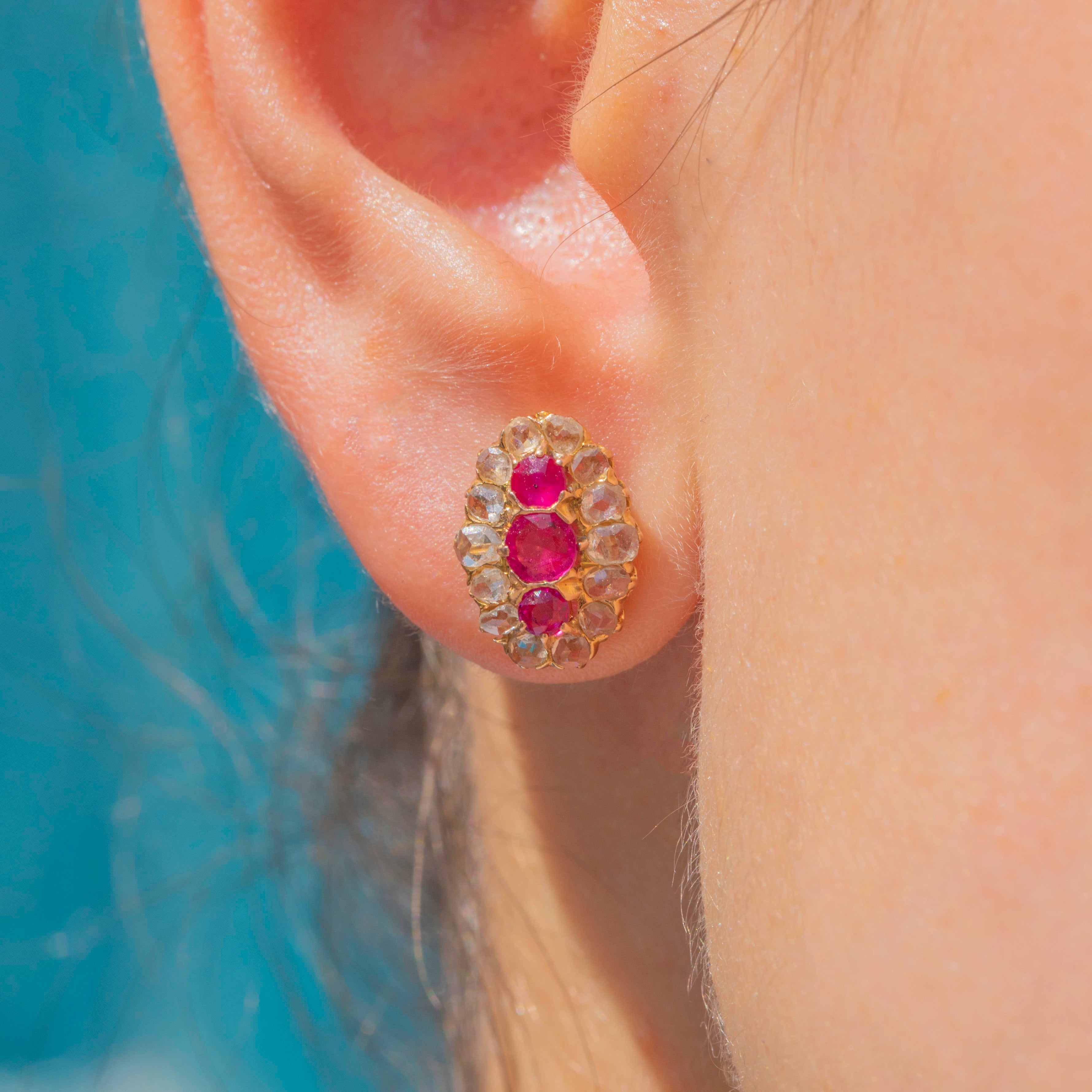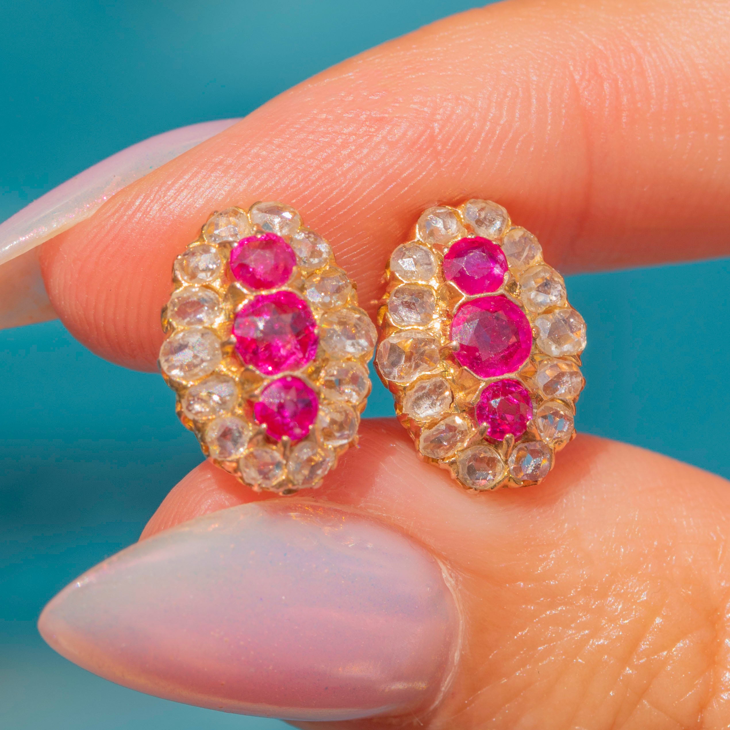 These antique 18ct Gold Ruby rose-cut Diamond cluster stud earrings are a marvel! Set in 18ct Gold are a total of twenty-eight scintillating Diamonds and six berry red Rubies, culminating in a gemstone cluster that leaves nothing more to be desired!