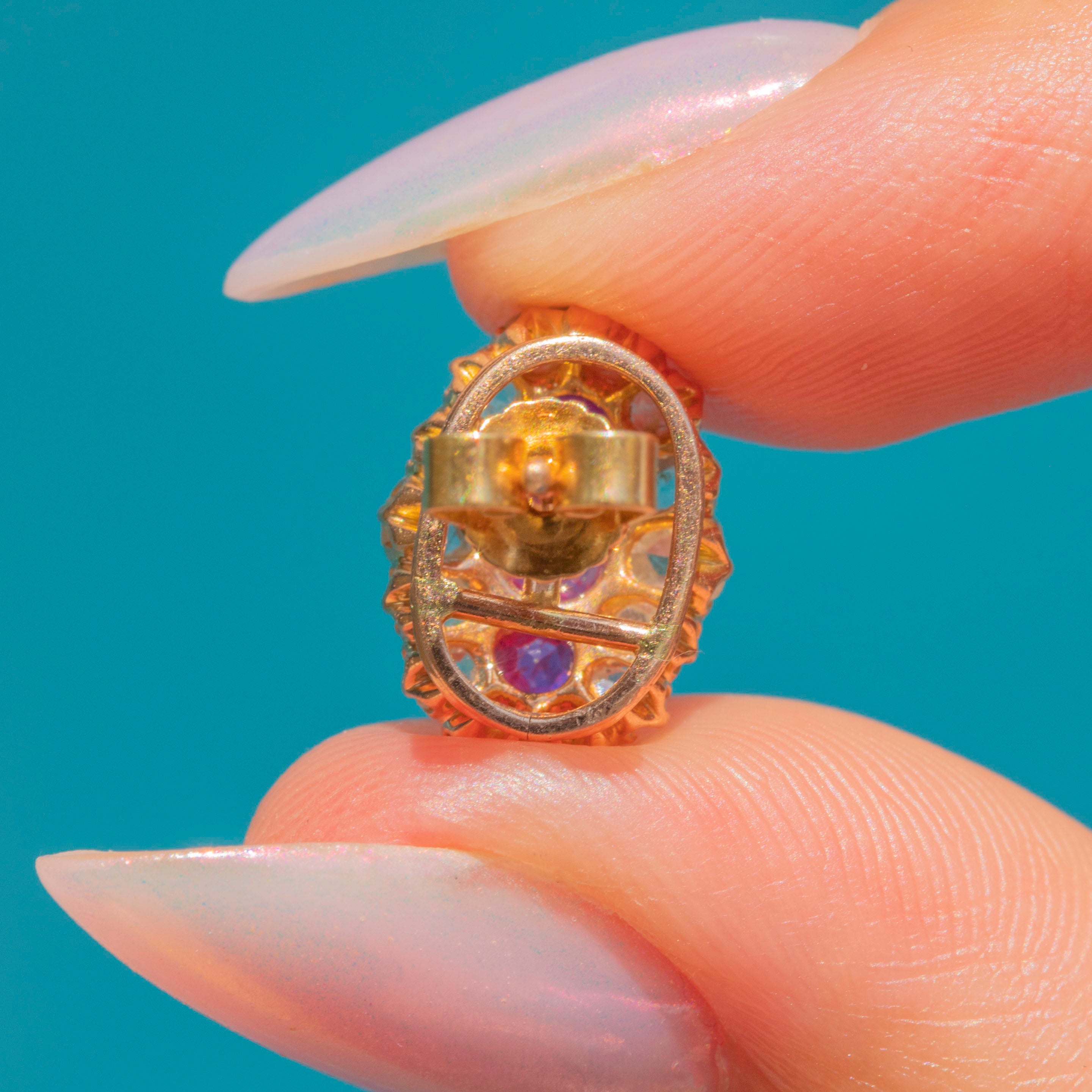 VERY GOOD-EXCELLENT. These antique 18ct Gold rose-cut Diamond cluster stud earrings are in fab condition. The Diamonds and Rubies are secure and super fiery, even to this day! The only thing to note is that the butterfly backs are not perfectly matched; it's likely that one was lost over the years, so a replacement has been used. However, the main thing is that they keep the pair secure in the ear, and you won't notice this difference when you wear them! What a stunning pair!