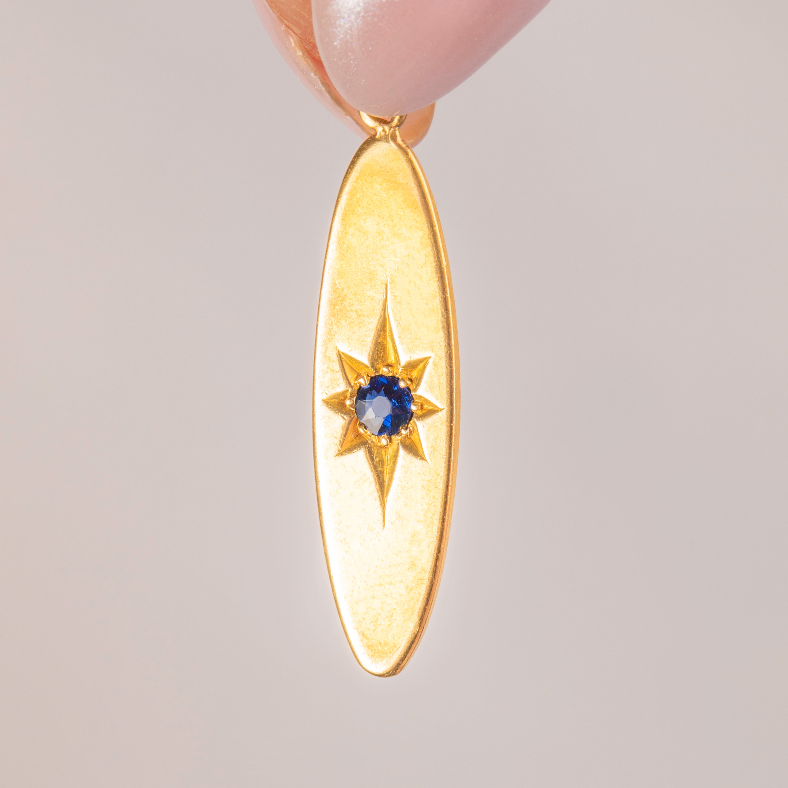 EXCELLENT. This antique 18ct Gold Sapphire star-set pendant is in excellent condition! The smooth slab of 18ct Gold is in perfect nick, with a lovely saturation and the star setting perfectly carved into the Gold. The Sapphire is securely set and is free from chips or signs of wear. With a soldered jump-ring, you can wear this antique 18ct Gold Sapphire star set pendant with the utmost confidence!