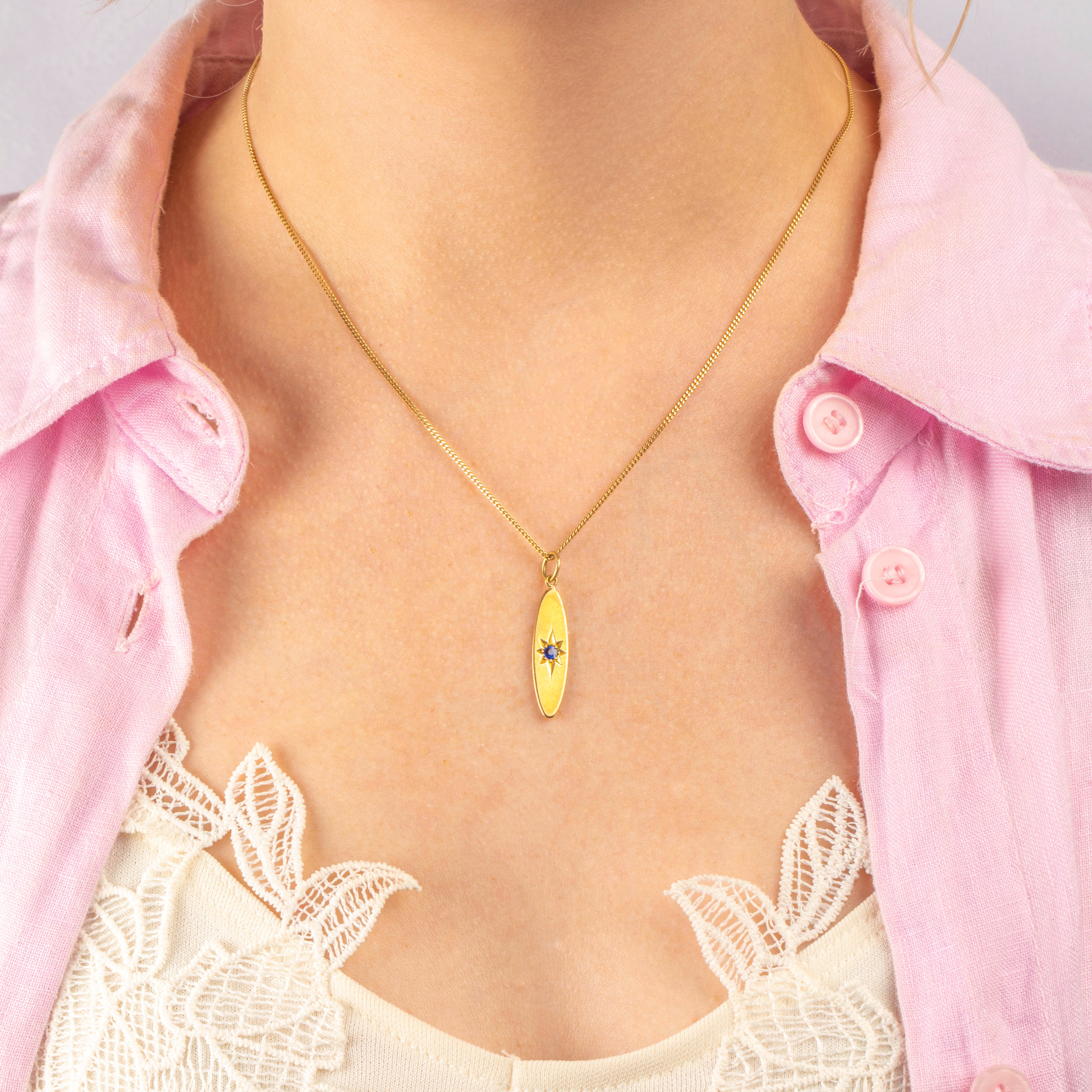 The azure blue of her Sapphire centre looking striking against the rich saturation of the Gold and within a star setting, this Victorian pendant will bring a celestial touch to your outfit. Whether worn alone or nestled amongst other Gold goodies, the beauty of this antique Sapphire charm will beam.