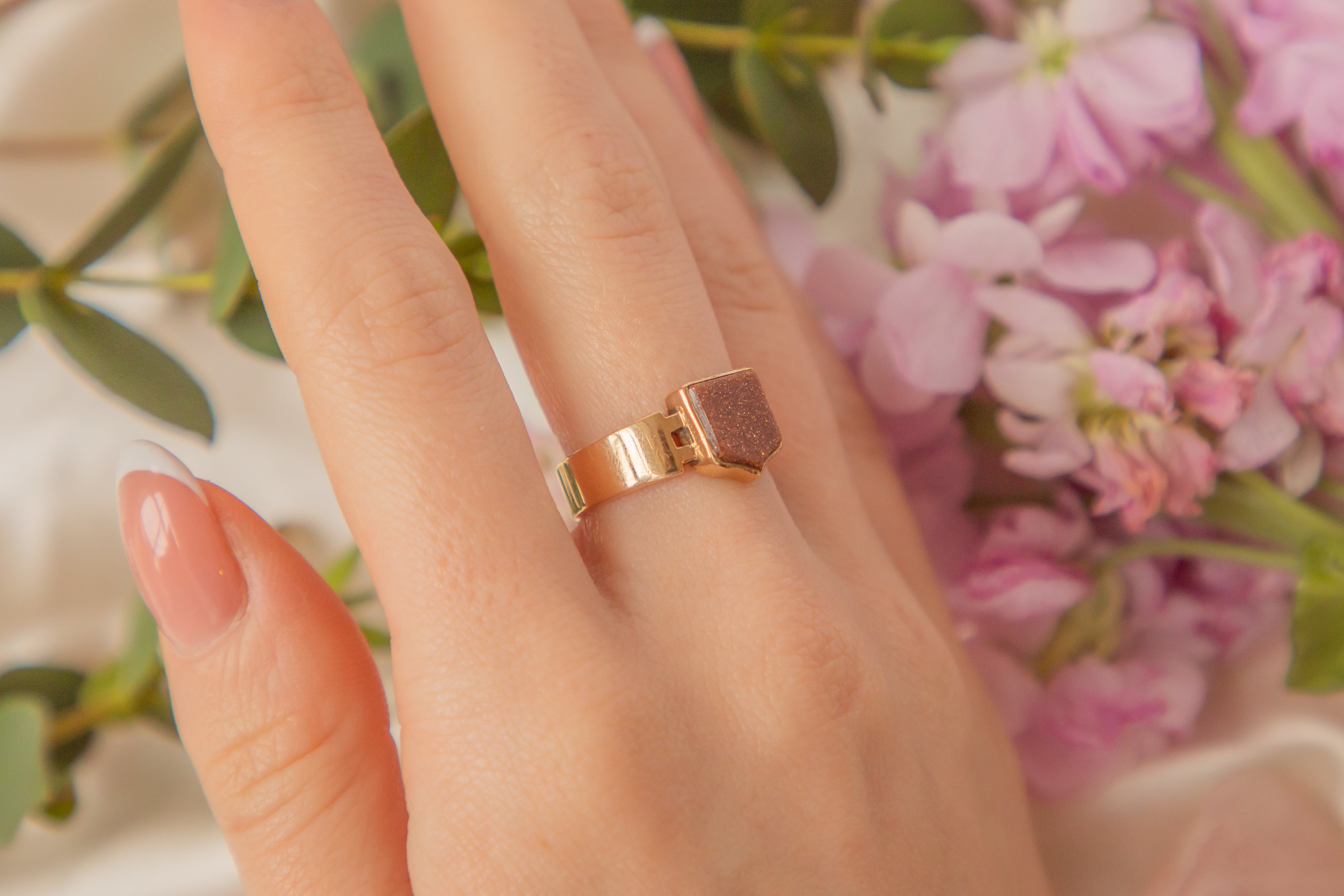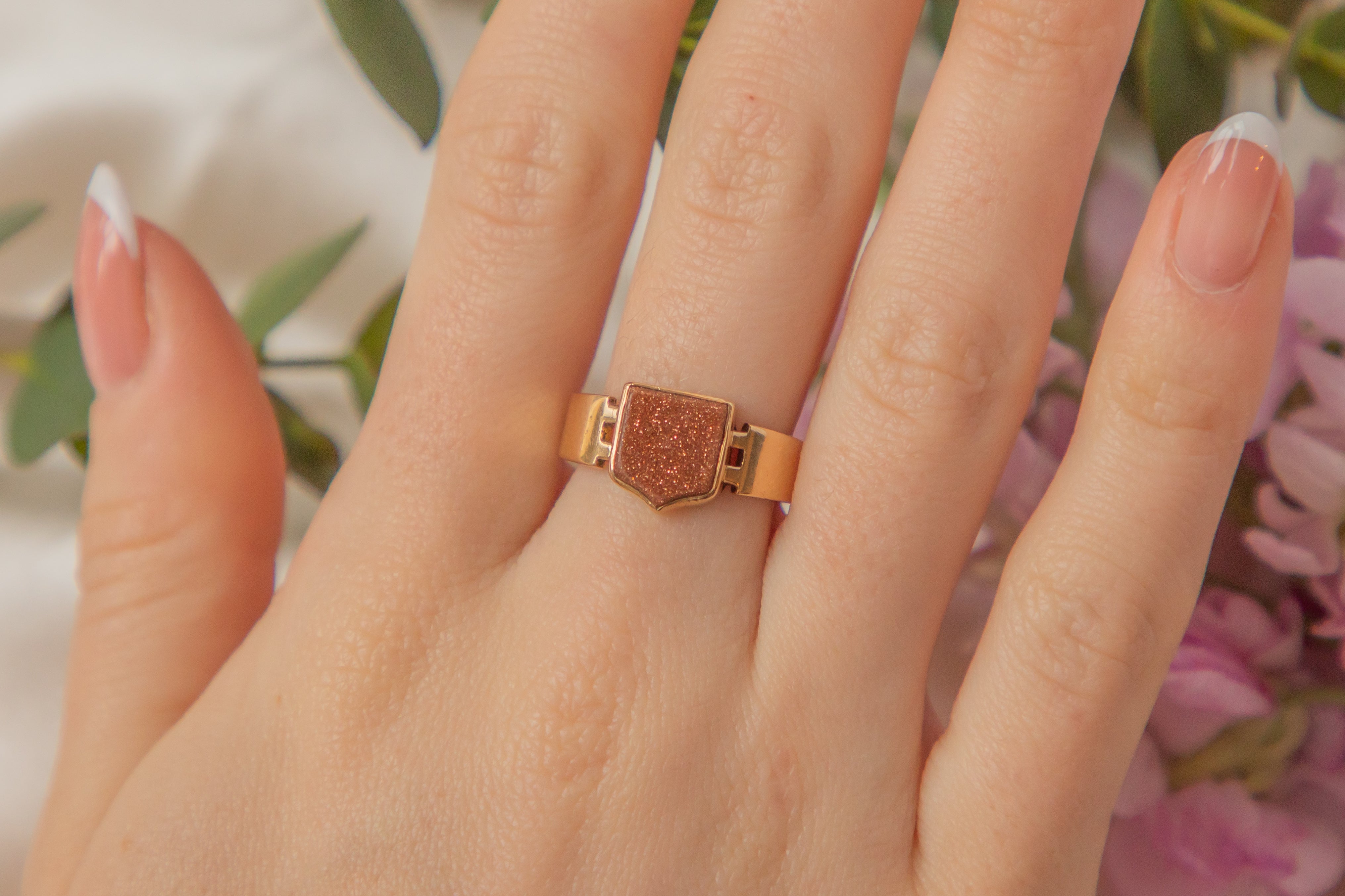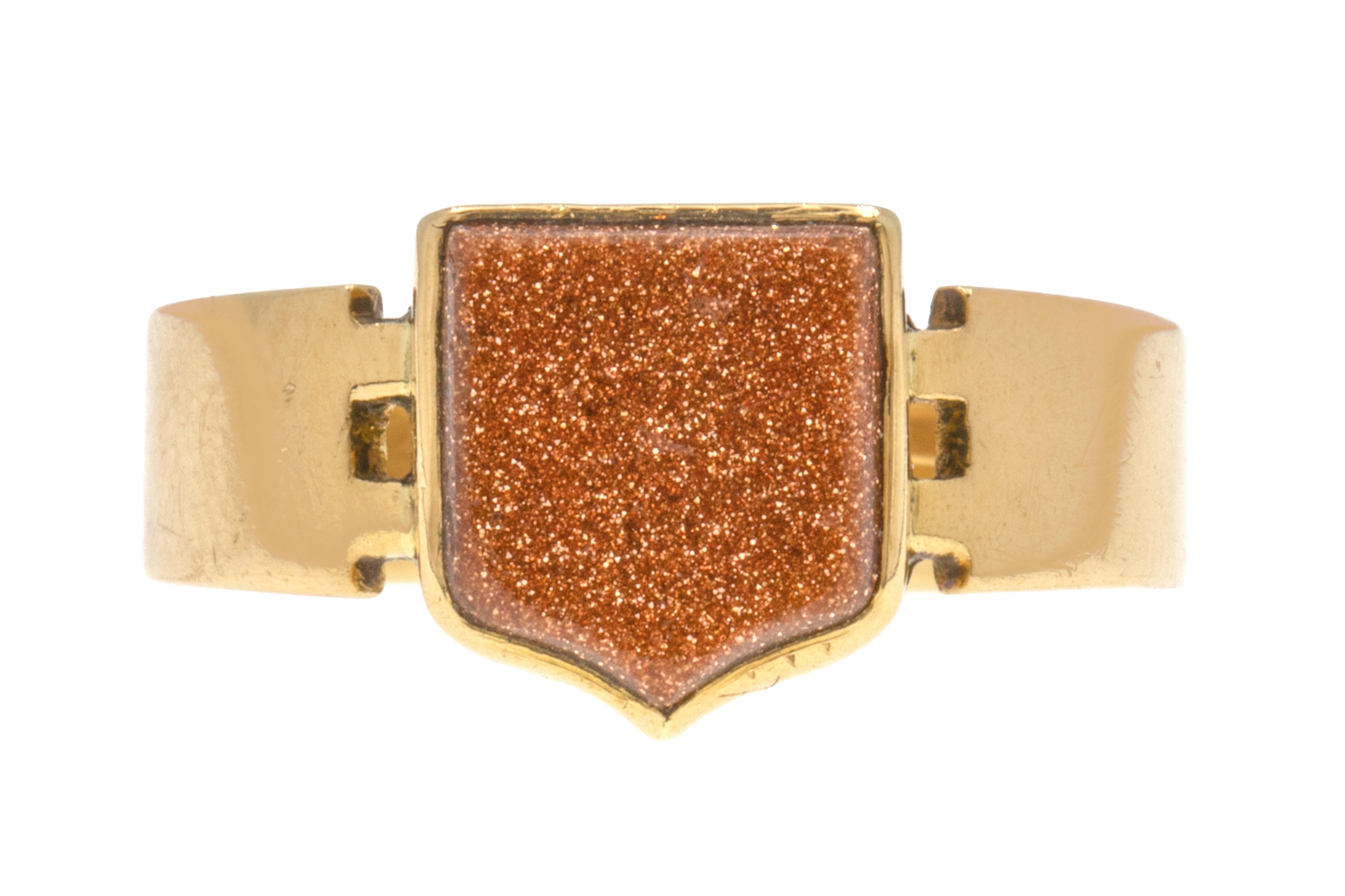 Goldstone, also known as the 'monk's stone', is believed to possess strong protective energy, rich in powerful grounding properties. Fashioned into a shield, an emblem symbolic of strength and protection, we can surmise that this signet ring was created to signify a person's vitality and full spirit. This solid 18ct Gold shield signet ring will stand the test of time while being like no other in your jewellery box. Her sparkling Goldstone will prove hard to resist!