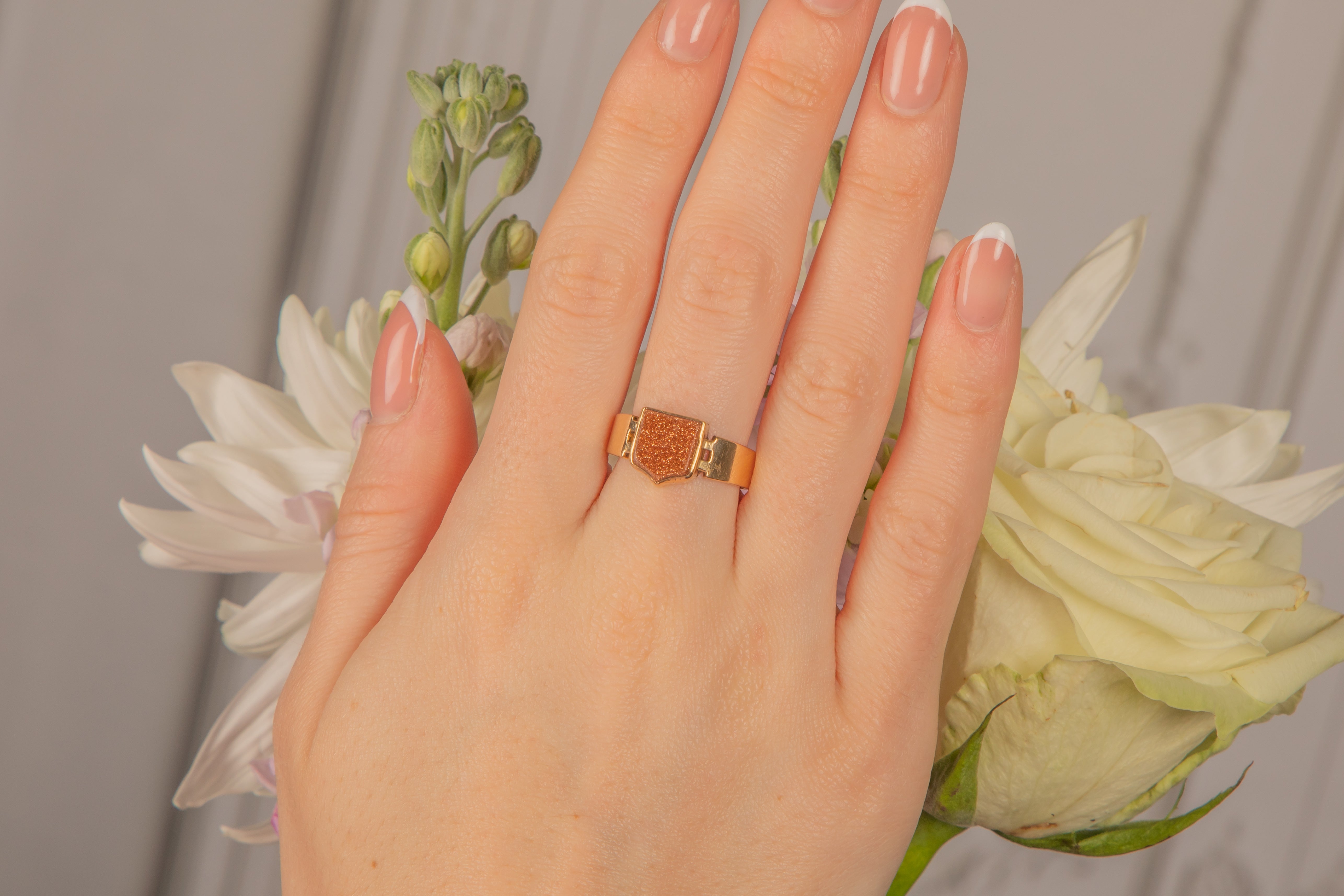 Prepare to be spellbound by this exquisite antique 18ct Gold signet ring. Poised at the centre, is a magnificent Goldstone, a lustrous glistening gem that exudes a warm terracotta hue. Akin to stars in the sky, this Victorian signet ring boasts an abundance of sparkle. Not to mention, she is crafted from solid 18ct Gold throughout!