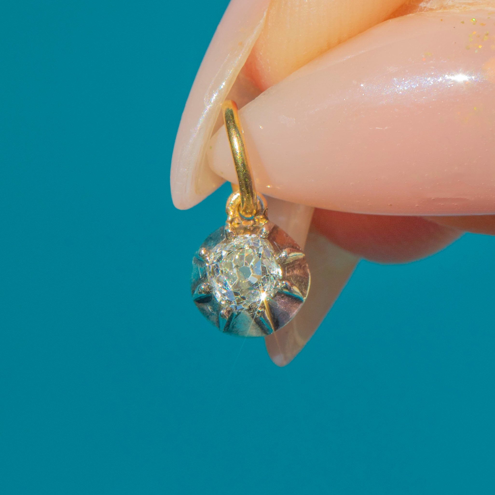 EXCELLENT: The Old Mine Cut Diamond is bright and secure, with no chips or surface abrasions. The Silver collet and 18ct Gold backing are in superb condition with minimal wear, and the Gold jump ring is strong and secure. A well-preserved and charming Victorian jewel.