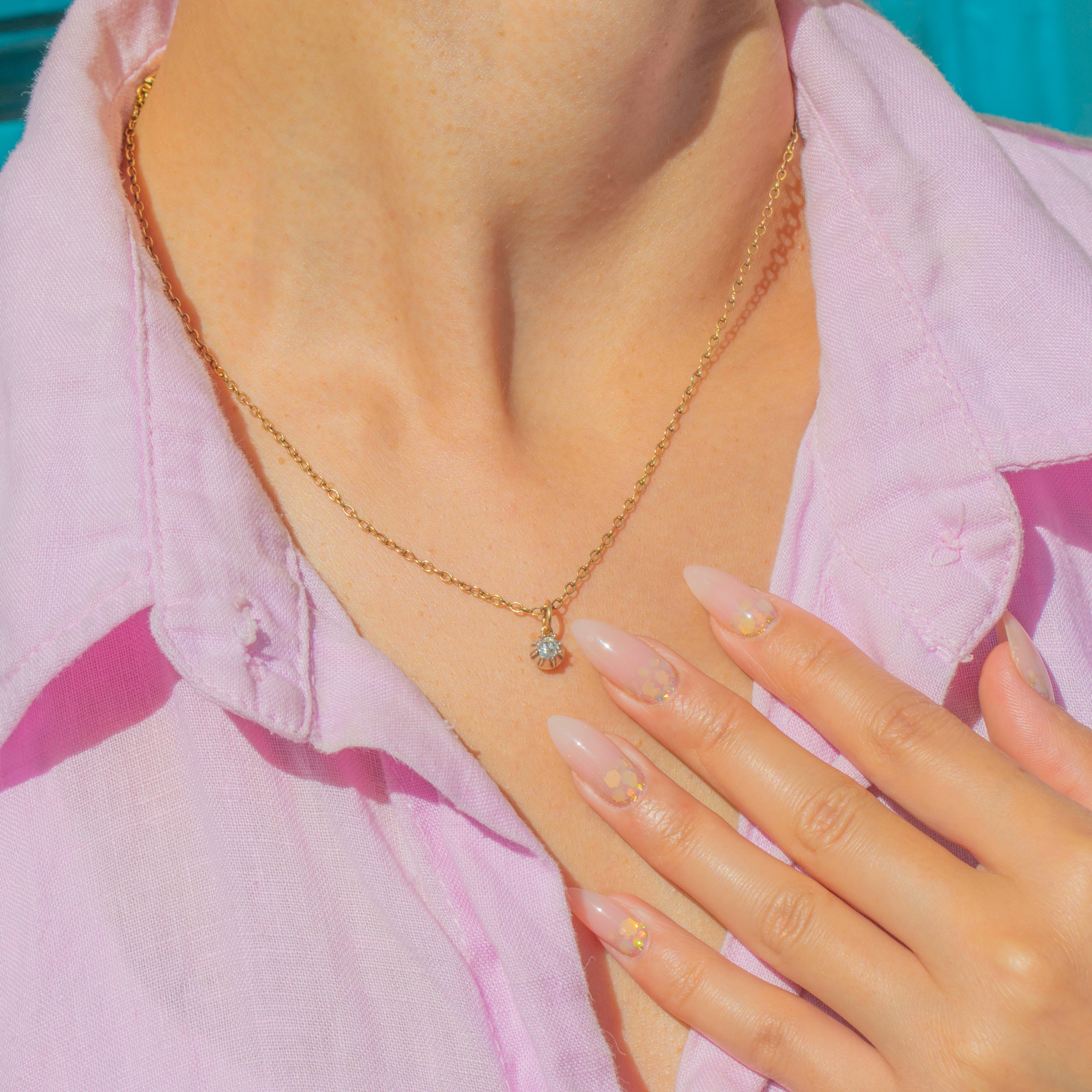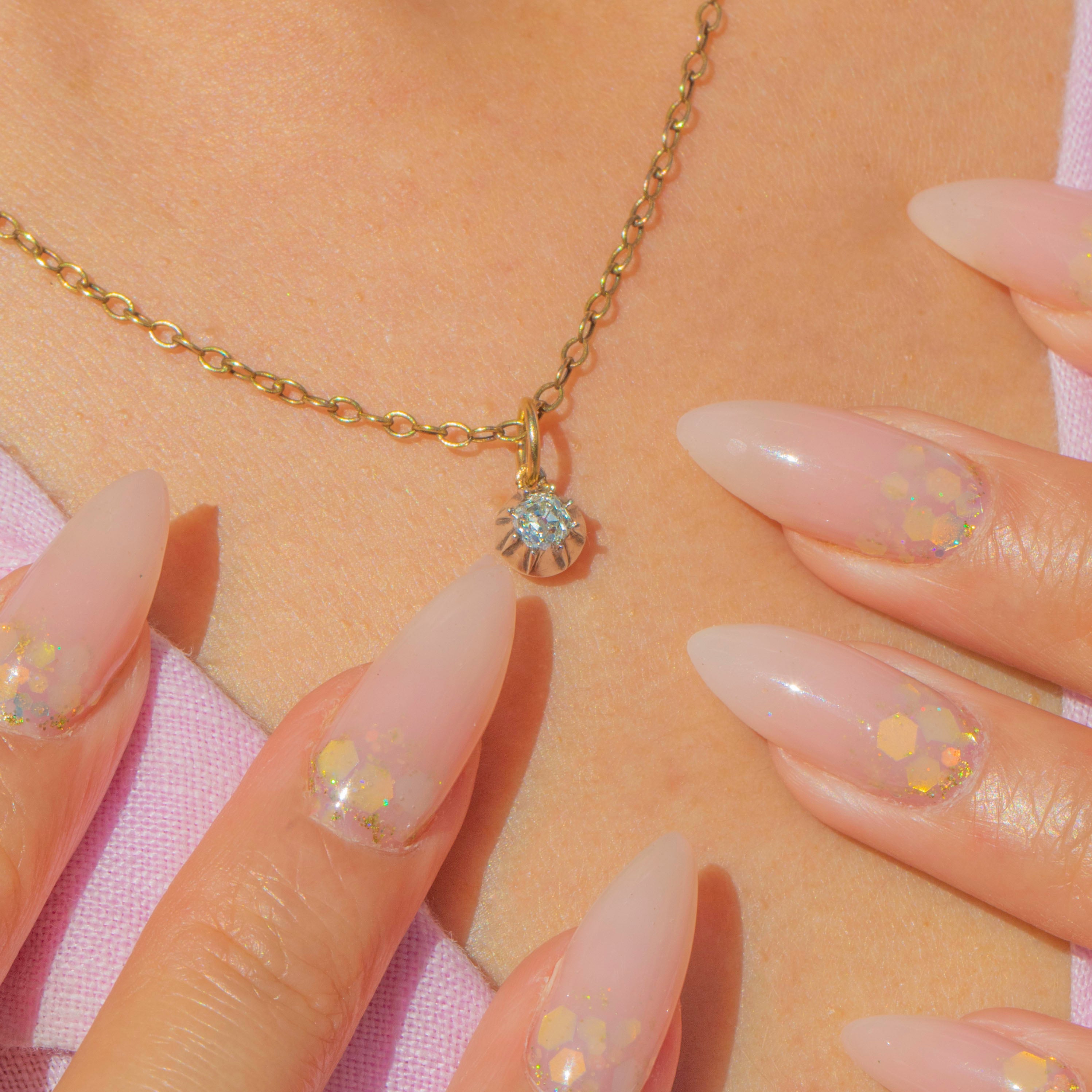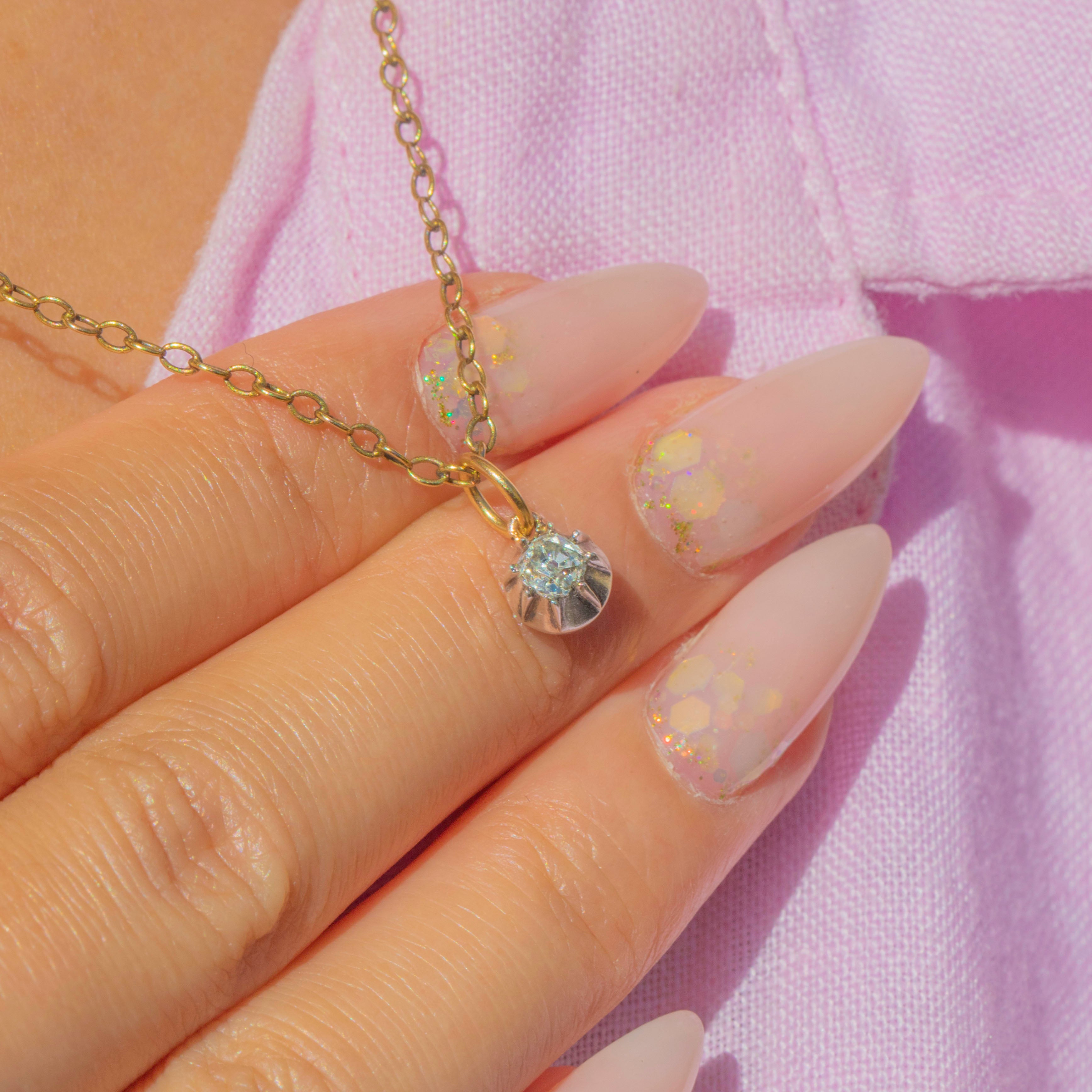 This petite Victorian charm is set with a sparkling Old Mine Cut Diamond weighing approximately 0.20ct. The Diamond, with its charming cushion-shaped facets, has all the fire and character we love in antique stones.