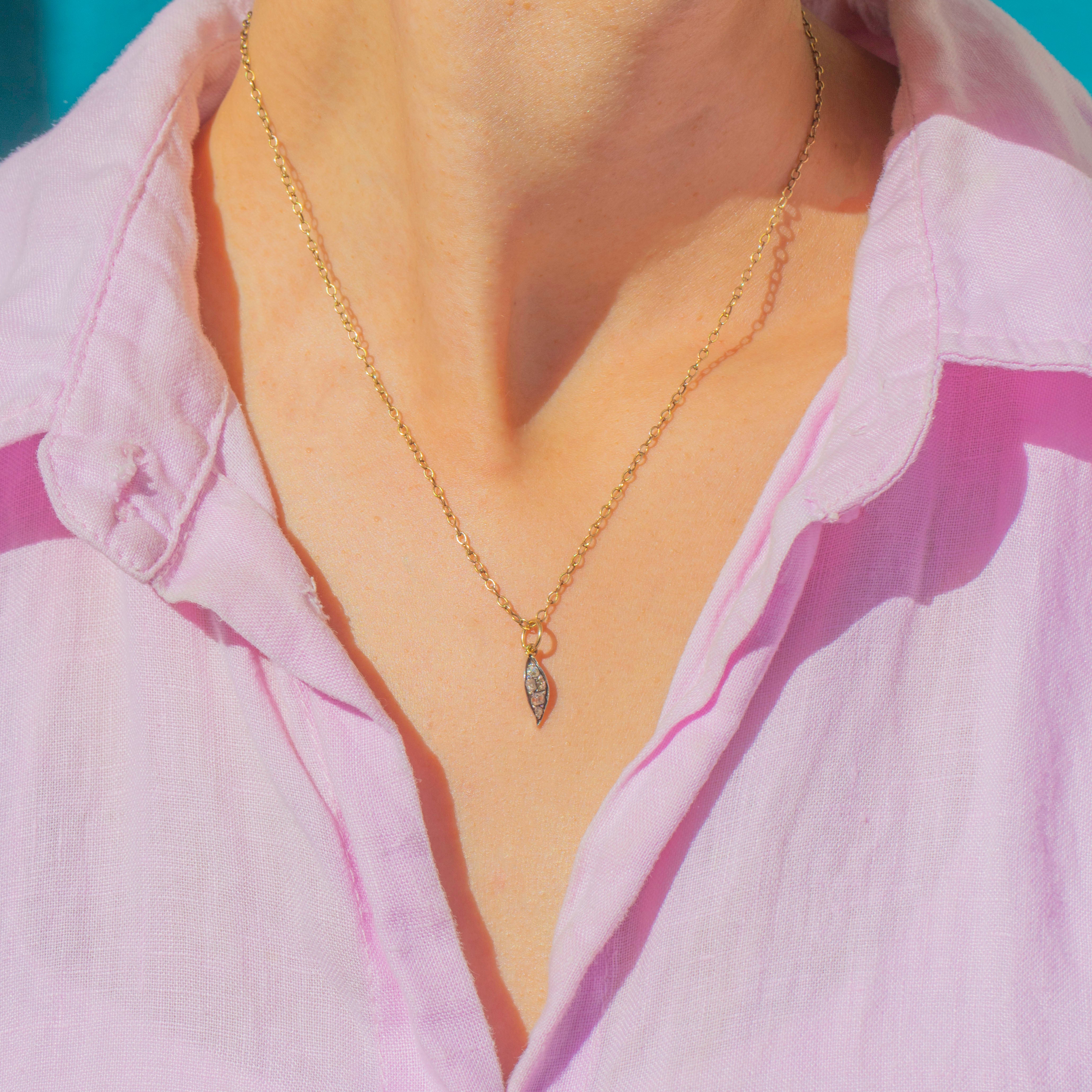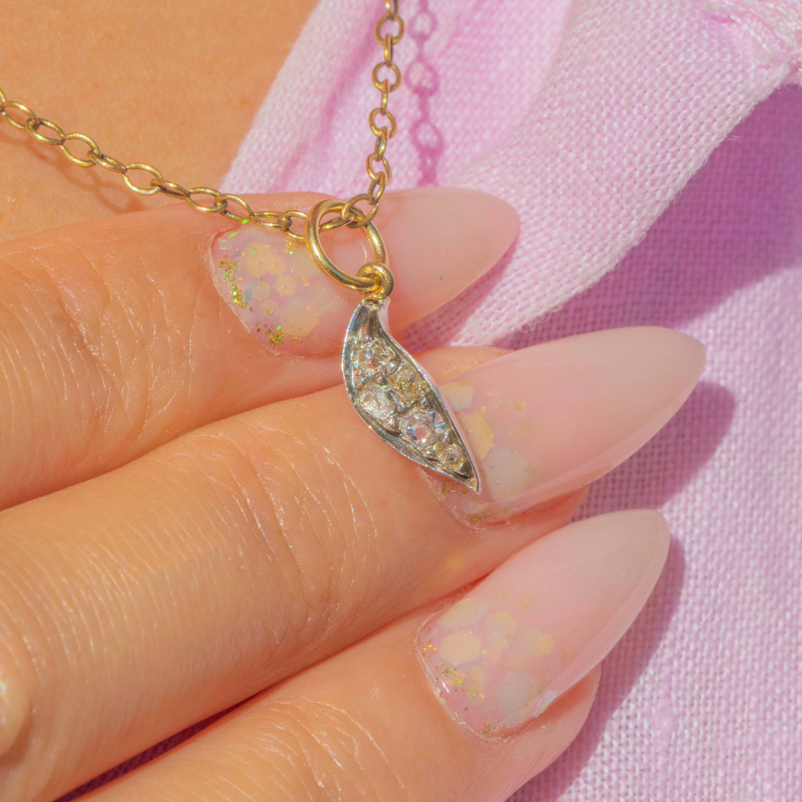 This charming Victorian Diamond leaf pendant is a delightful example of 19th-century design. The softly curved leaf form is crafted in Sterling Silver and backed in warm 18ct Gold, giving the piece both strength and a beautiful tonal contrast.