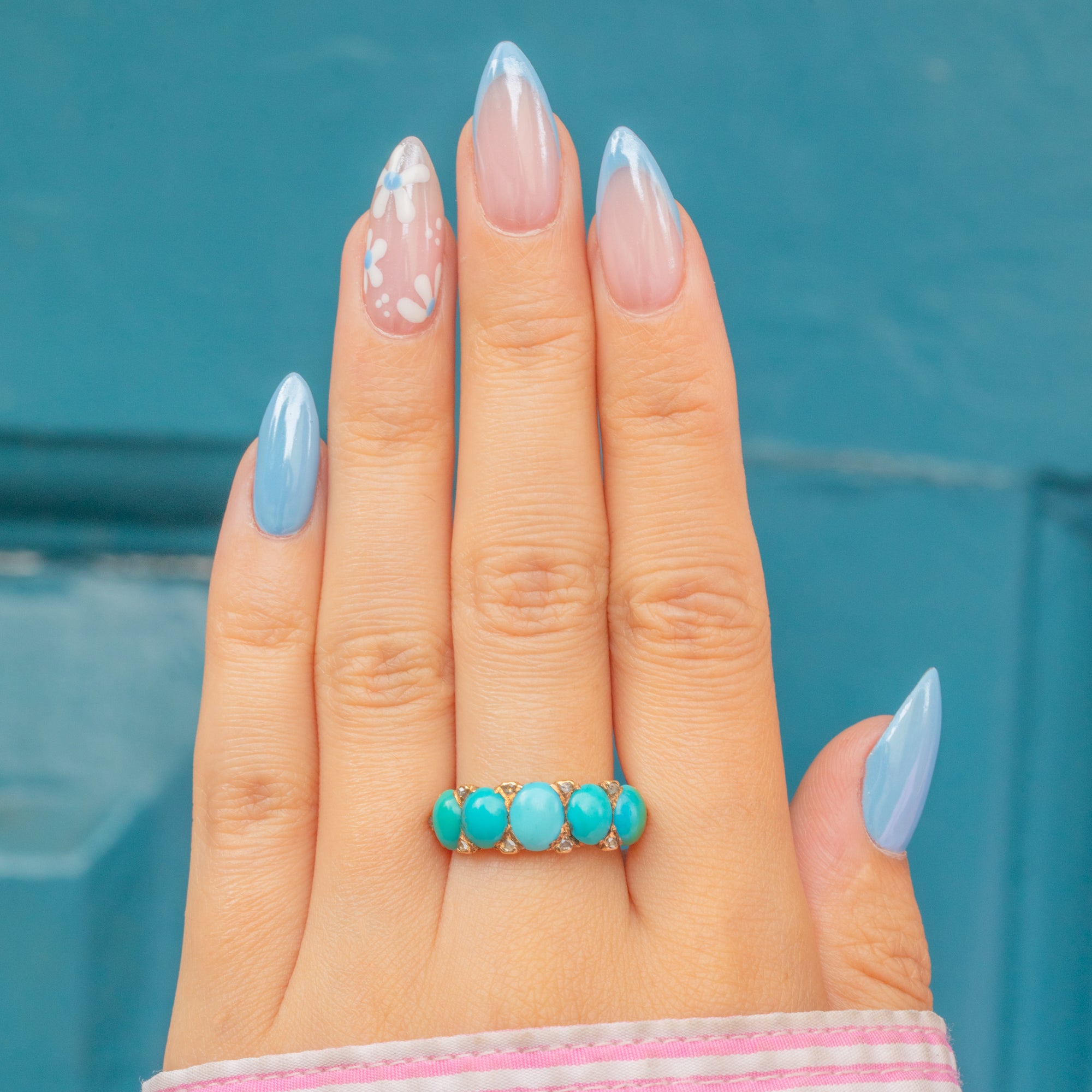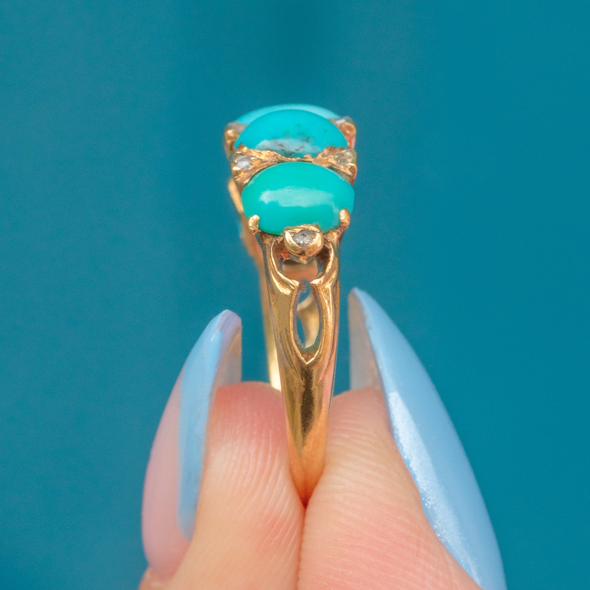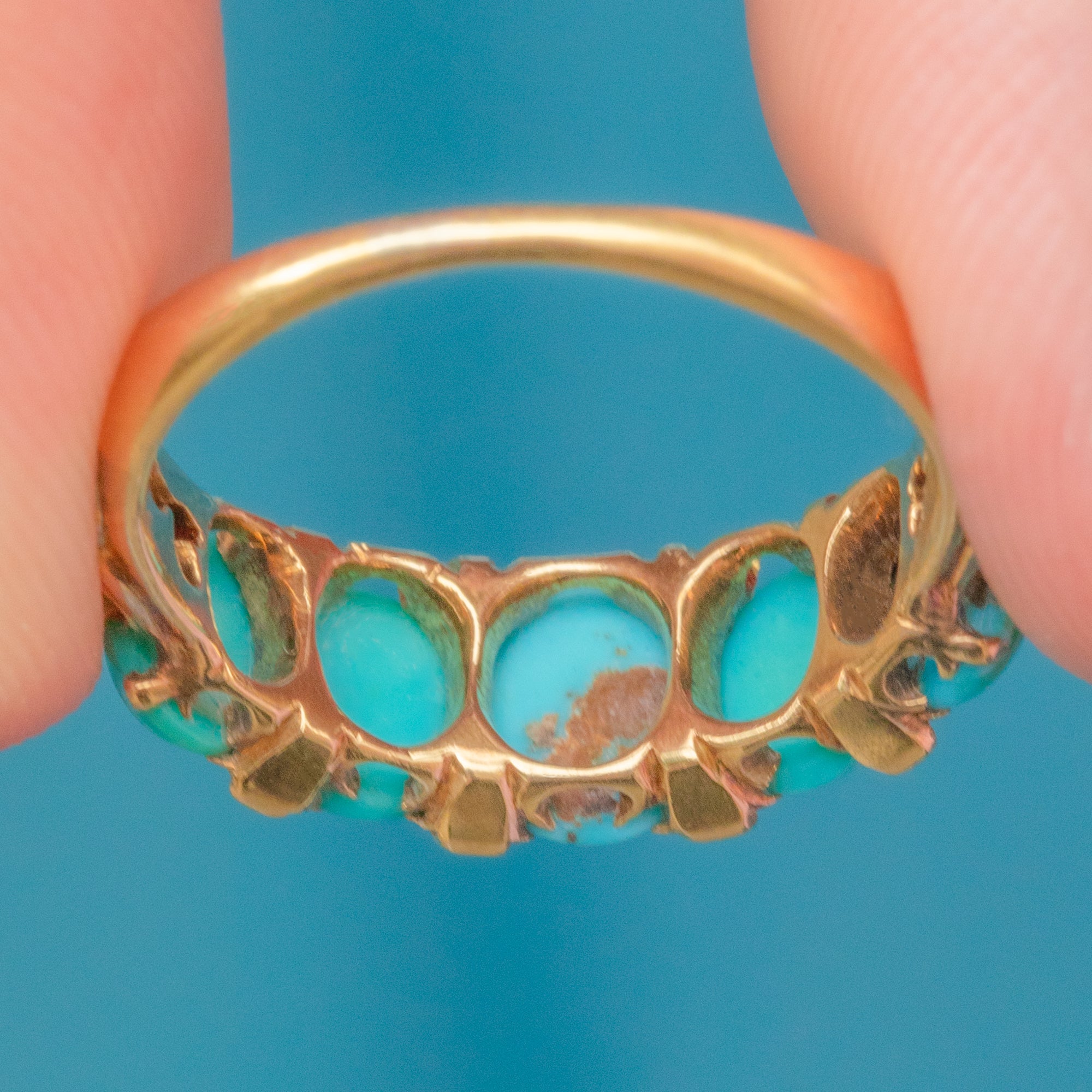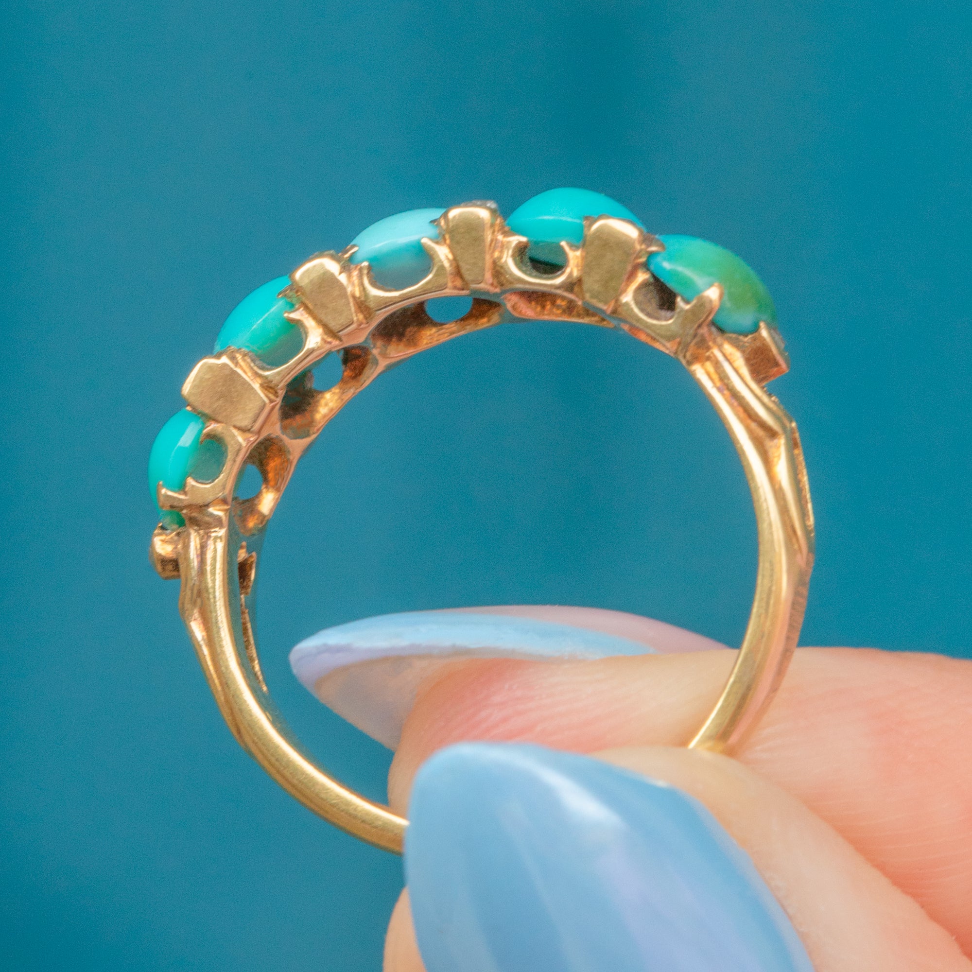 The Turquoise stones are varying hues of highly desirable Robin's egg blue, and make for a fabulous pop of colour, complementing the richness of the 18ct Gold beautifully.