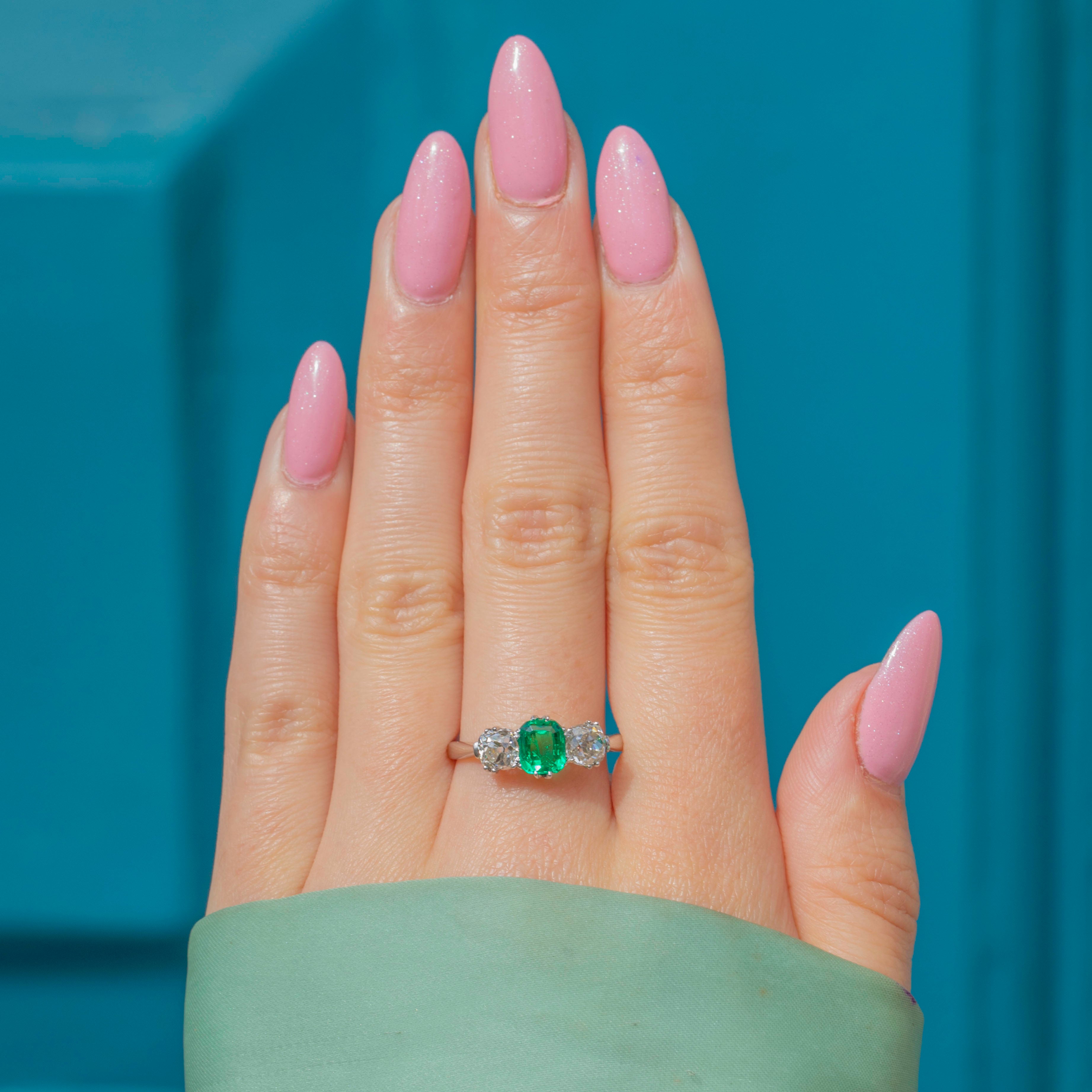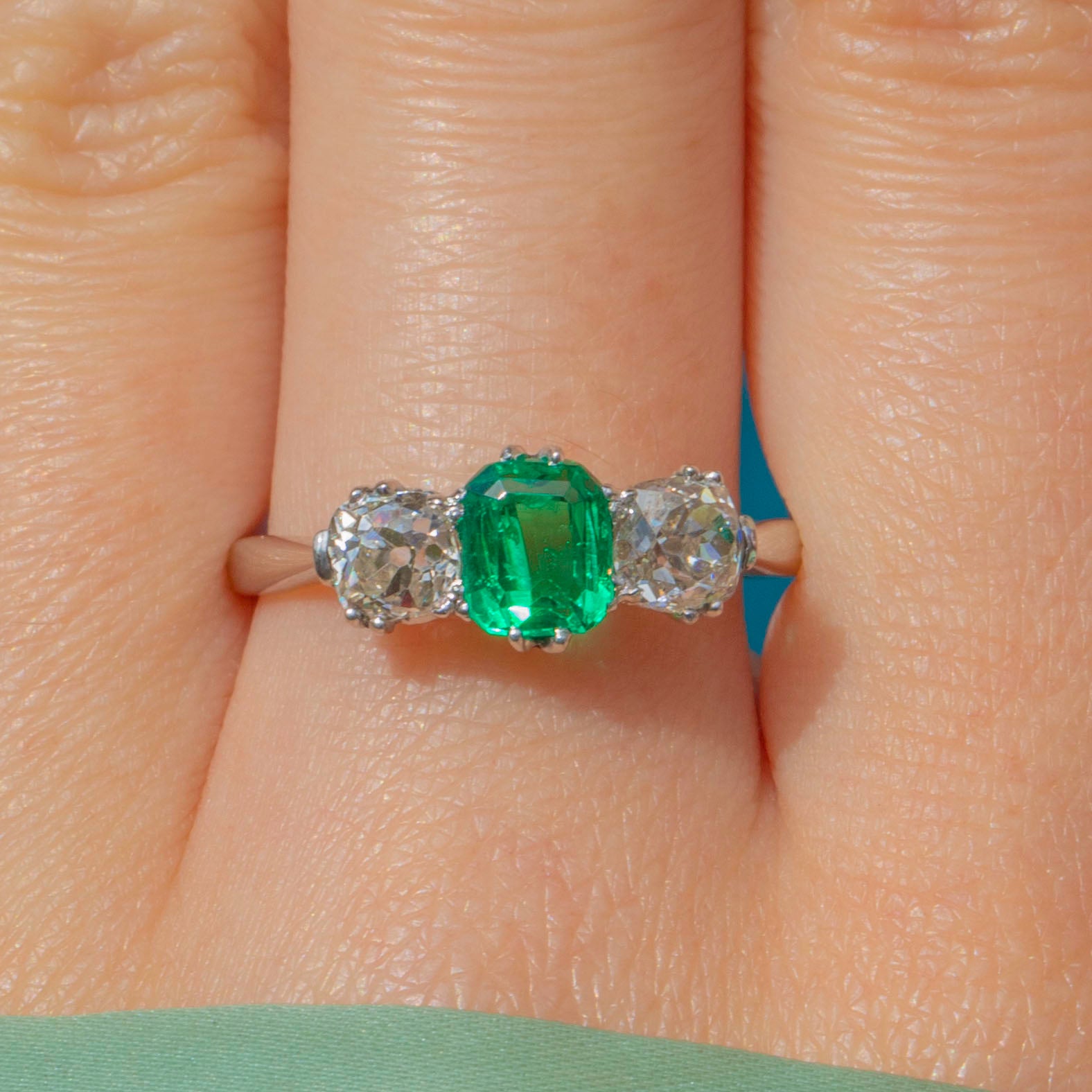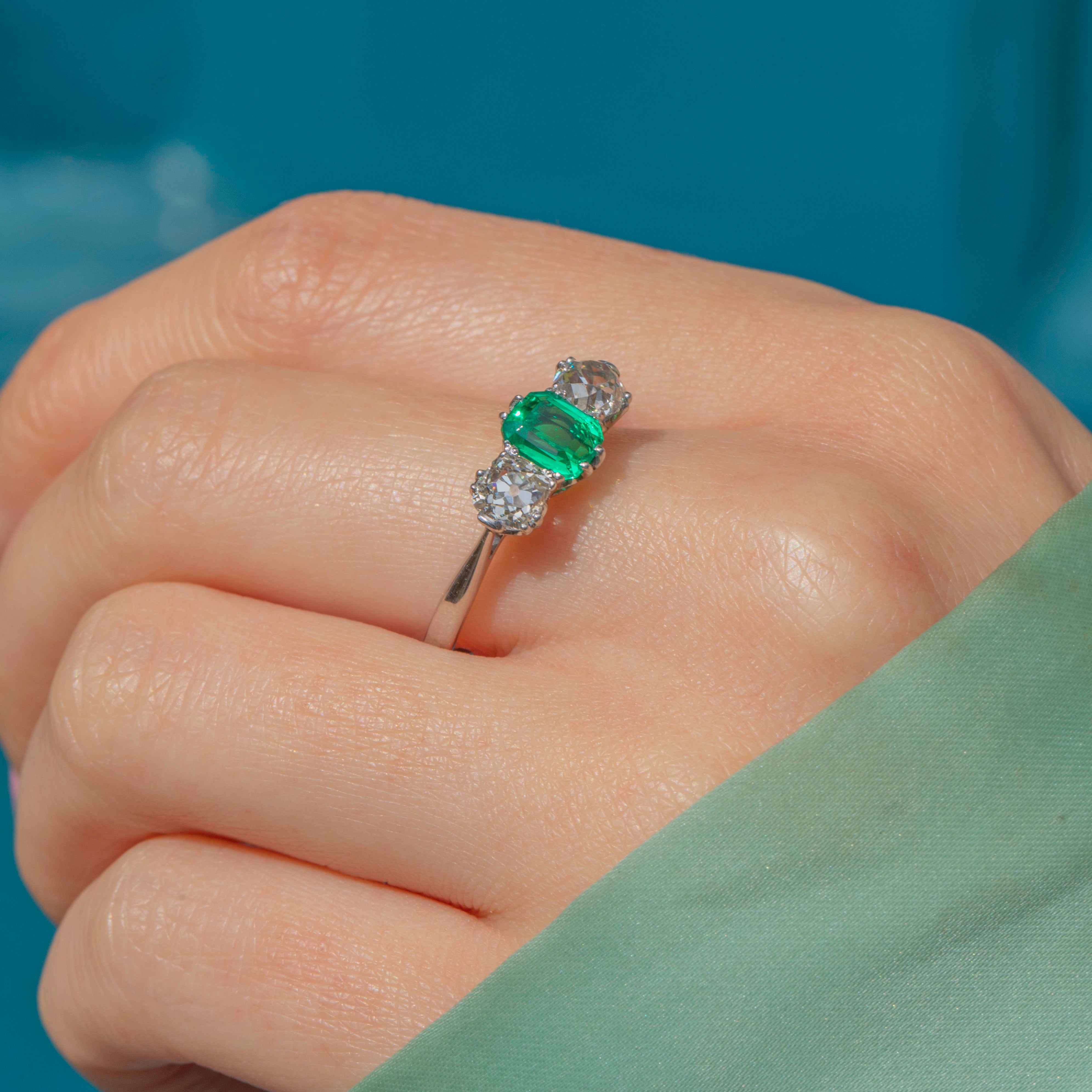 Antique 18ct White Gold Emerald Diamond Trilogy Ring, 0.80ct Old Mine Cut Diamonds Item added