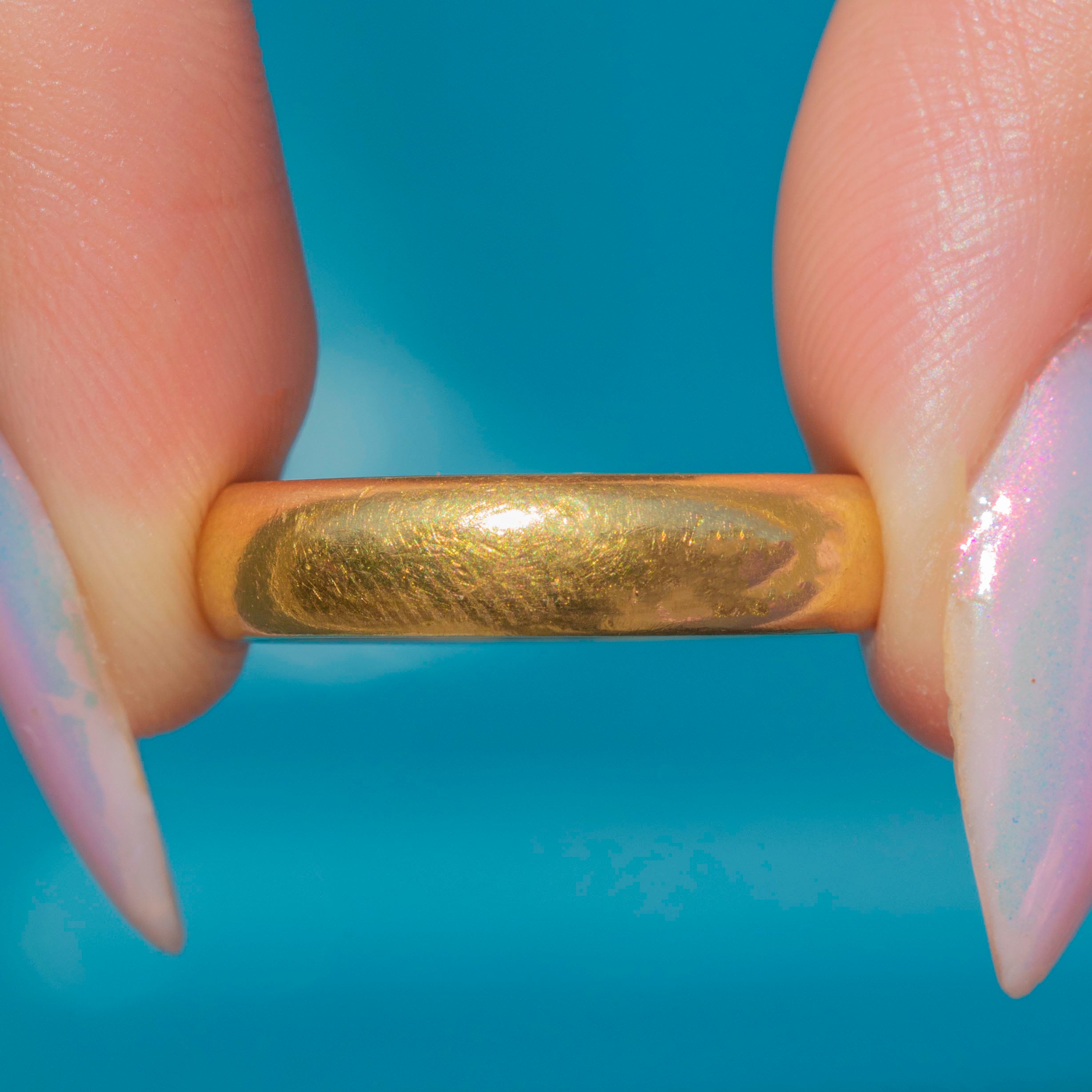 With a sleek finish, this early 20th-century wedding ring radiates a gorgeous buttery warmth from her glossy 4.5mm band. Fully hallmarked and dated to 1919, this wedding band awaits the honour of gracing the finger of someone special on their momentous day, or could equally be enjoyed as an everyday piece, bringing a slice of antique luxury to the hand!