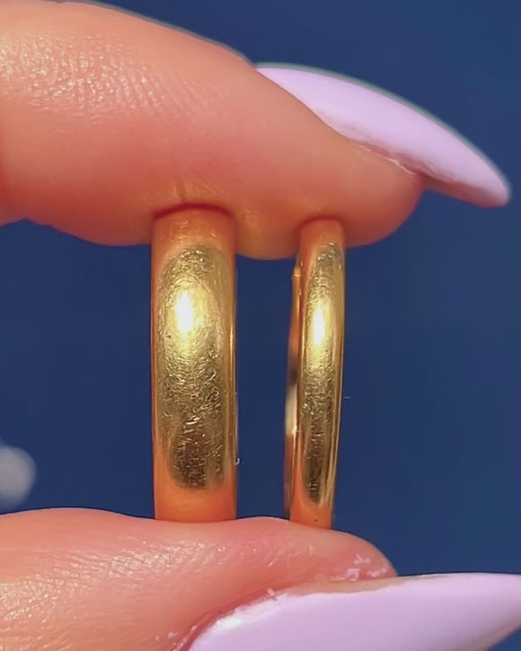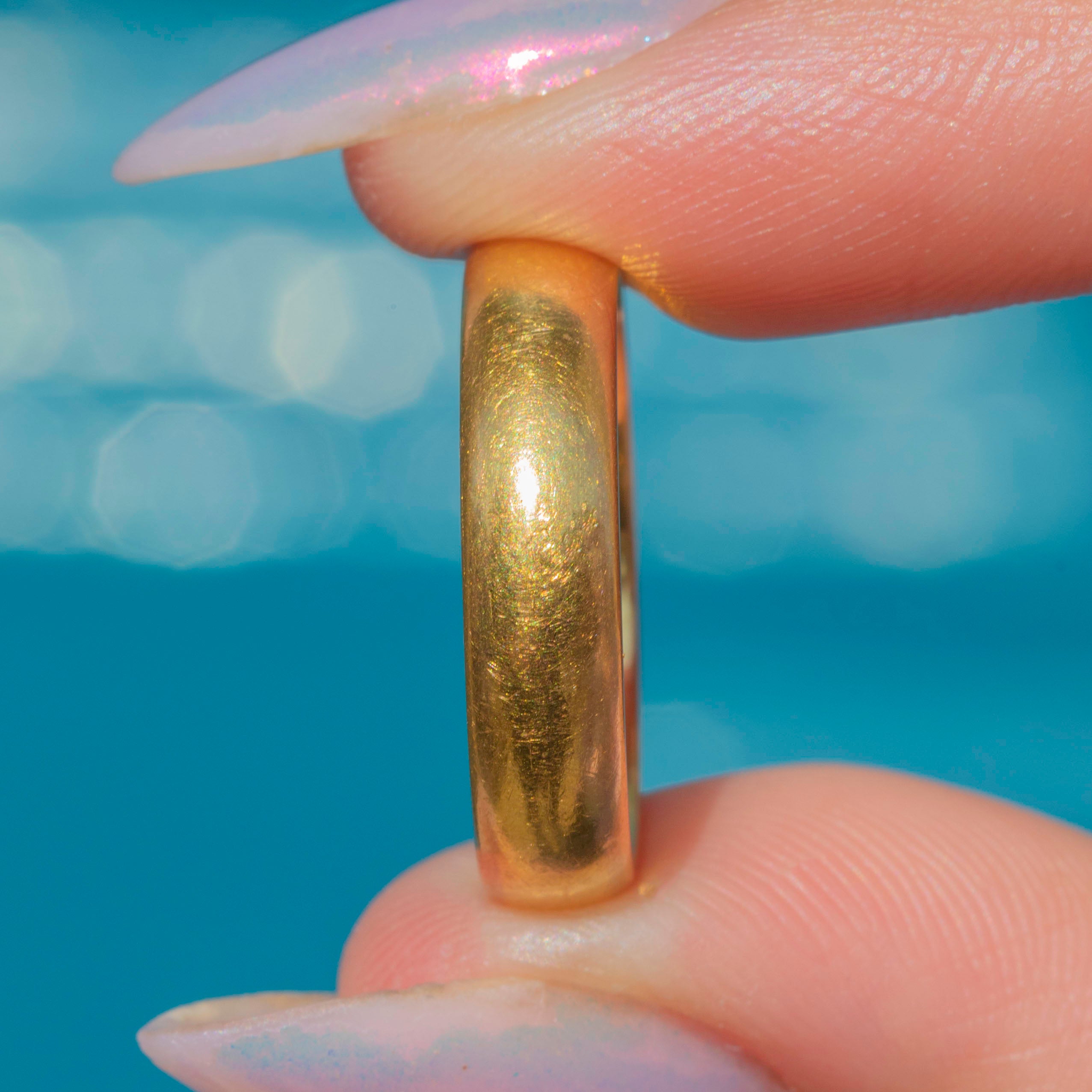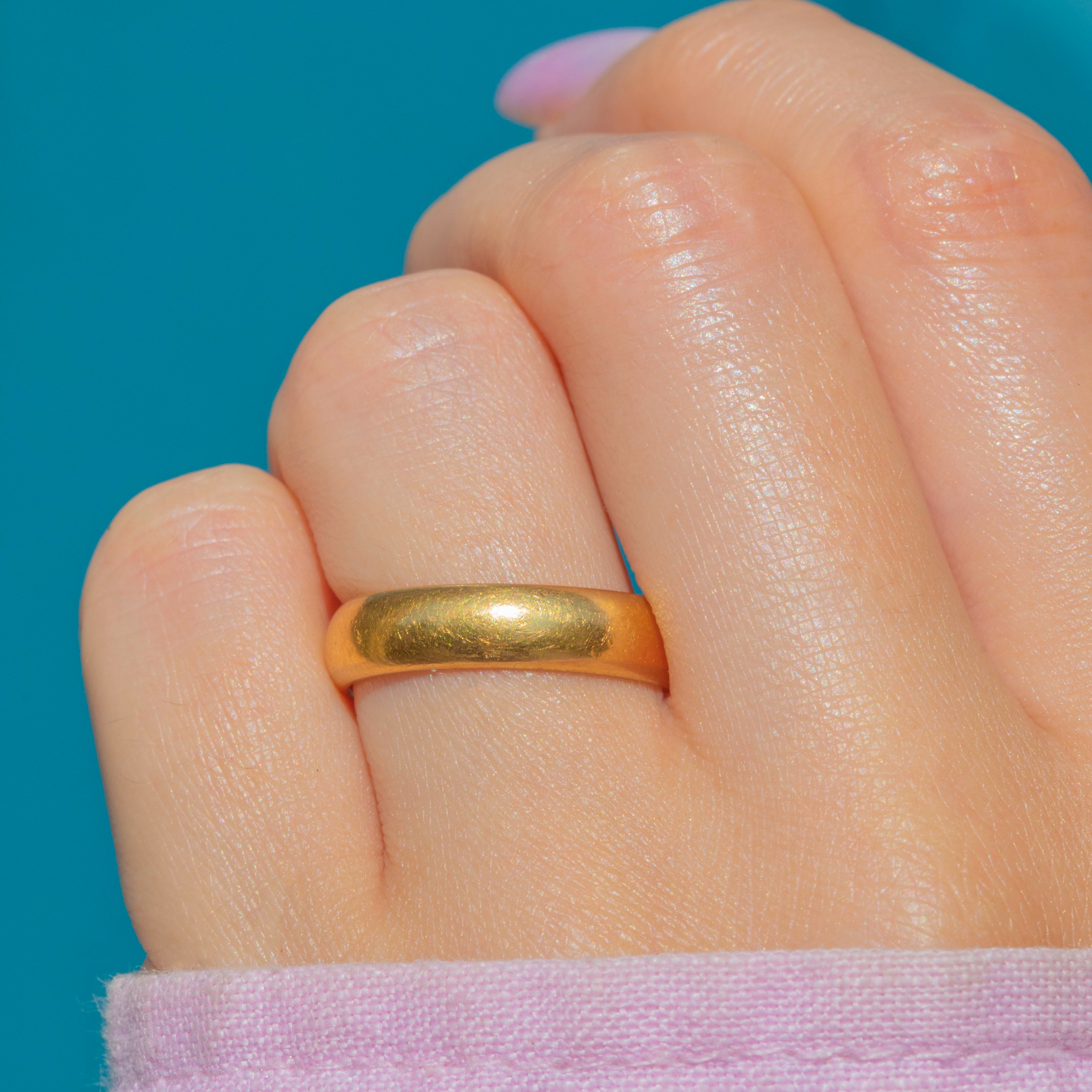 VERY GOOD-EXCELLENT: This wedding band is sleek and glossy, providing a comfortable wear and radiating an undeniable buttery warmth. There is some minor surface wear present, which is expected with age and difficult to spot without a loupe. Sturdy and solid 22ct Gold, this antique ring can be worn with confidence and comfort.