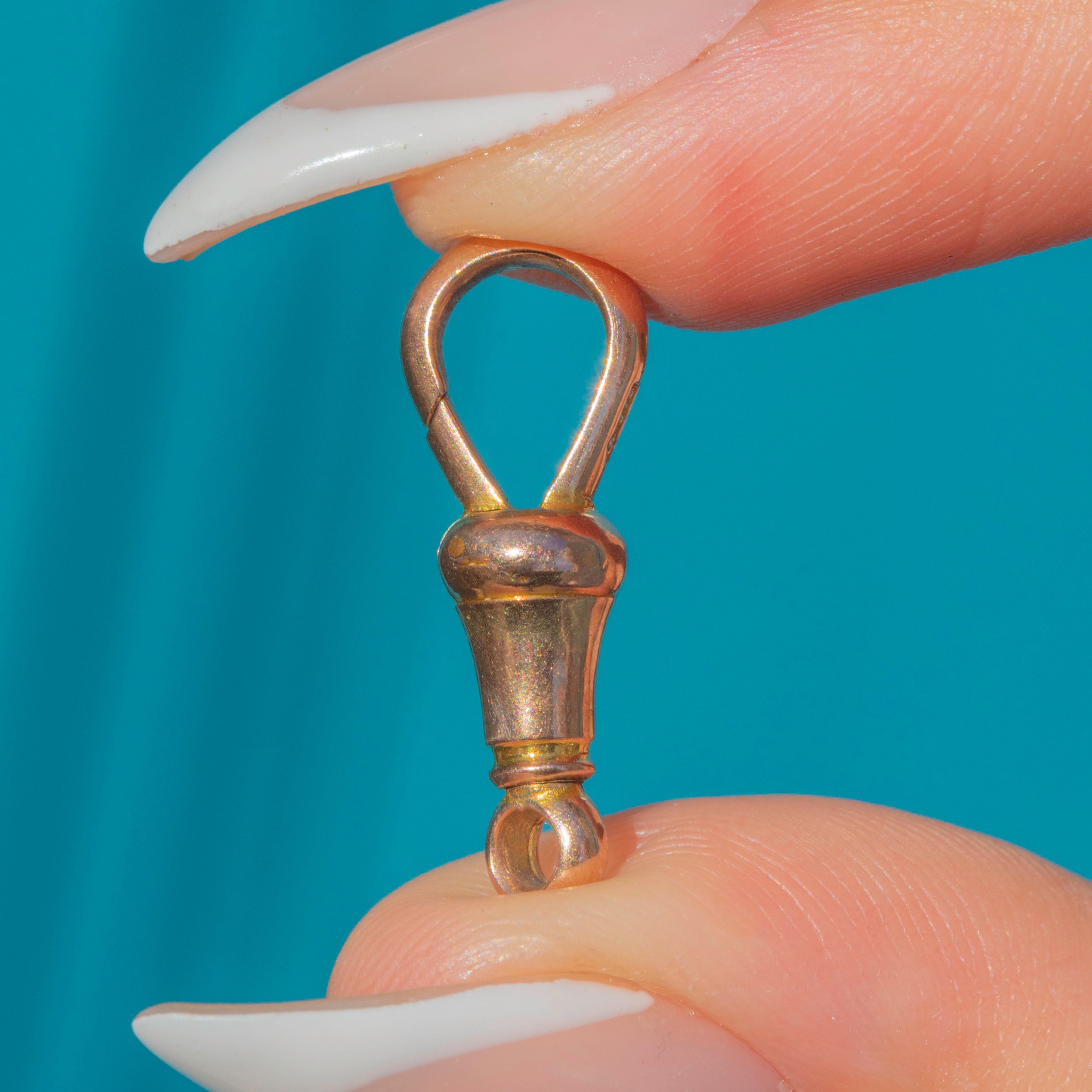This Antique Victorian dog clip is crafted in rich 9ct Gold, a versatile and highly collectible piece of jewellery history. Whether worn on its own or used to attach charms, fobs, or chains, it adds both function and antique charm to any collection. Its warm Gold tone and timeless design make it a practical yet stylish choice for everyday wear or layering with other antique jewels.