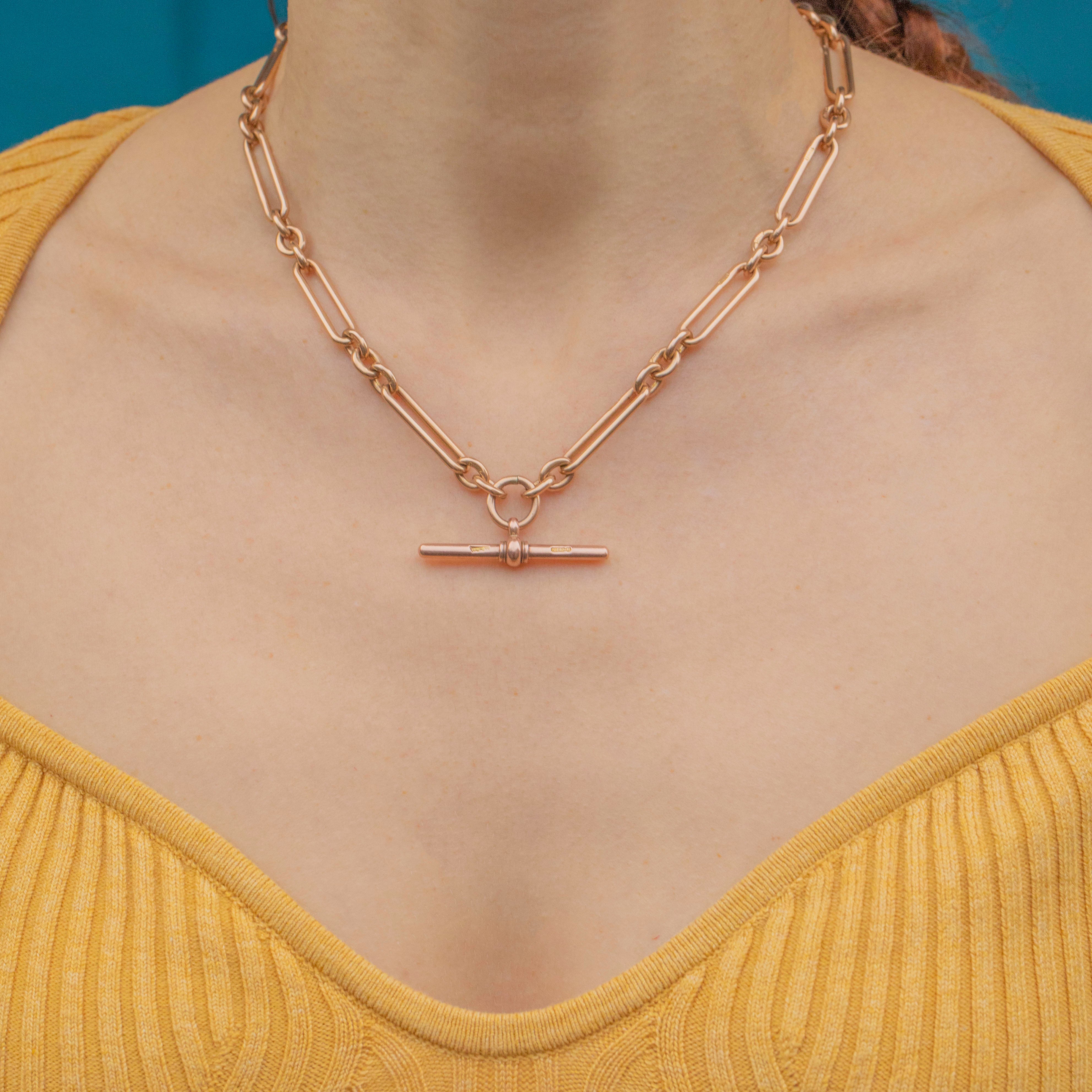 EXCELLENT. This antique 9ct Gold Albert chain with 2x dog-clips is in excellent condition. The links are smooth, the T-Bar is secure and the dog-clips, although one is slightly larger than the other, allow you to wear this chain with confidence.