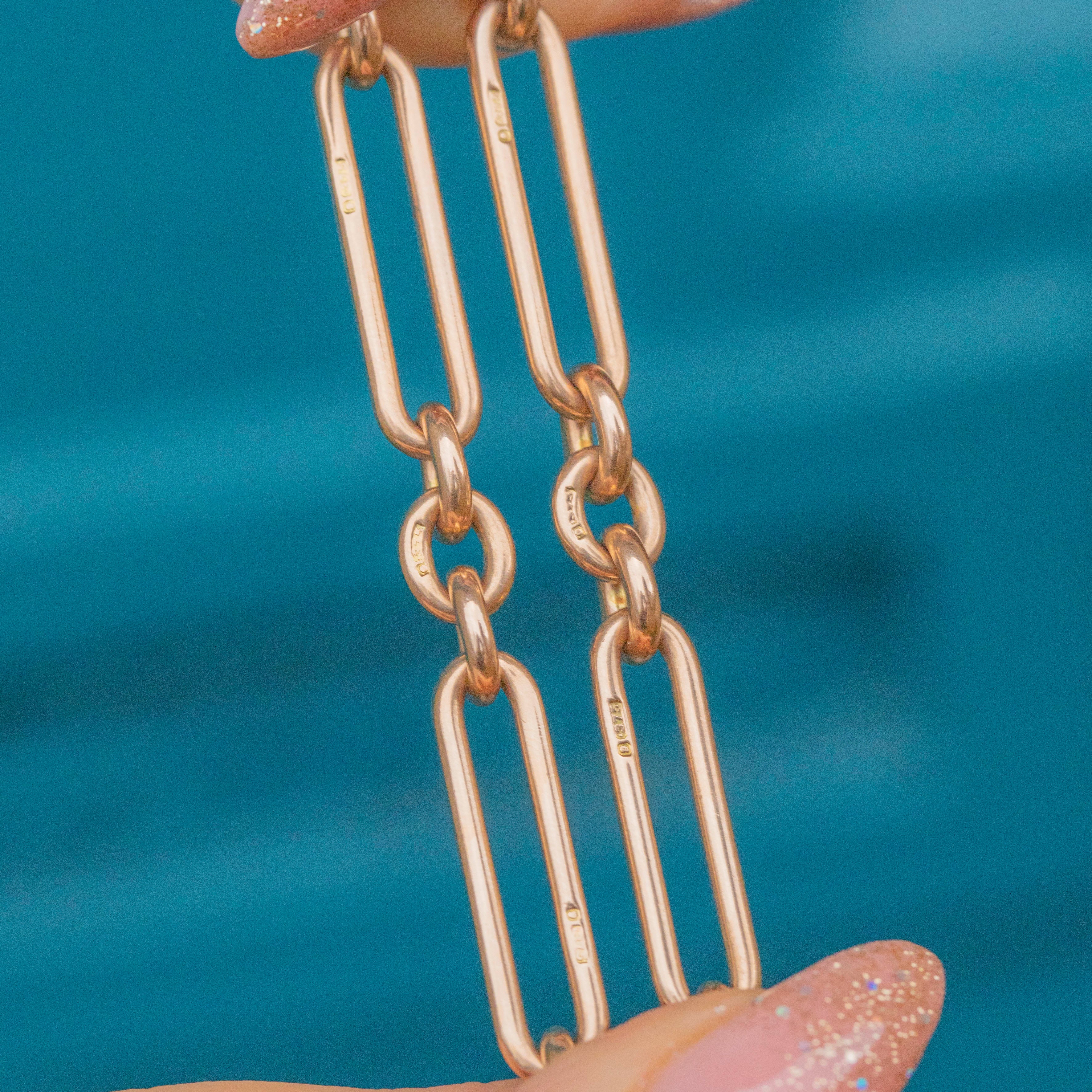 This antique 9ct Gold Albert chain is absolutely gorgeous; 42g of solid 9ct Gold has been made into sleek trombone links, a T-Bar and 2 dog-clips with every link stamped.